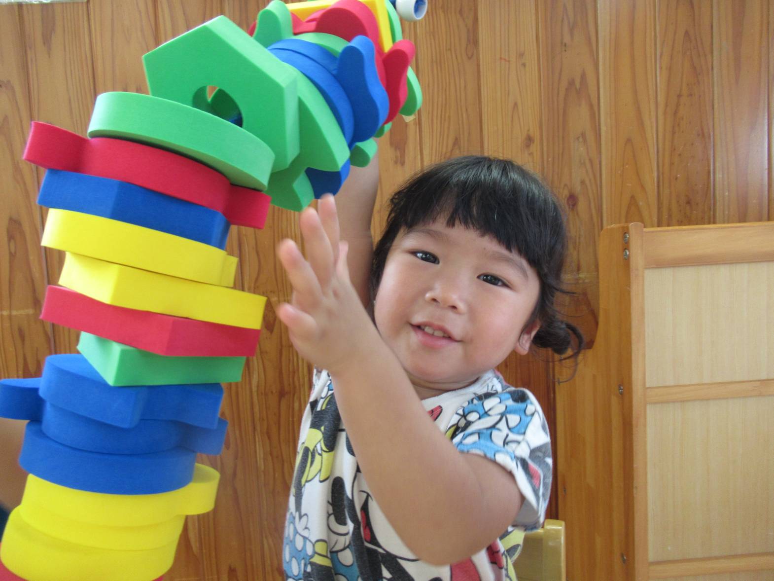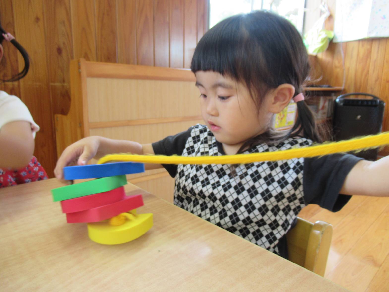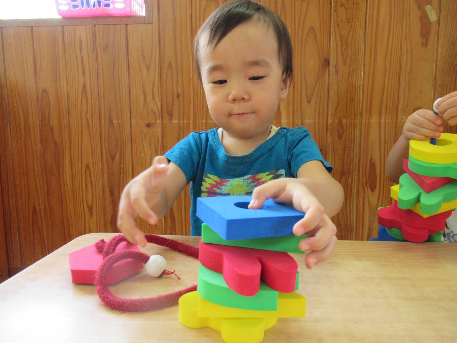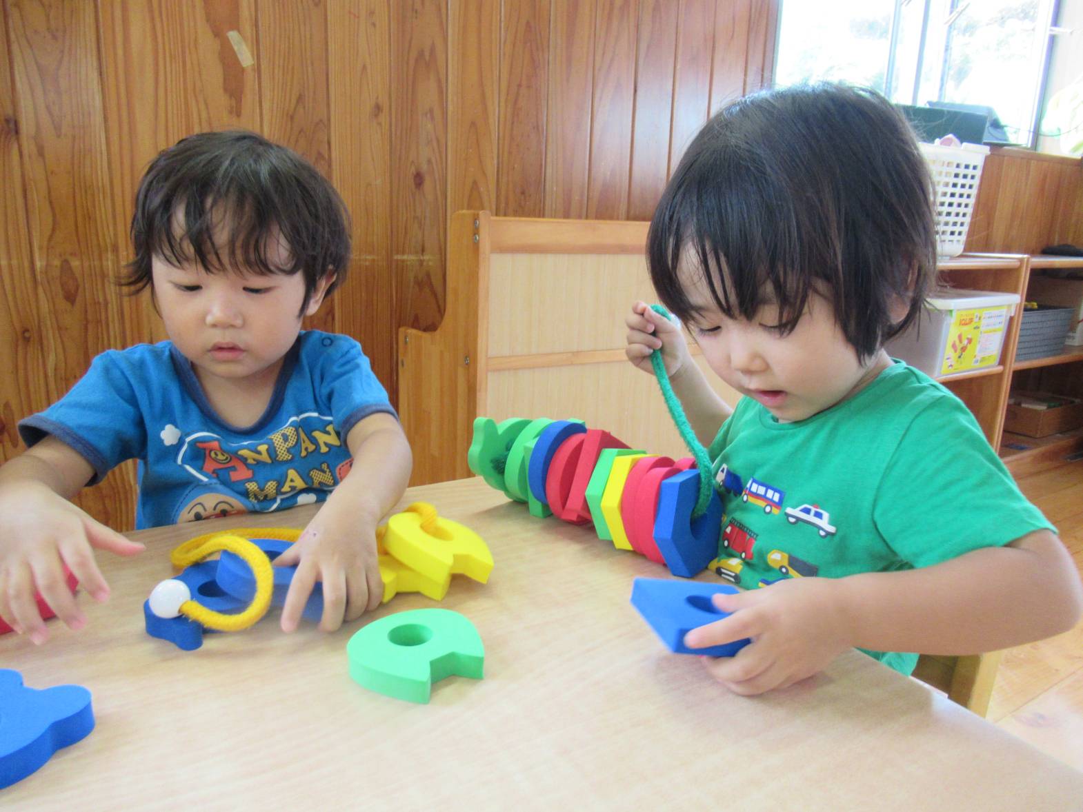 机上遊びでは、ひも通しを定期的に取り組んでいます。 「見て!たくさんできたよ!」と色々な形の穴の開いたパーツにひもを通していく子どもたち。 色々な形のパーツがあるため、組み合わせたり、積み重ねたりと一つの玩具から様々な遊び方を楽しんでいます。 また、「赤集める!」、「うさぎの形だね!」と色や形にも興味を示している様子が見られます。遊びを通して、色や形の知識も身に付けていけたらと思います。