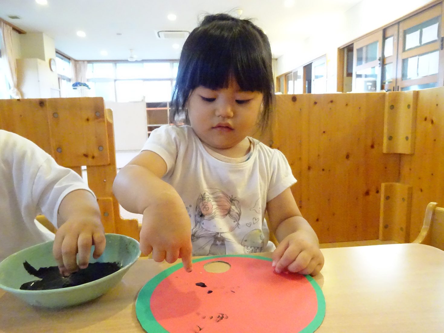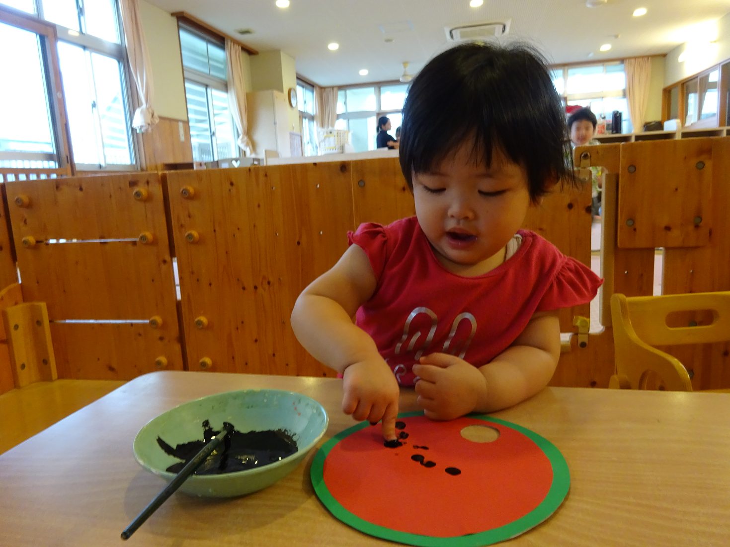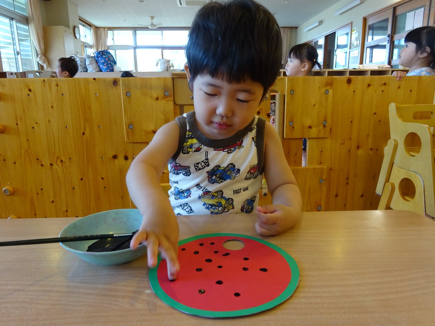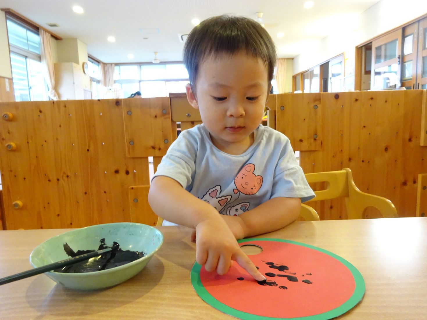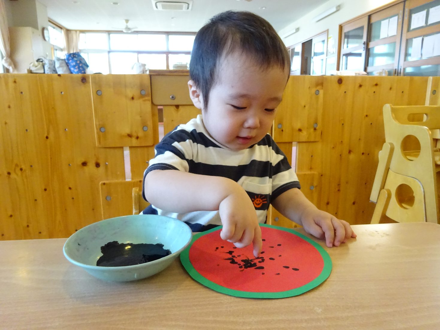 7月はすいかのうちわ製作を行いました。 「すいかぺったんしよう。」と声をかけると「うん!」とわくわくした様子の子どもたち。 黒い絵の具を見ると少し不安そうな表情も見られましたが、保育者が「ちょんちょんだよ。」と指に付ける姿を見ると安心した様子で絵の具に触れる姿がありました。 「ちょんちょんぺたっ!」と指スタンプで上手にすいかの種をつくる子どもたち。 完成したうちわを見ると「すいか!」と満足気な様子のこあら組さんでした。