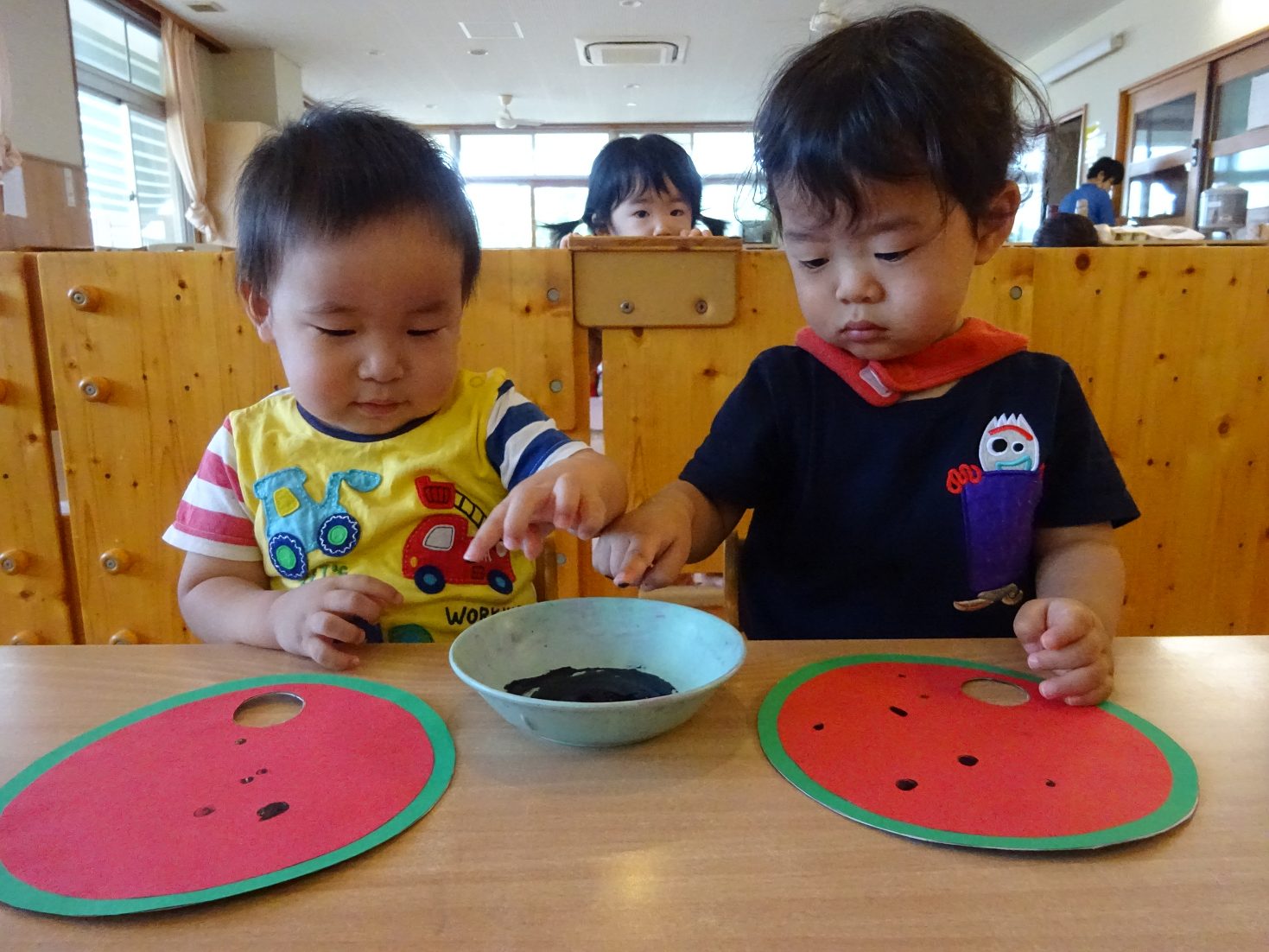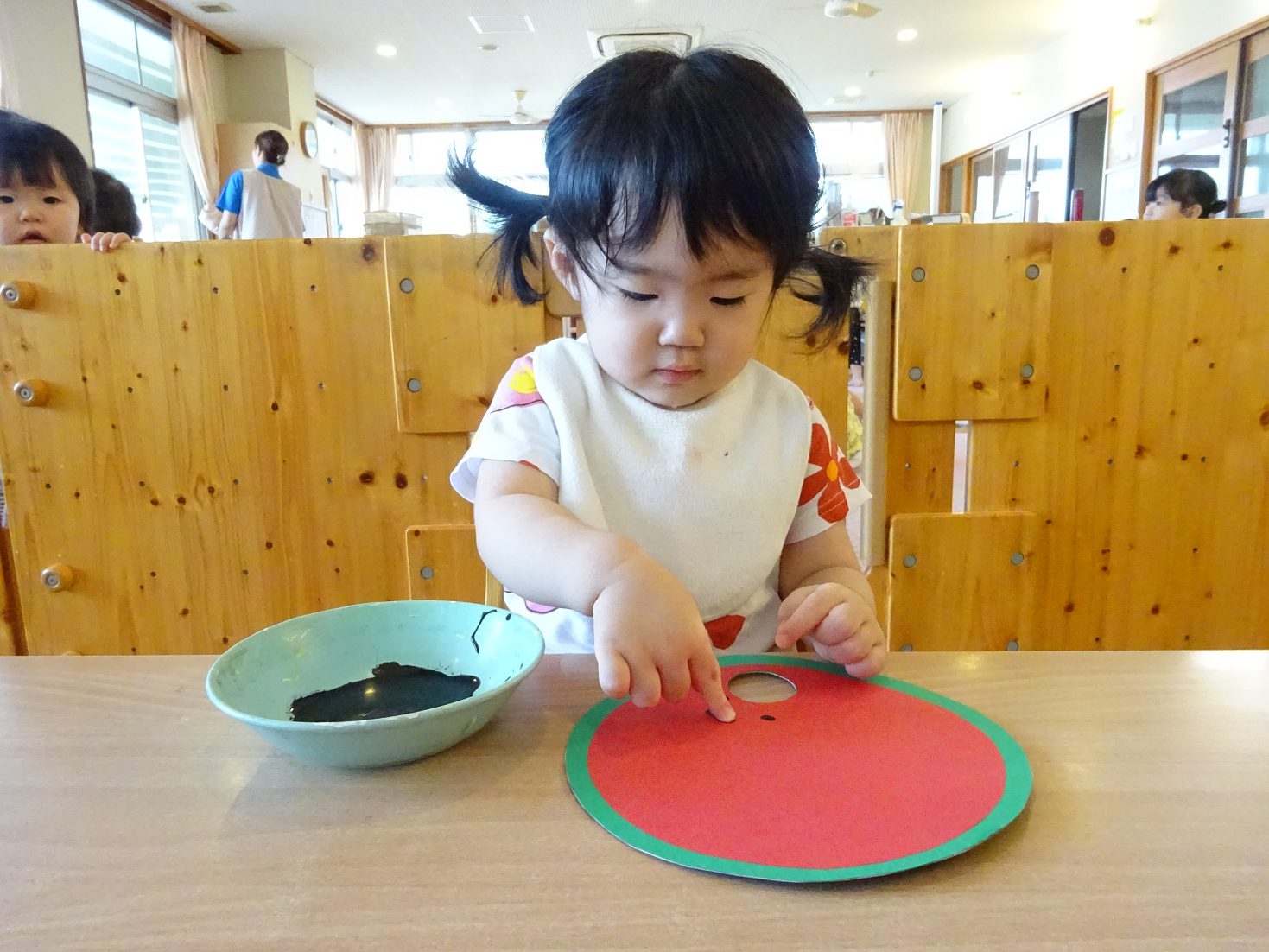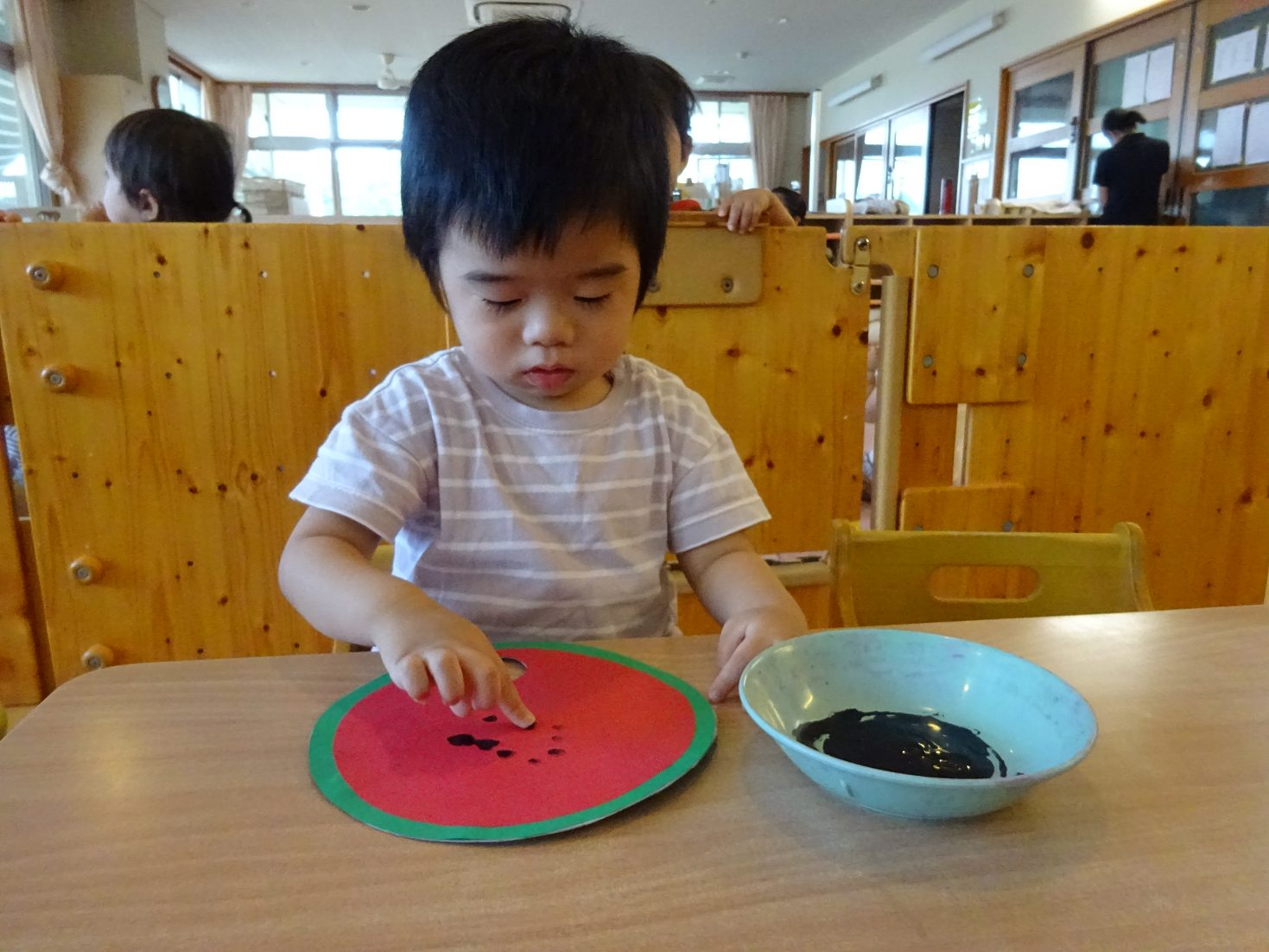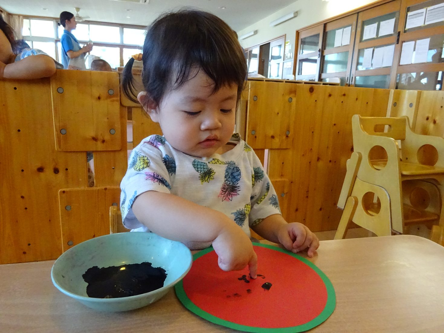 7月はすいかのうちわ製作を行いました。 「すいかぺったんしよう。」と声をかけると「うん!」とわくわくした様子の子どもたち。 黒い絵の具を見ると少し不安そうな表情も見られましたが、保育者が「ちょんちょんだよ。」と指に付ける姿を見ると安心した様子で絵の具に触れる姿がありました。 「ちょんちょんぺたっ!」と指スタンプで上手にすいかの種をつくる子どもたち。 完成したうちわを見ると「すいか!」と満足気な様子のこあら組さんでした。