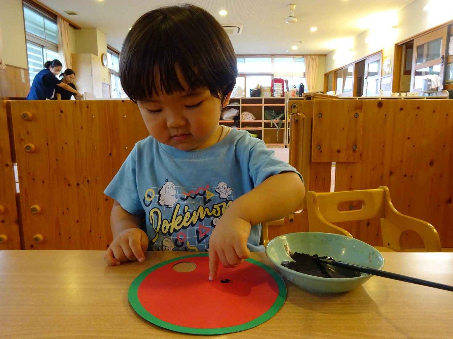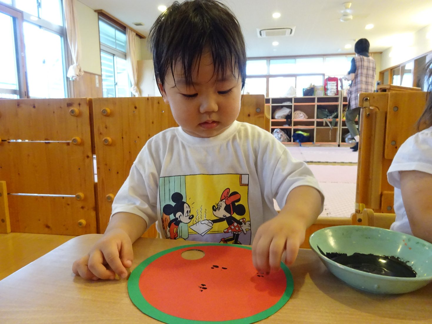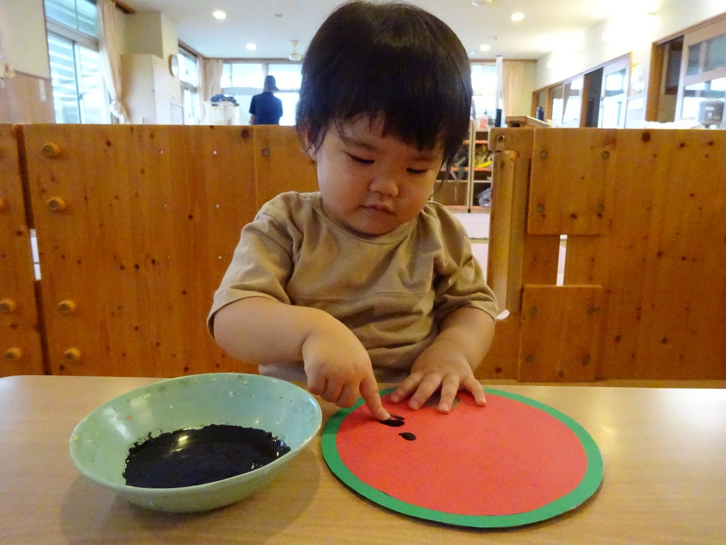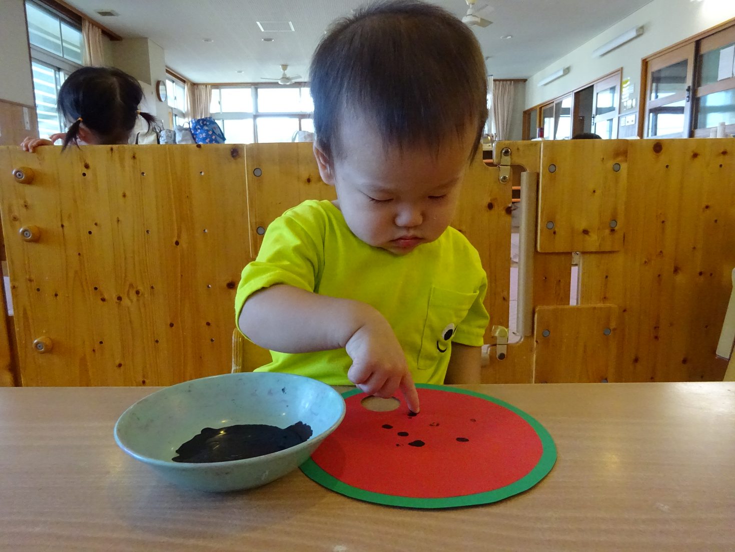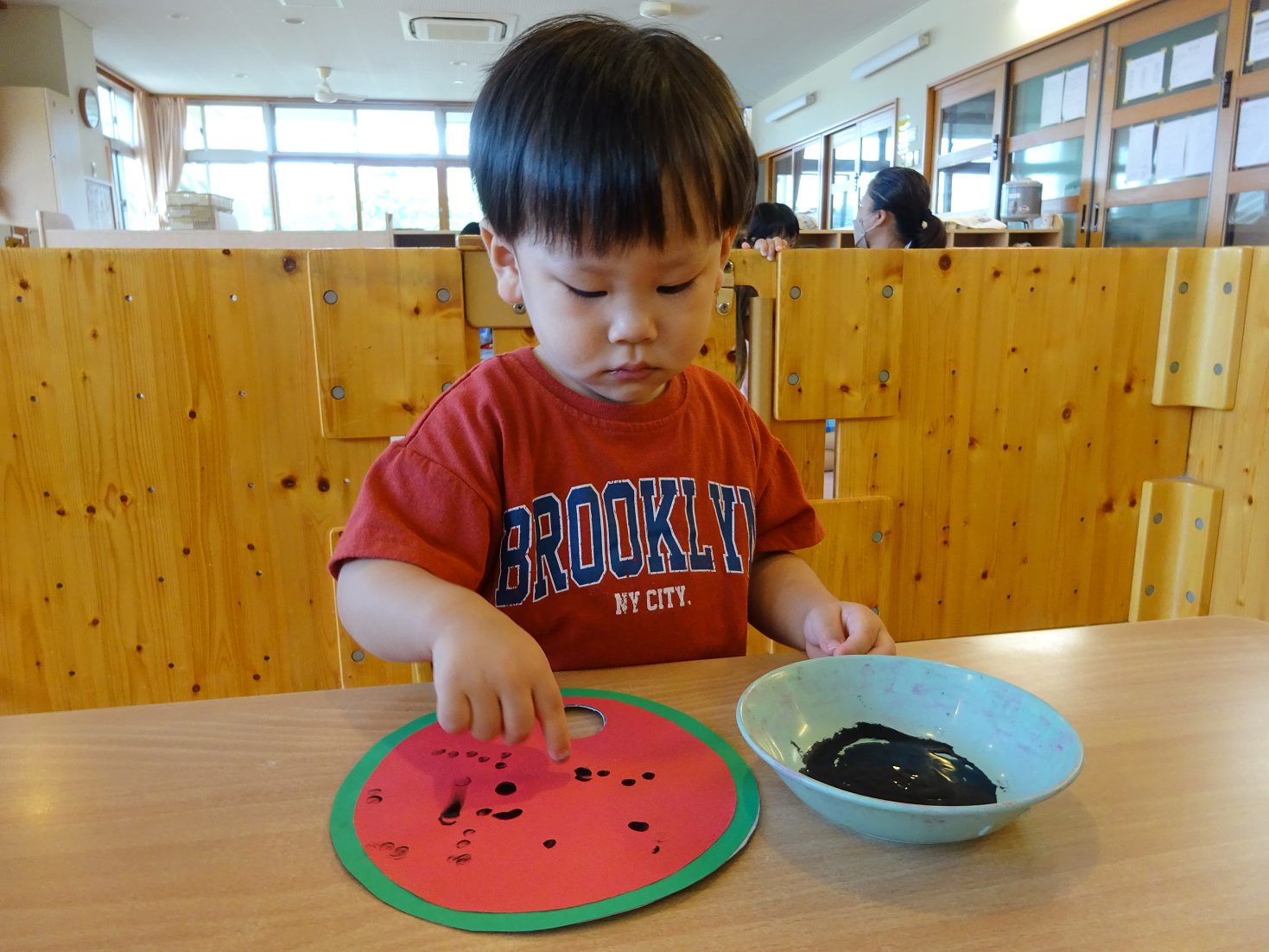 7月はすいかのうちわ製作を行いました。 「すいかぺったんしよう。」と声をかけると「うん!」とわくわくした様子の子どもたち。 黒い絵の具を見ると少し不安そうな表情も見られましたが、保育者が「ちょんちょんだよ。」と指に付ける姿を見ると安心した様子で絵の具に触れる姿がありました。 「ちょんちょんぺたっ!」と指スタンプで上手にすいかの種をつくる子どもたち。 完成したうちわを見ると「すいか!」と満足気な様子のこあら組さんでした。