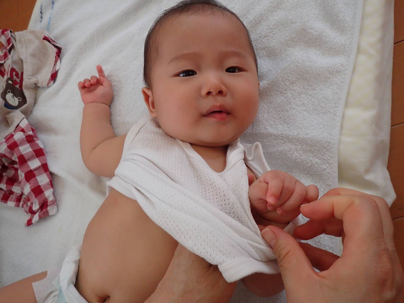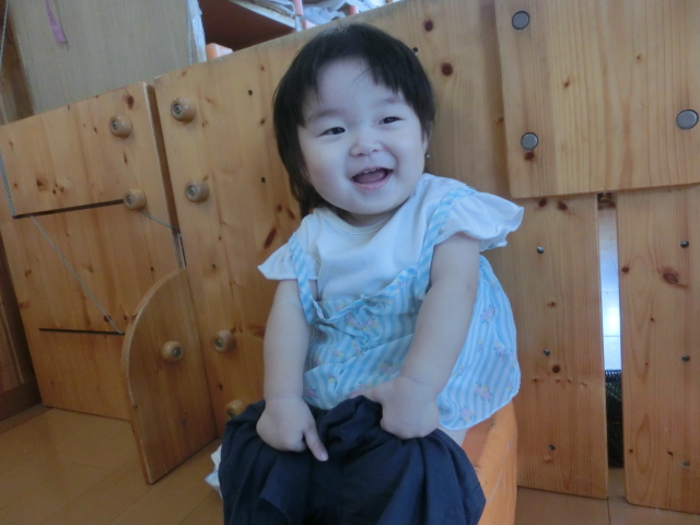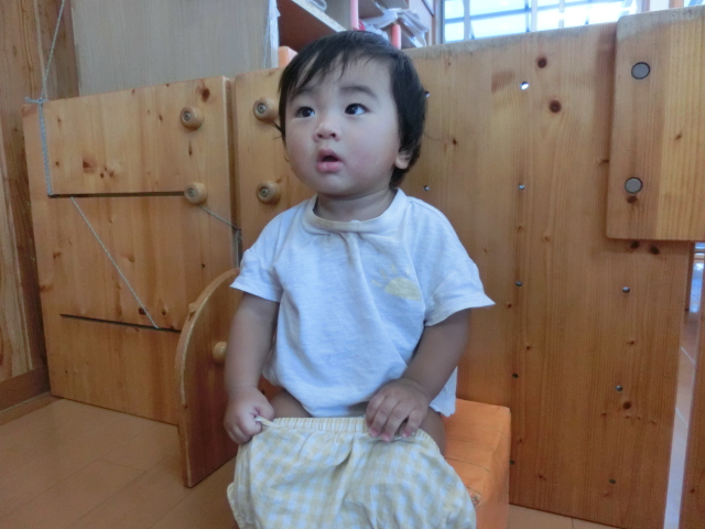 衣服の着脱では、流れを少しずつ覚えてきている子どもたち。 保育者が「もちもちしようね。」、「ぬぎぬぎだよ。」等、言葉を掛けると自分でもシャツやズボンを引っ張ろうとする姿が見られるようになってきました! 褒められると更に意欲が出るようで、“見て見て!”と言わんばかりのいい表情です。 自分でやってみようとする気持ちやできて嬉しい気持ちが少しずつ芽生えてきているひよこ組さんでした。