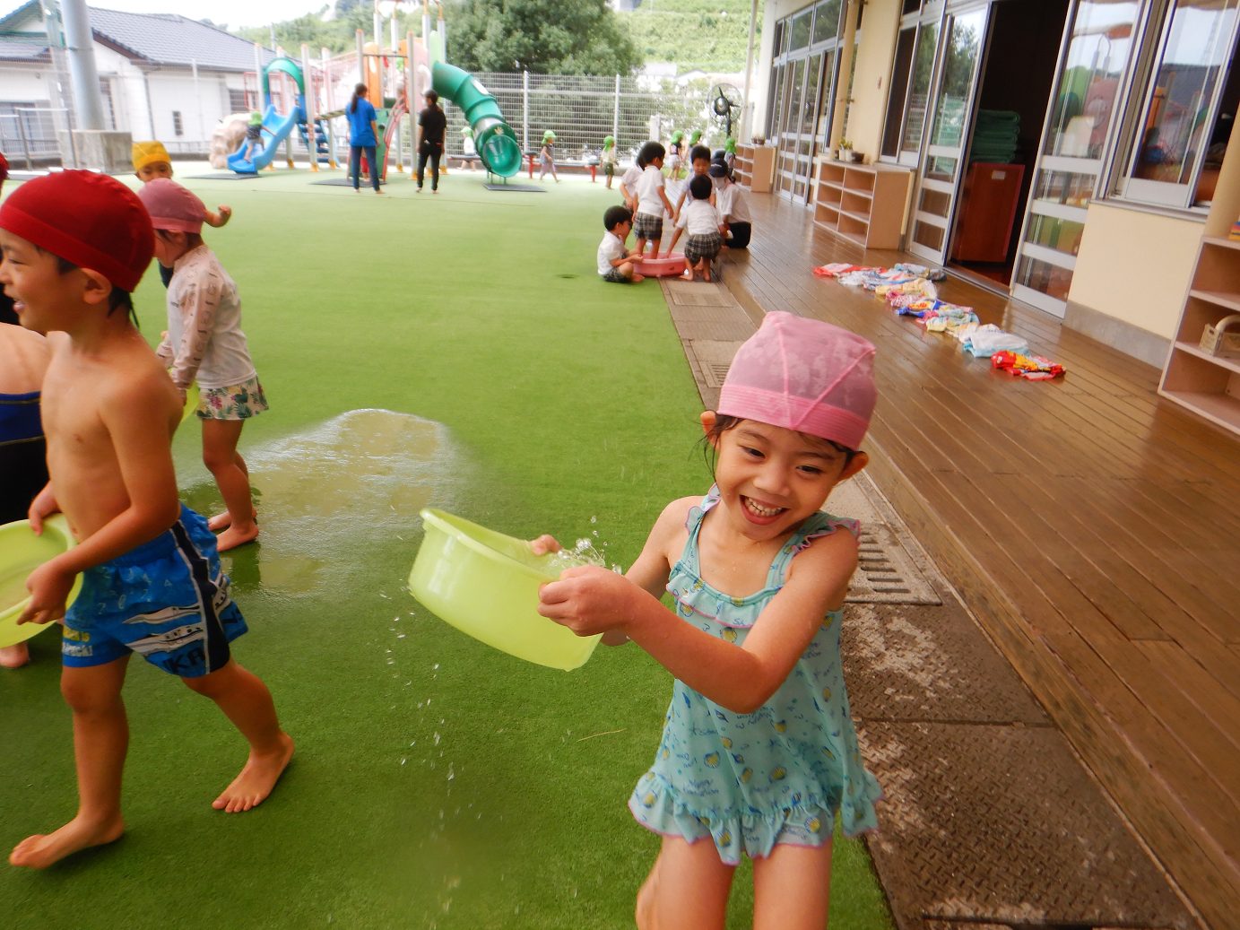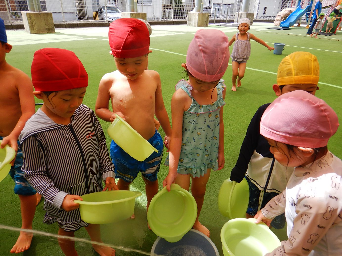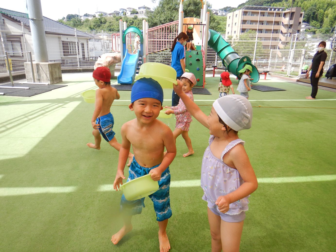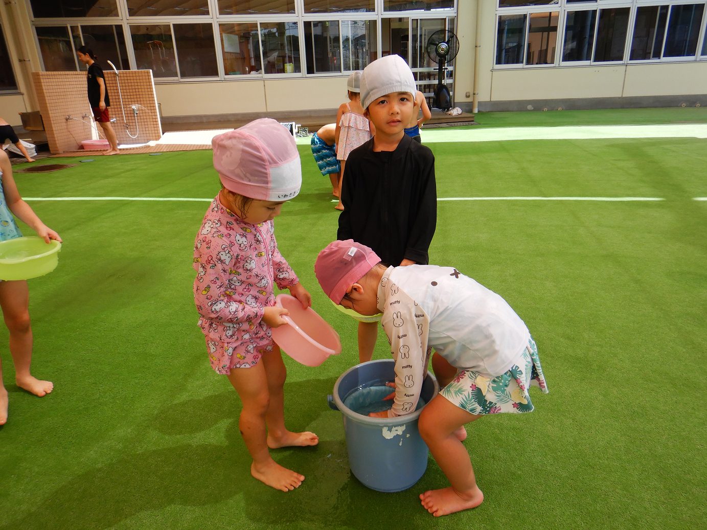 桶や水鉄砲を使って、友だちや先生にたくさん水を掛けます。「たのしぃ~!」「お水冷たくて気持ちいいね!」と大はしゃぎのうさぎ組さん。