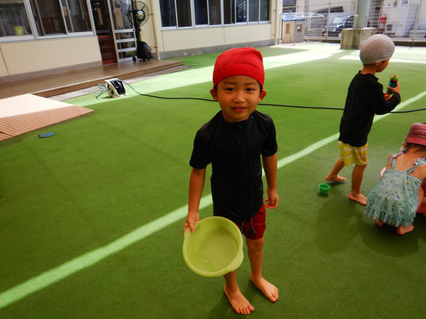 水遊びの時間が終わると「え~もう終わりなの?」「もっと遊びたかったのに!」と少ししょんぼりしながらも「楽しかったね!またしたいな!」とキラキラの笑顔を見せてくれました。