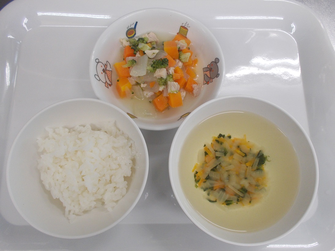 離乳食の写真と提供量の一例です。 ぜひ、ご覧ください。 離乳食(完了期) ご飯:60g (中期⇒おかゆ:100g 後期⇒軟飯30g、ご飯30g) 鶏肉とブロッコリーの煮物:80g 小松菜のスープ:お玉1杯弱(120ml) ご飯:60g (中期⇒おかゆ:100g 後期⇒軟飯30g、ご飯30g) 白身魚とキャベツの煮物:80g 青梗菜のスープ:お玉1杯弱(120ml)