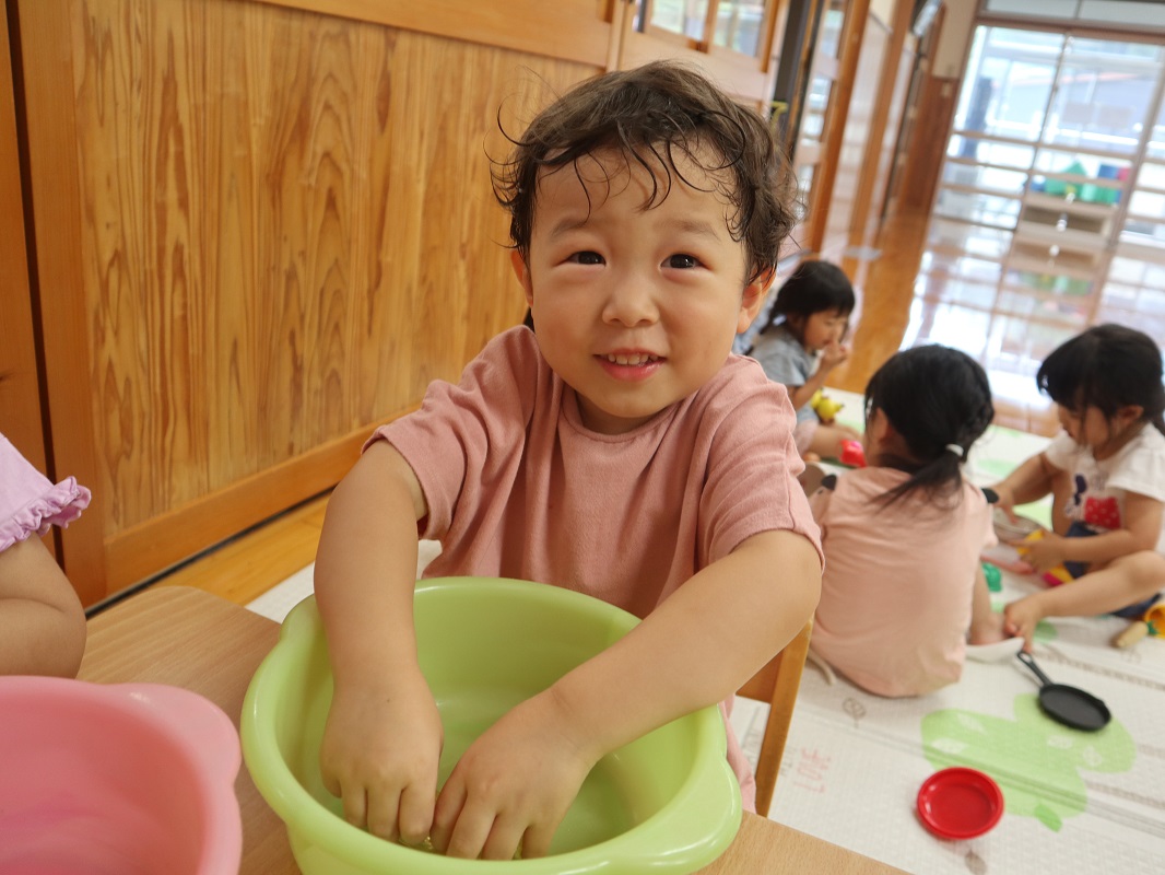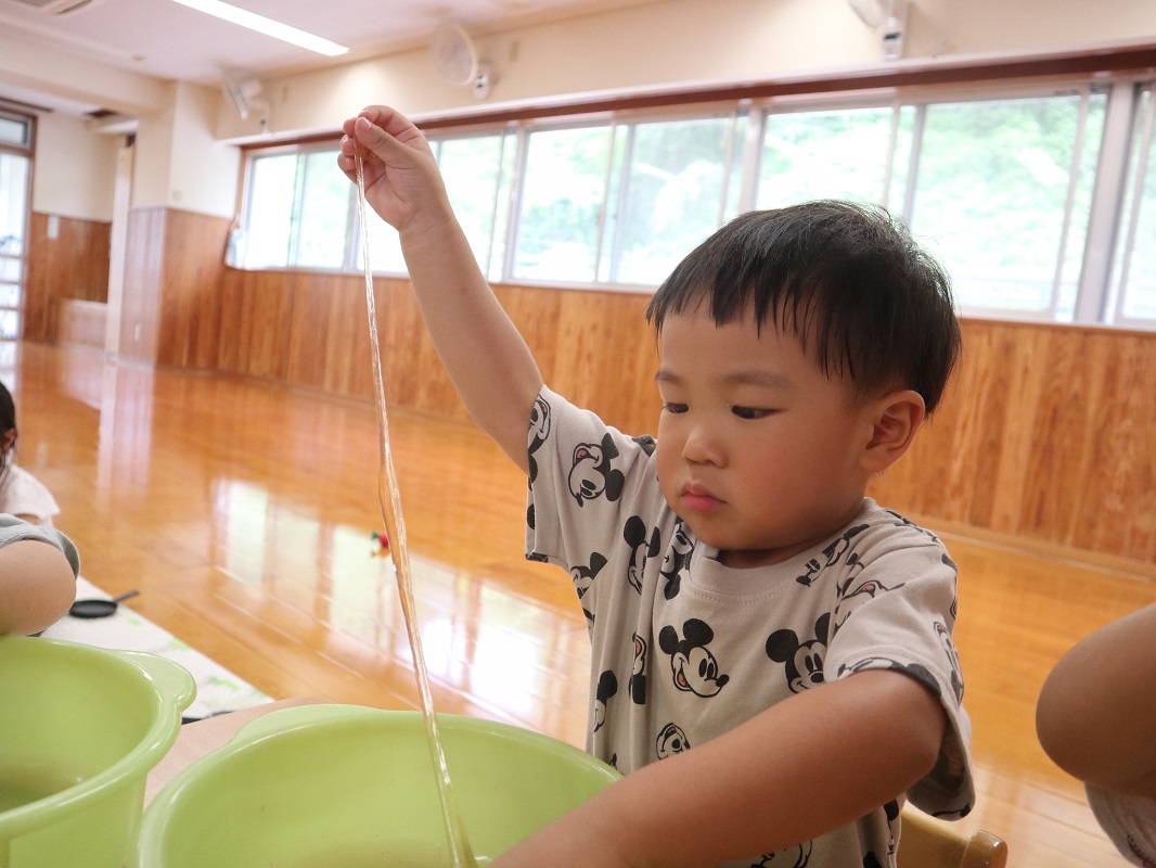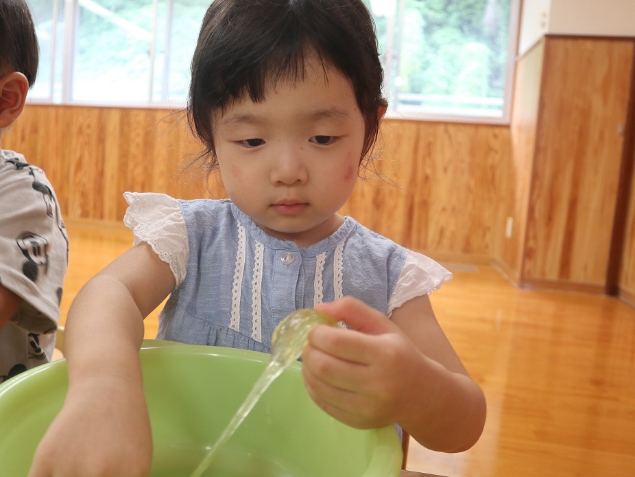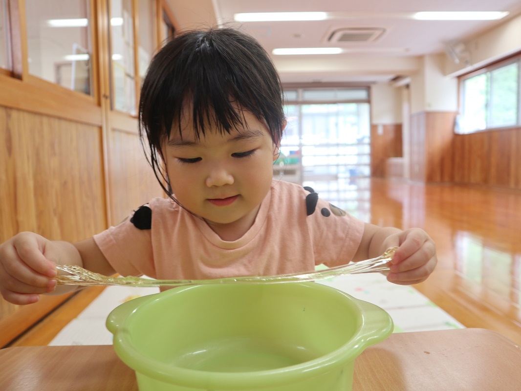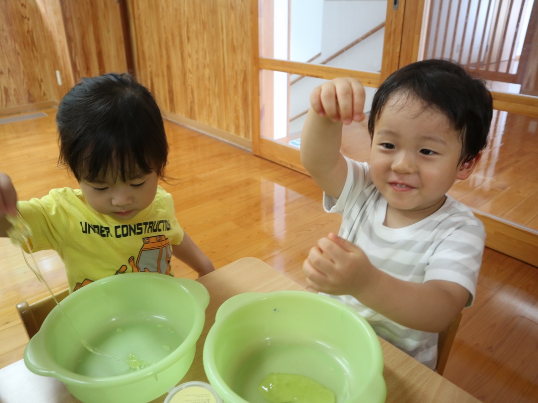 ぱんだ組では、感触遊びの一つとしてスライムを取り入れました。 初めてみる子は「なになに~」と不思議そうにしながらも興味津々です。 指先でちょんちょんと触ってみると少しひんやり。 柔らかくて色んな形に変えられるので、子どもたちも夢中になって遊んでいます。 「みてみて伸びたよ!」「小さくしたよ!」と大興奮の子どもたち。 スライムを伸ばしたり、ちぎったり、両手で力を込めてギュっと握って感触を楽しんだりする姿が見られました。 今後も、様々な感触遊びを子どもたちと一緒に楽しみたいと思います!
