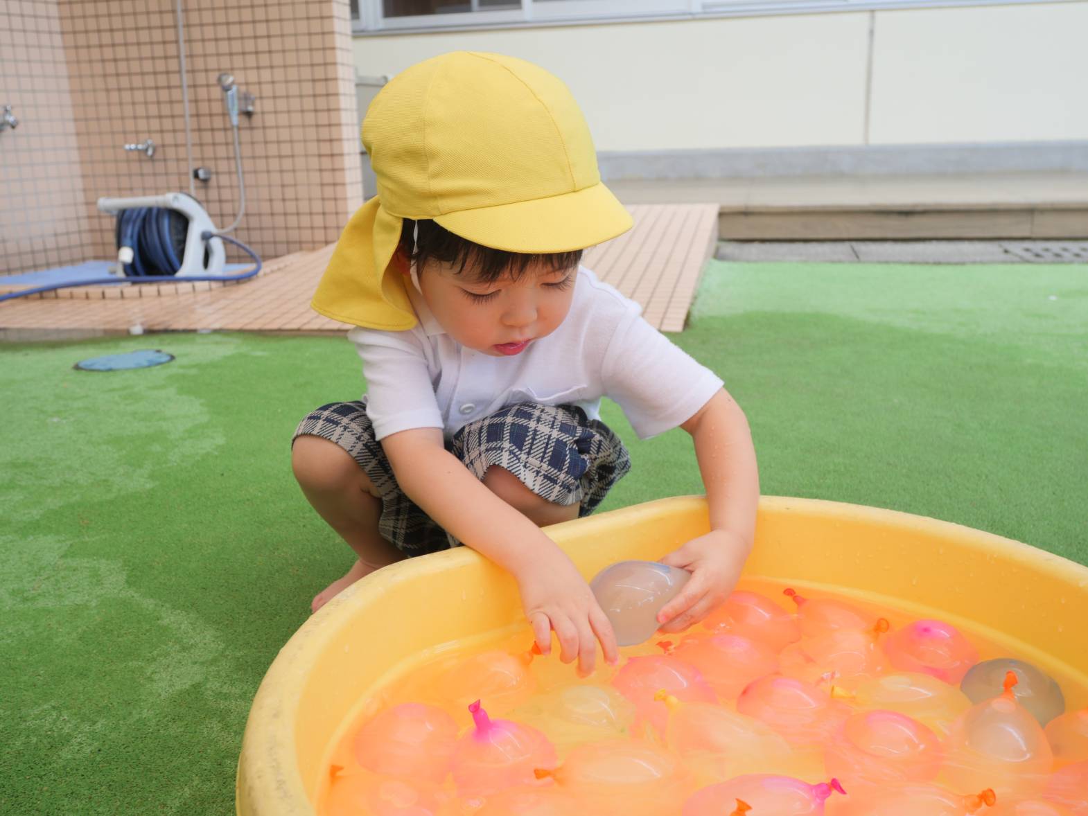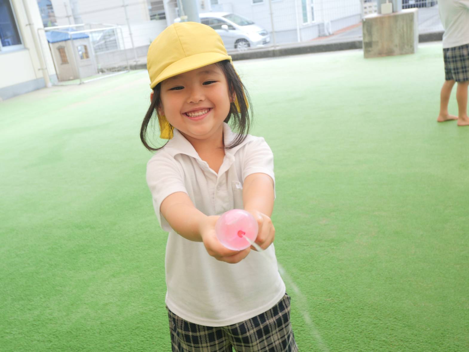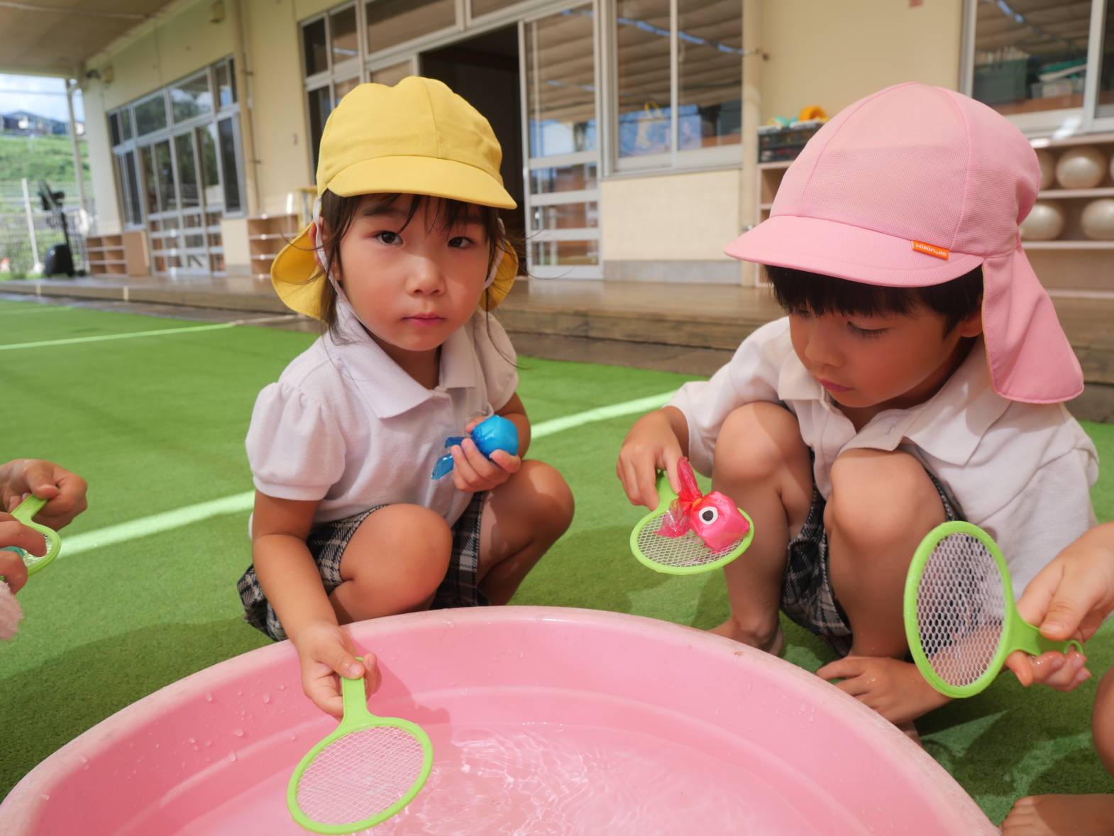 今日は、外遊びの時間に金魚すくいや水風船で遊びました。 金魚すくいでは、真剣な表情で狙いを定め、見事掬い上げると「取れた。」「やった!」と笑顔を覗かせていました。 水風船では遊び進める中で、水風船は引っ張ると水が飛び出すということを発見すると…友だちと一緒に水かけ合戦を繰り広げる子どもたち。 暑い日差しの中でしたが、水に触れる活動を通して、涼しく楽しく戸外で過ごすことができました。