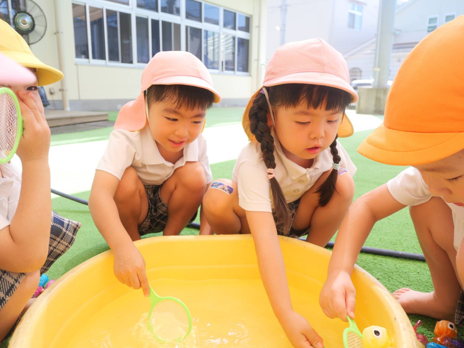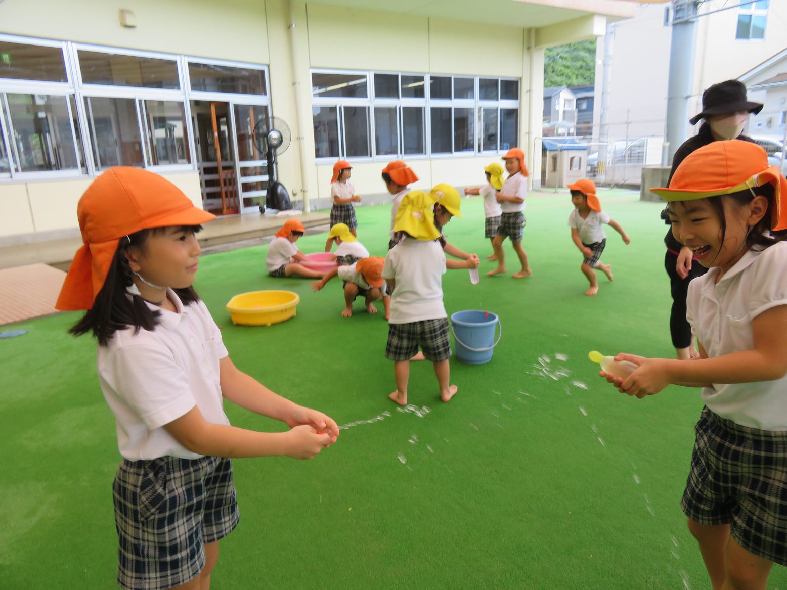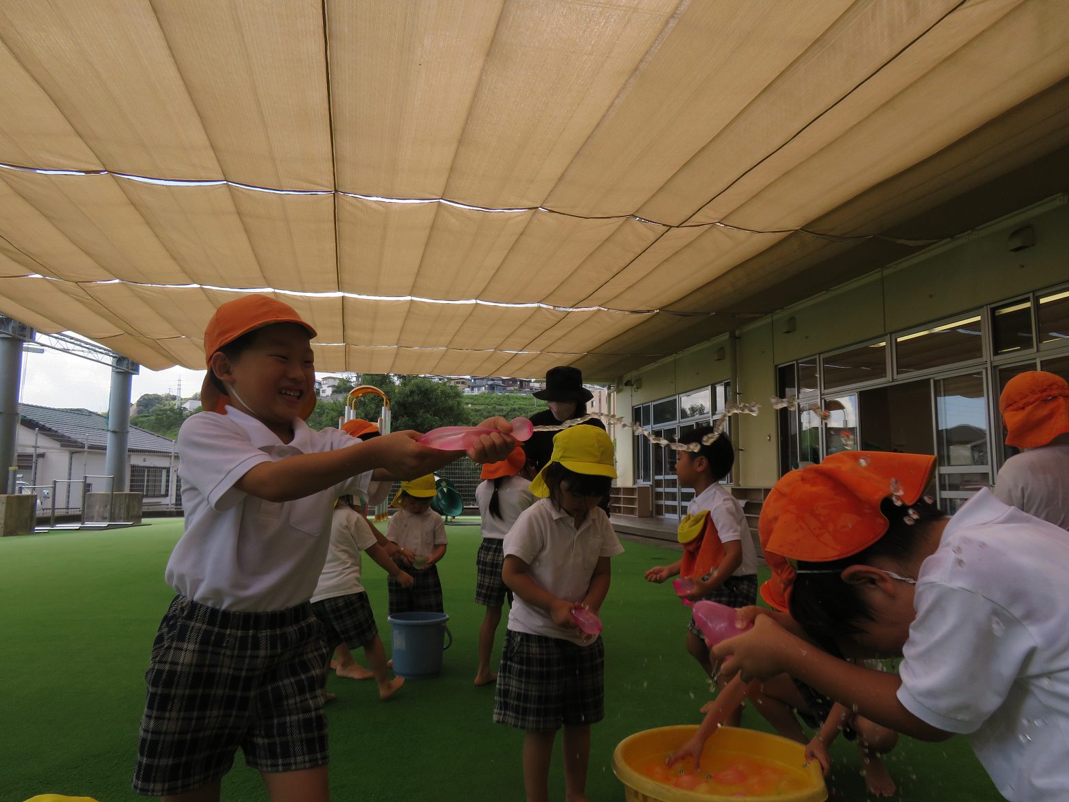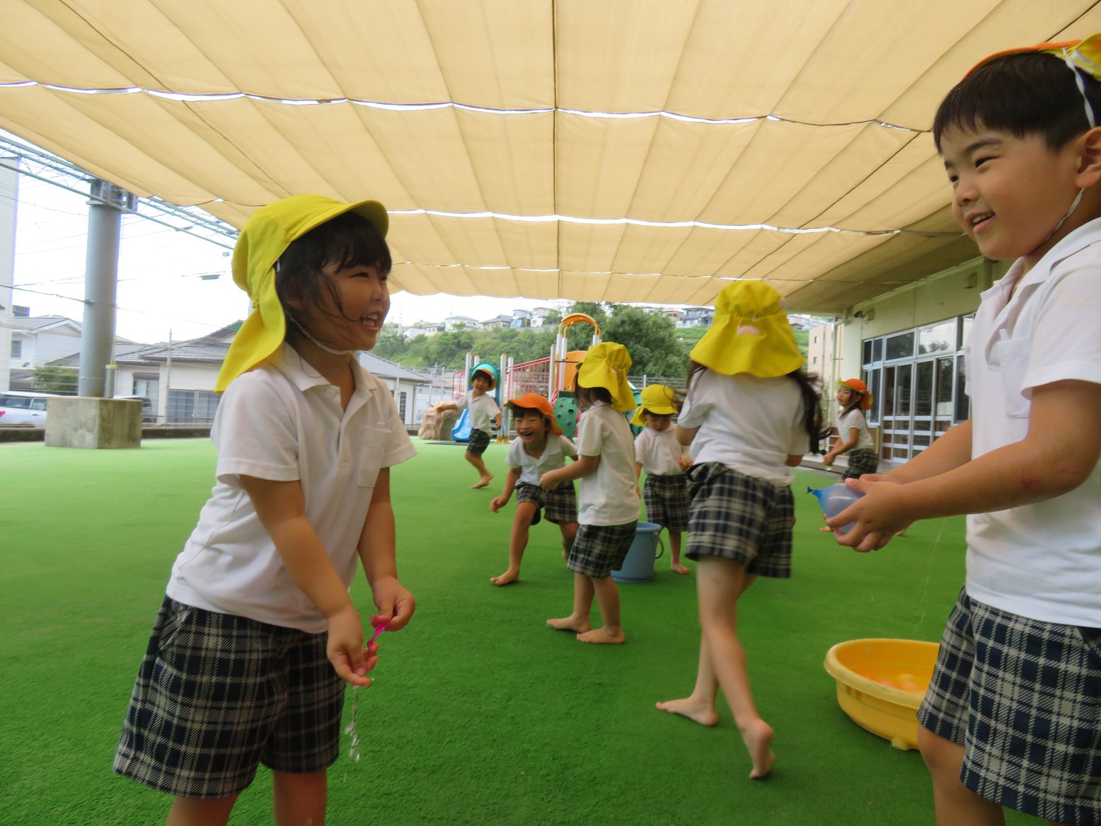 今日は、外遊びの時間に金魚すくいや水風船で遊びました。 金魚すくいでは、真剣な表情で狙いを定め、見事掬い上げると「取れた。」「やった!」と笑顔を覗かせていました。 水風船では遊び進める中で、水風船は引っ張ると水が飛び出すということを発見すると…友だちと一緒に水かけ合戦を繰り広げる子どもたち。 暑い日差しの中でしたが、水に触れる活動を通して、涼しく楽しく戸外で過ごすことができました。