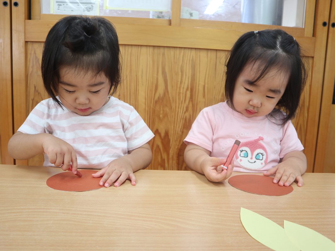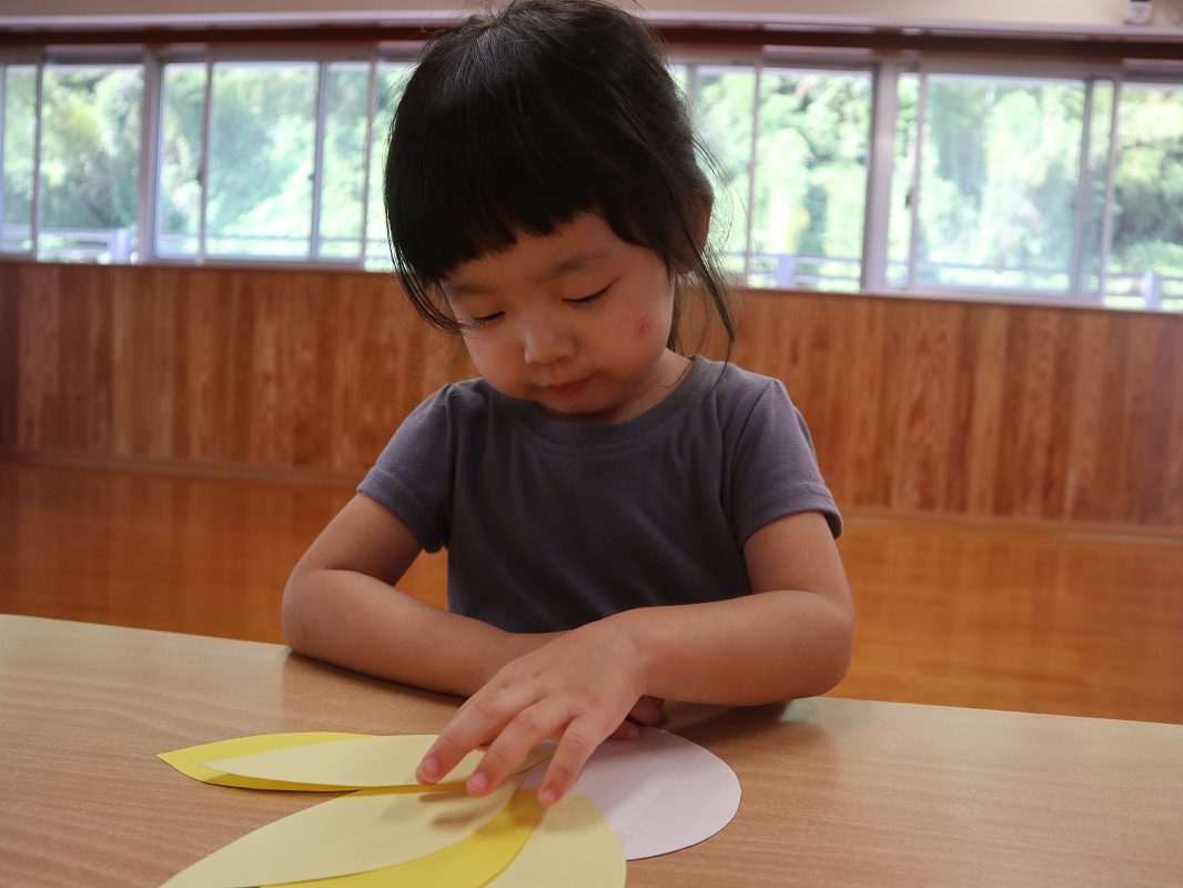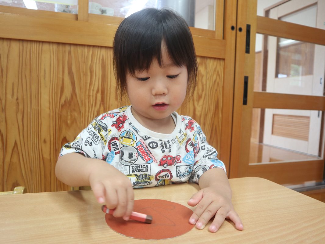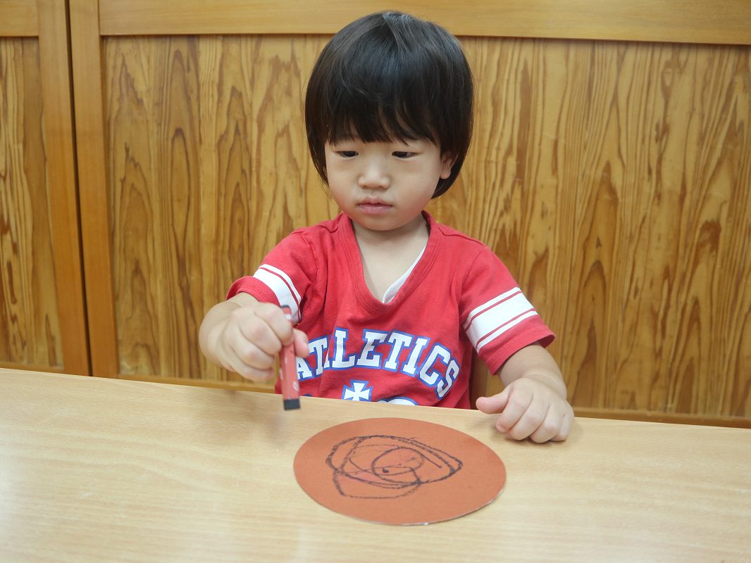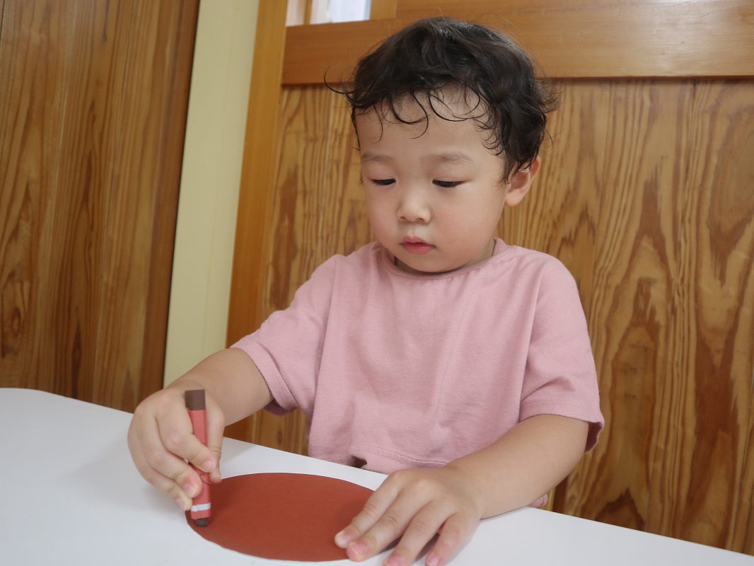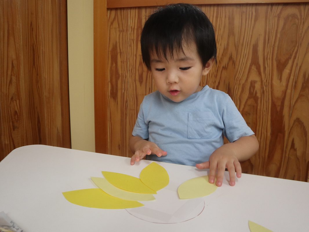 今月の製作で、向日葵の製作を行いました。 「ひまわりだー!」と興味津々な子どもたち。 ひまわりの中央部分をクレヨンでぐるぐる描いたり、花びらを1枚ずつ貼っていったりしてお花を完成させていきます。 完成した向日葵を見てニッコリの子どもたちでした。