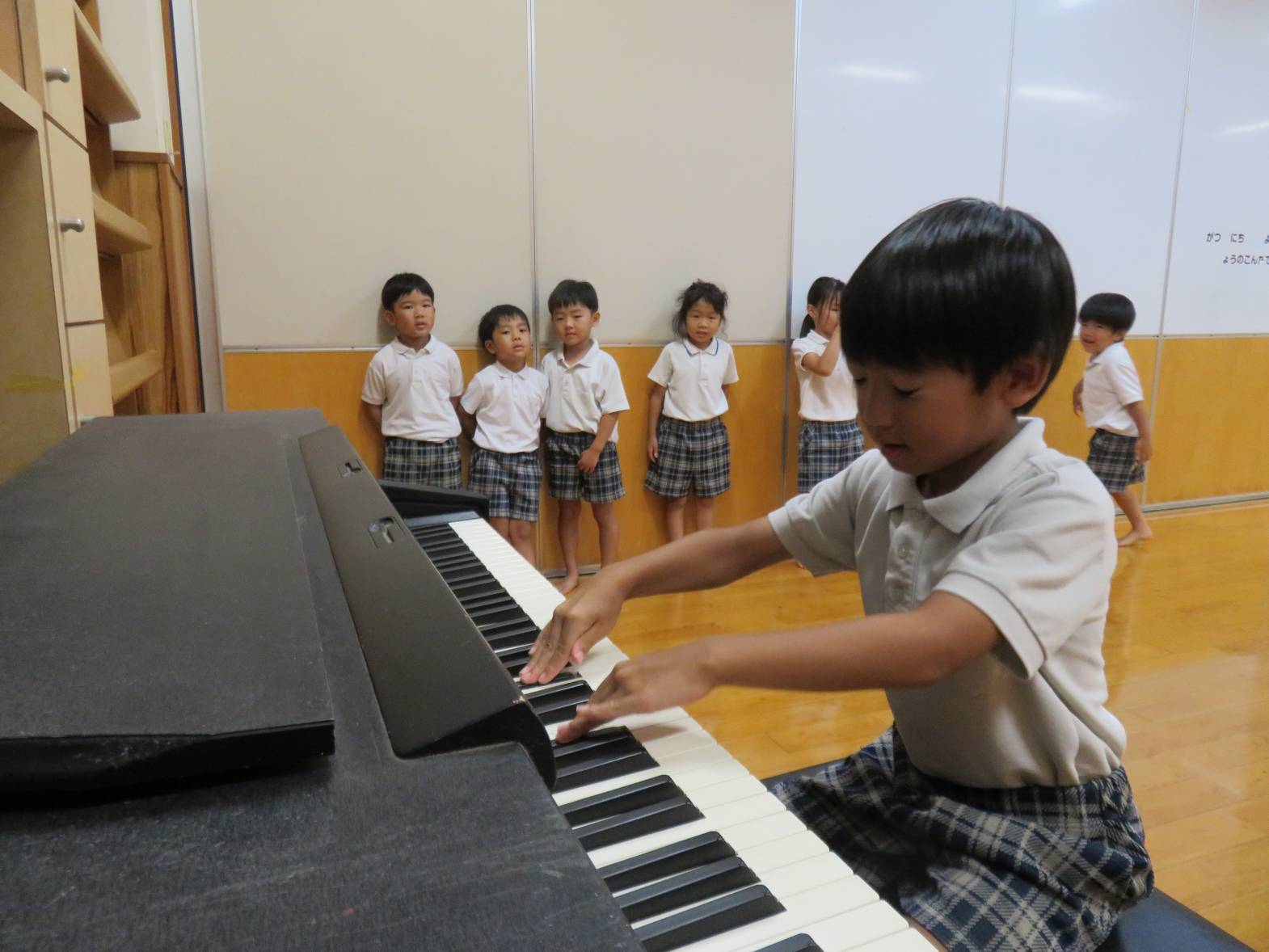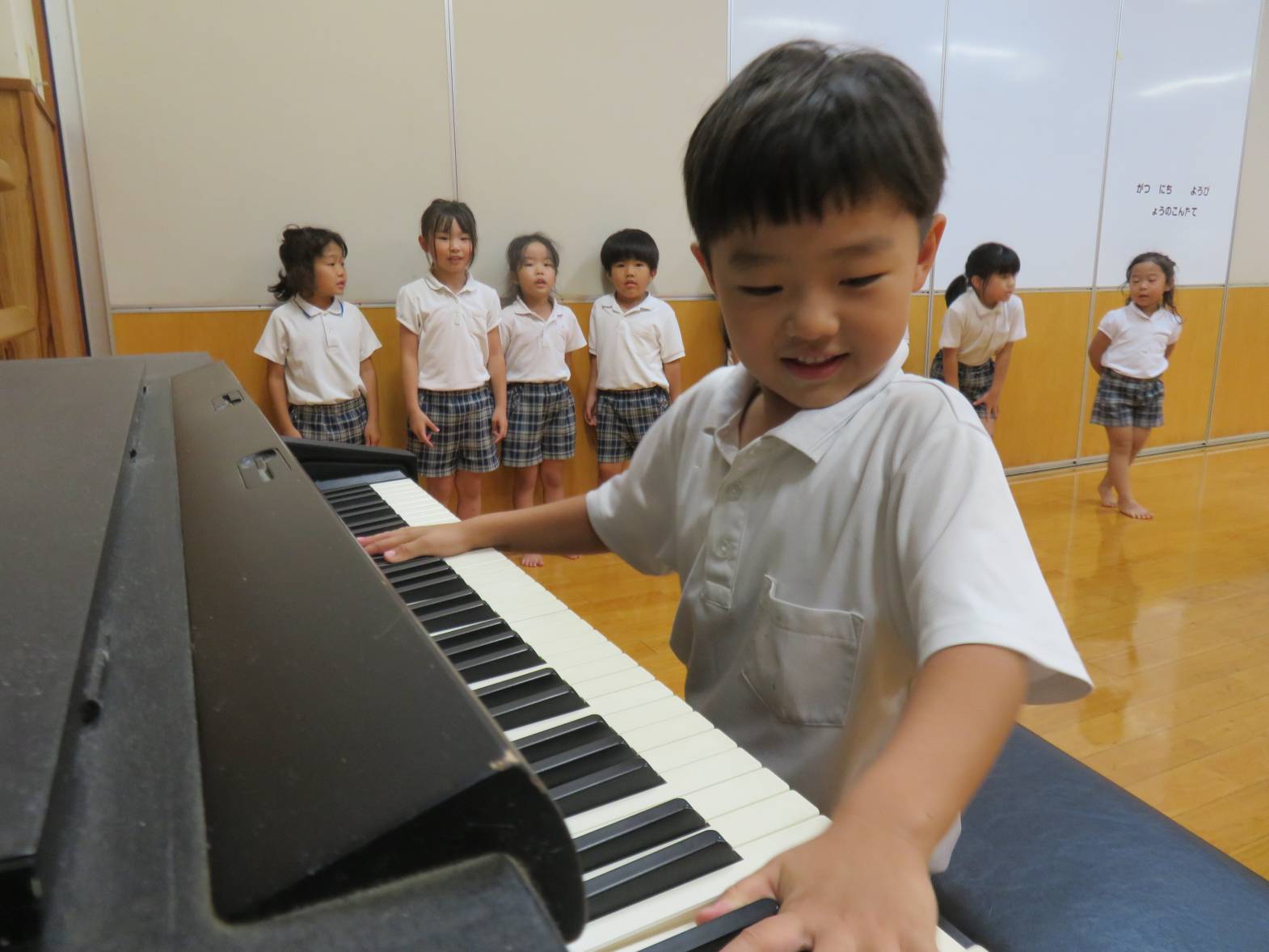 今週きりん組では、ピアノを習っている子の「みんなの前でピアノ弾きたい。」というピアノのお披露目から「私もピアノ弾いてみたい!」とピアノに興味津々な子どもたち。
