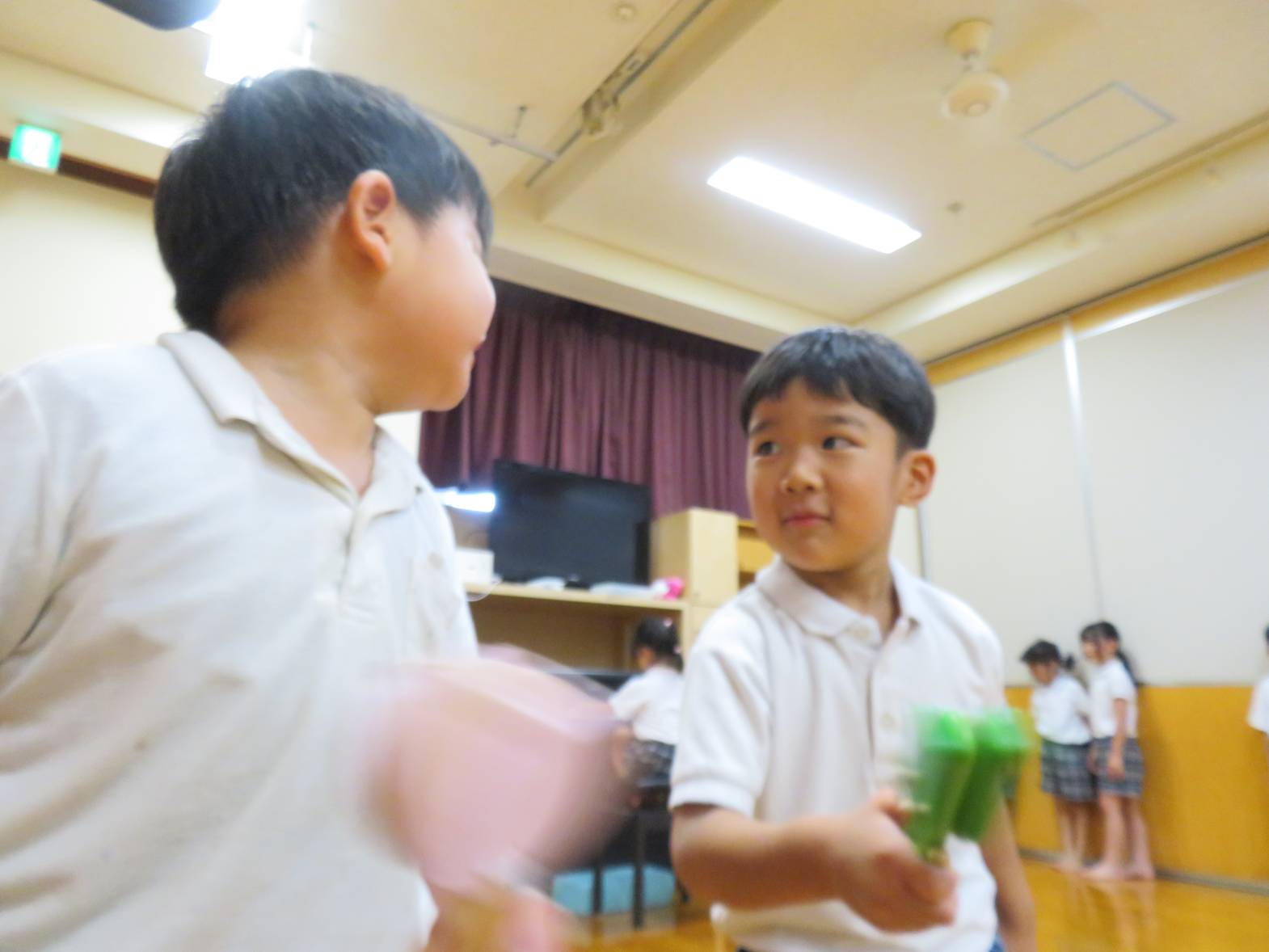 何人かで集まって鈴やマラカスでの愉快な演奏会がはじまったり、賑やかな楽器遊びになりました。