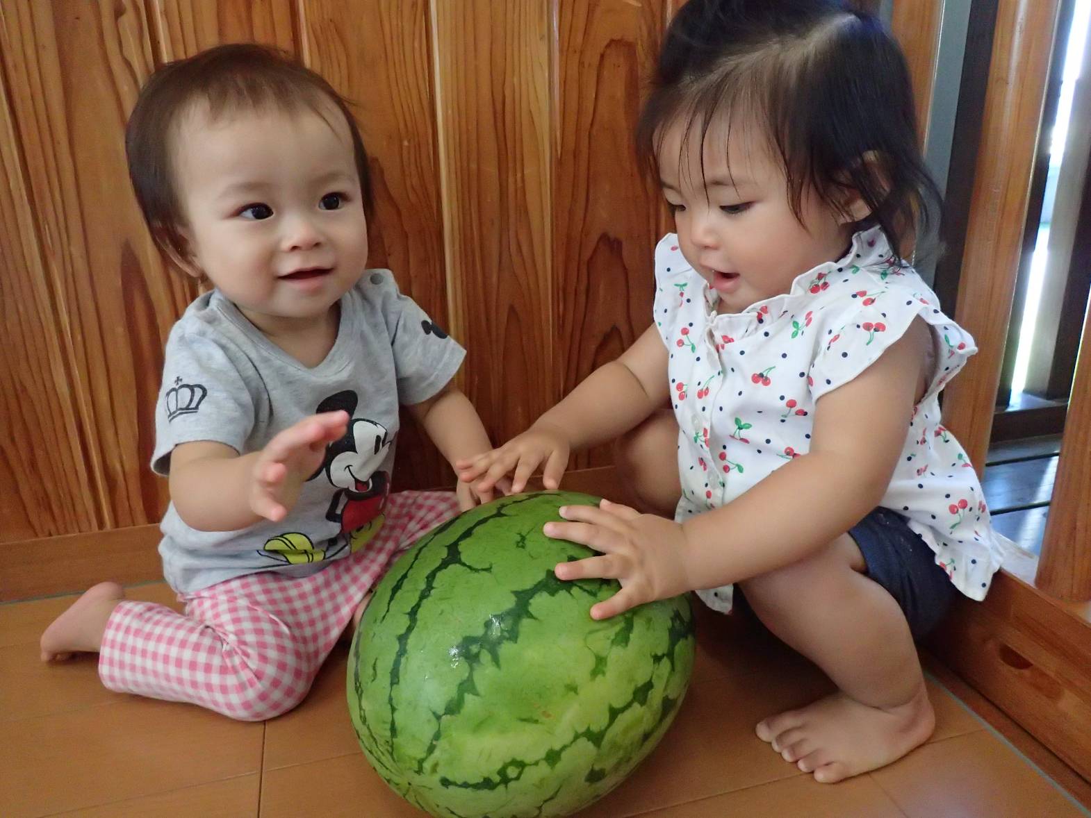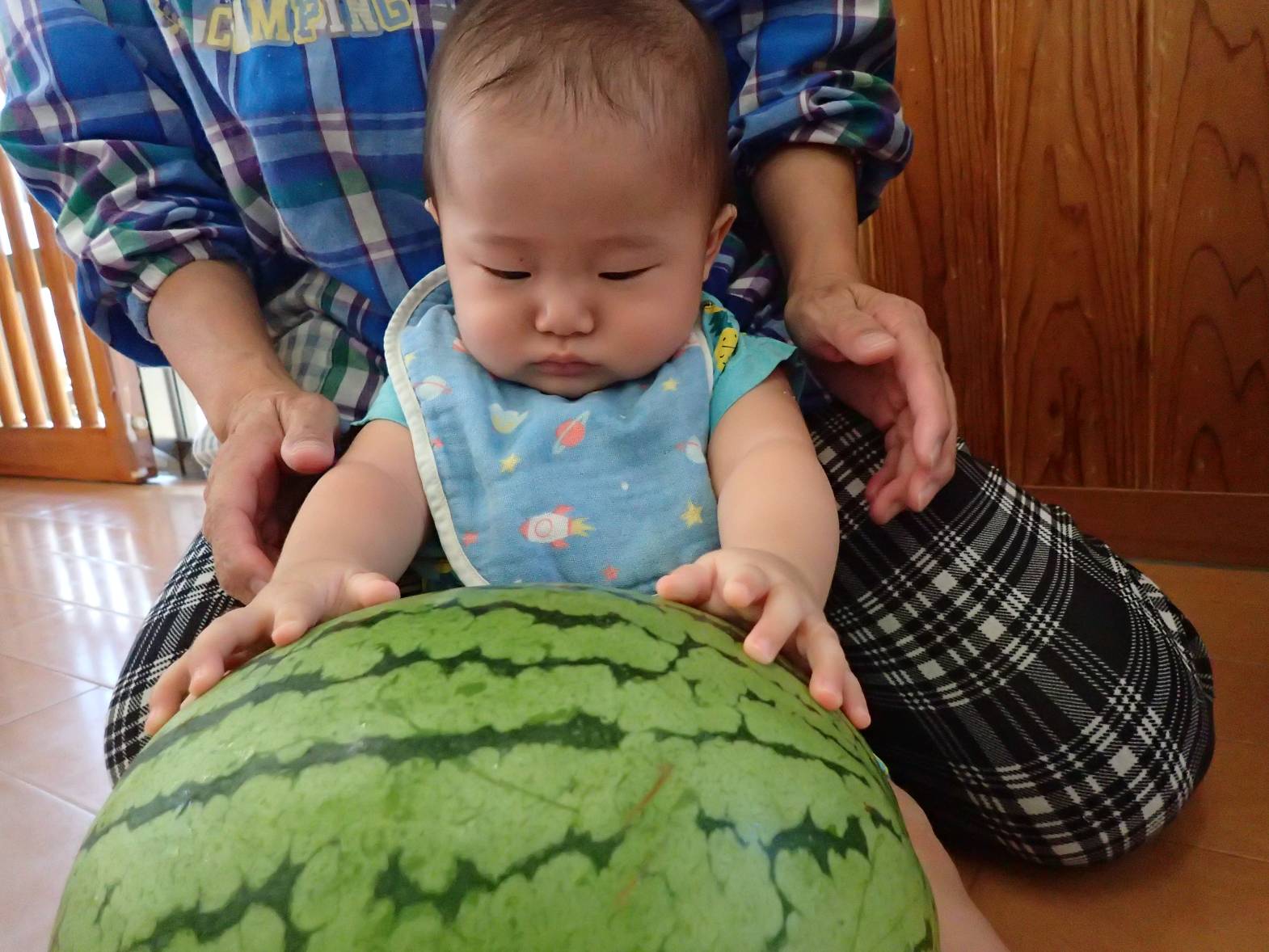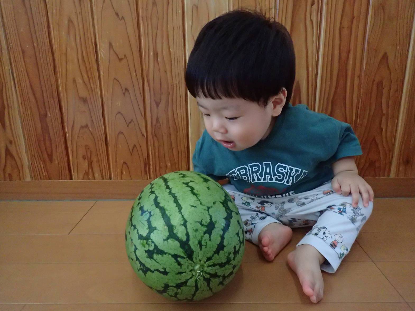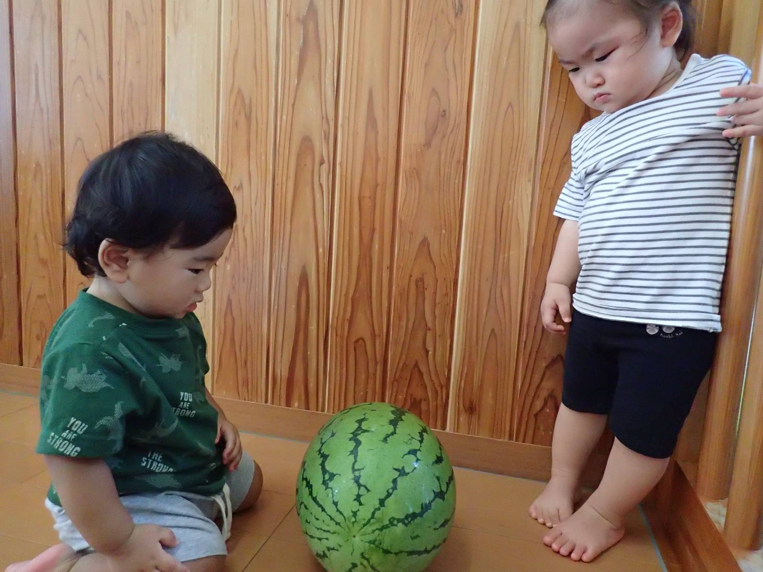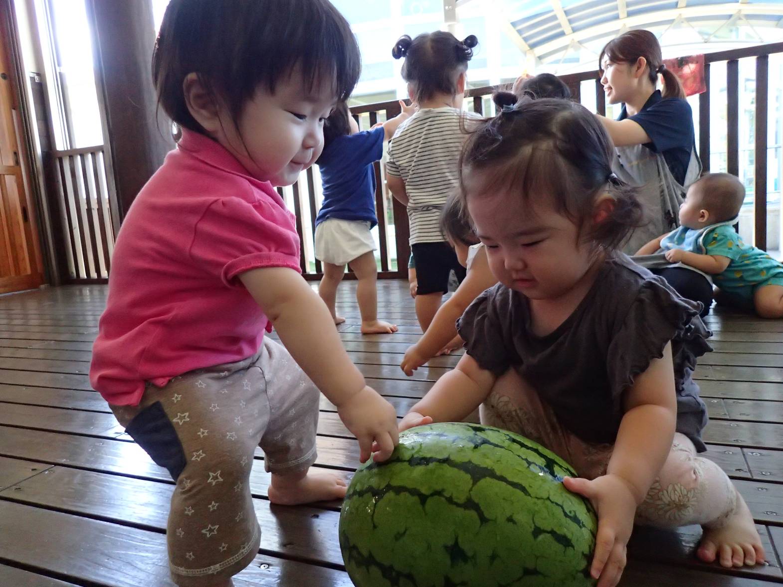 夏ならではのスイカの観察をしました。 見慣れない模様、大きなスイカに“なんだろう?”と不思議そうな子どもたち。 触ってみると、冷たくて気持ちが良かったようです! トントン叩いて音を鳴らして遊ぶ姿が見られました。 また、ボールのように転がそうとしたり、“あーん!”と口を開けて食べようとしたりする子どもたち! 思い思いにスイカに触れることを楽しみました。