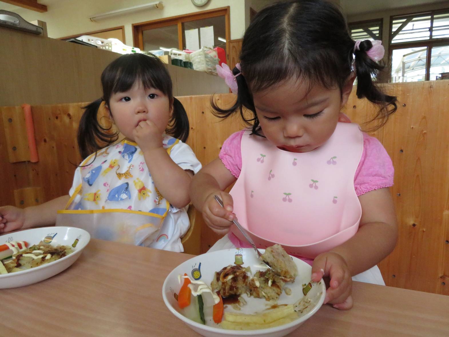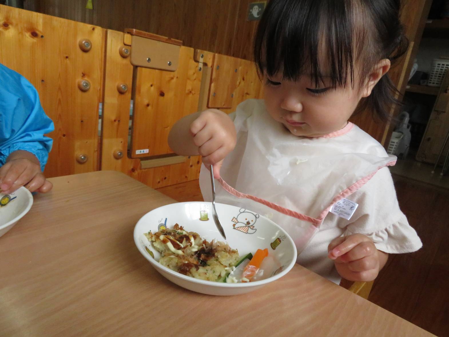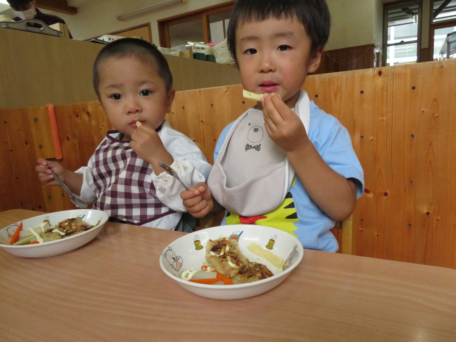 今日はわくわくメニューでした。 お好み焼きやポテトに「わ~!」と、喜ぶこあら組さん! 「美味しい?」と尋ねると、笑顔でおいしさをアピールする姿が見られました。 また、スプーンの使い方も上手になってきており、上手持ちや下手持ちで意欲的に食べ進める子どもたちです! 苦手な物もありますが、ひとくち口に入れたり、他の食材と一緒に食べたりしながら、少しずつ克服してきています。 沢山食べた後は、とても満足そうなこあら組さんでした♪