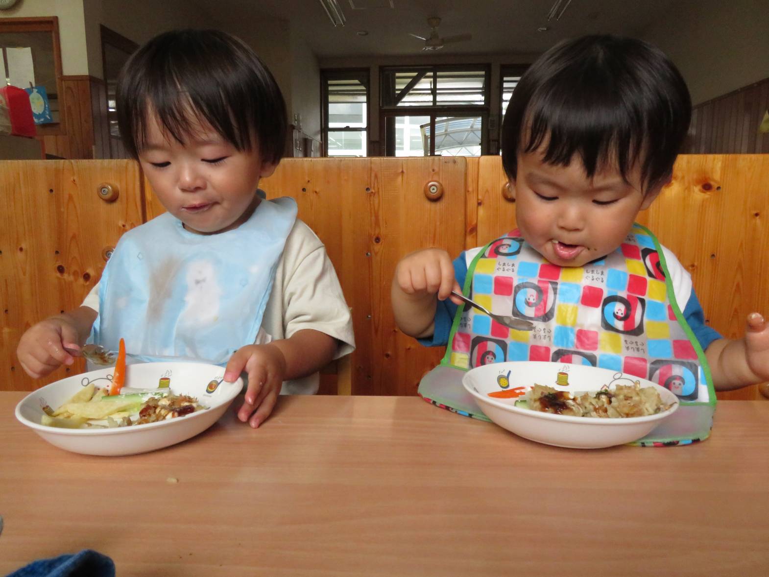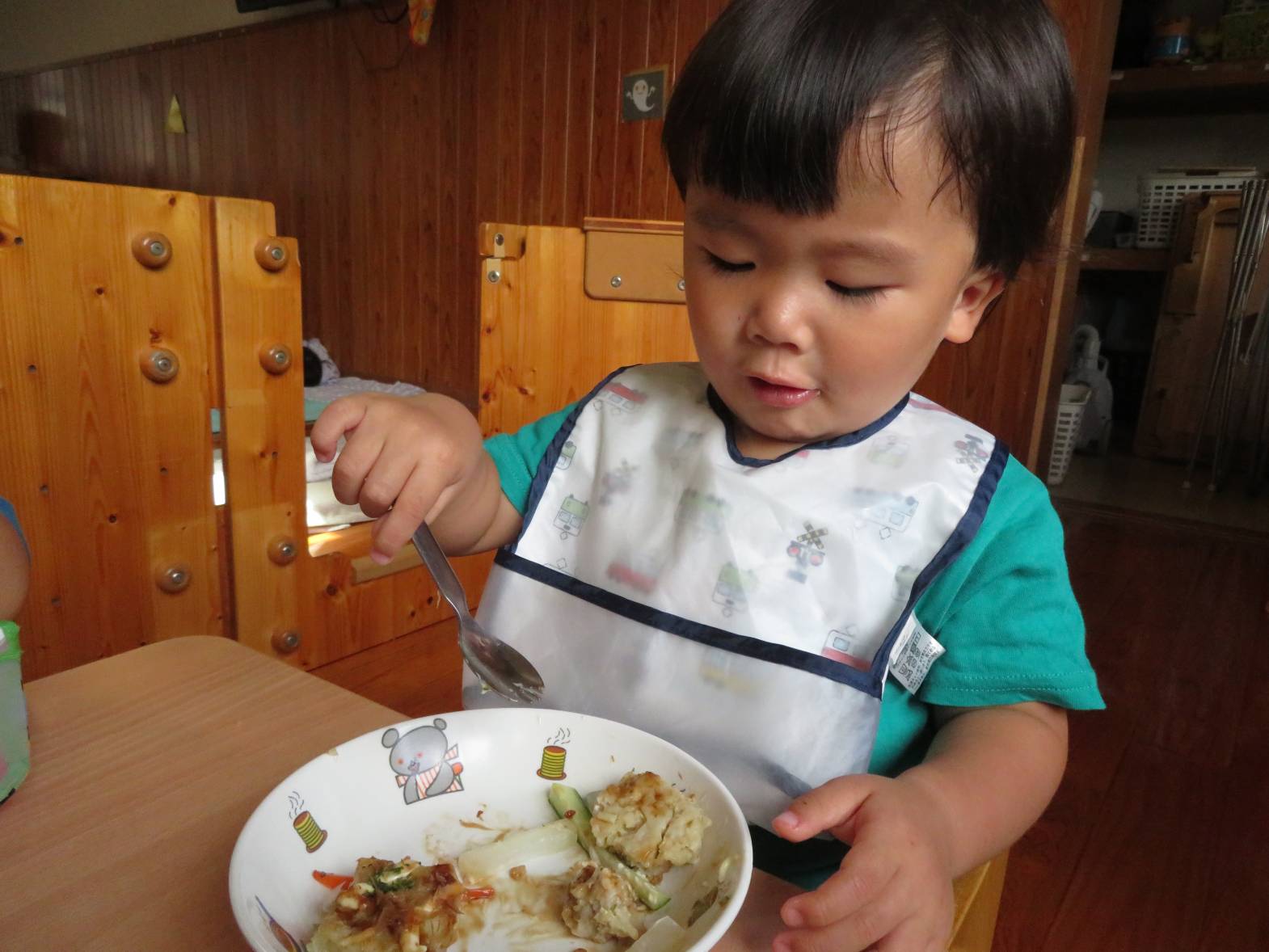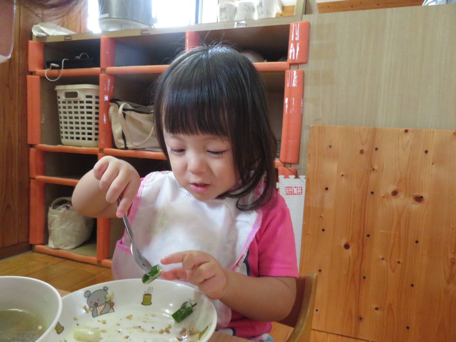 今日はわくわくメニューでした。 お好み焼きやポテトに「わ~!」と、喜ぶこあら組さん! 「美味しい?」と尋ねると、笑顔でおいしさをアピールする姿が見られました。 また、スプーンの使い方も上手になってきており、上手持ちや下手持ちで意欲的に食べ進める子どもたちです! 苦手な物もありますが、ひとくち口に入れたり、他の食材と一緒に食べたりしながら、少しずつ克服してきています。 沢山食べた後は、とても満足そうなこあら組さんでした♪