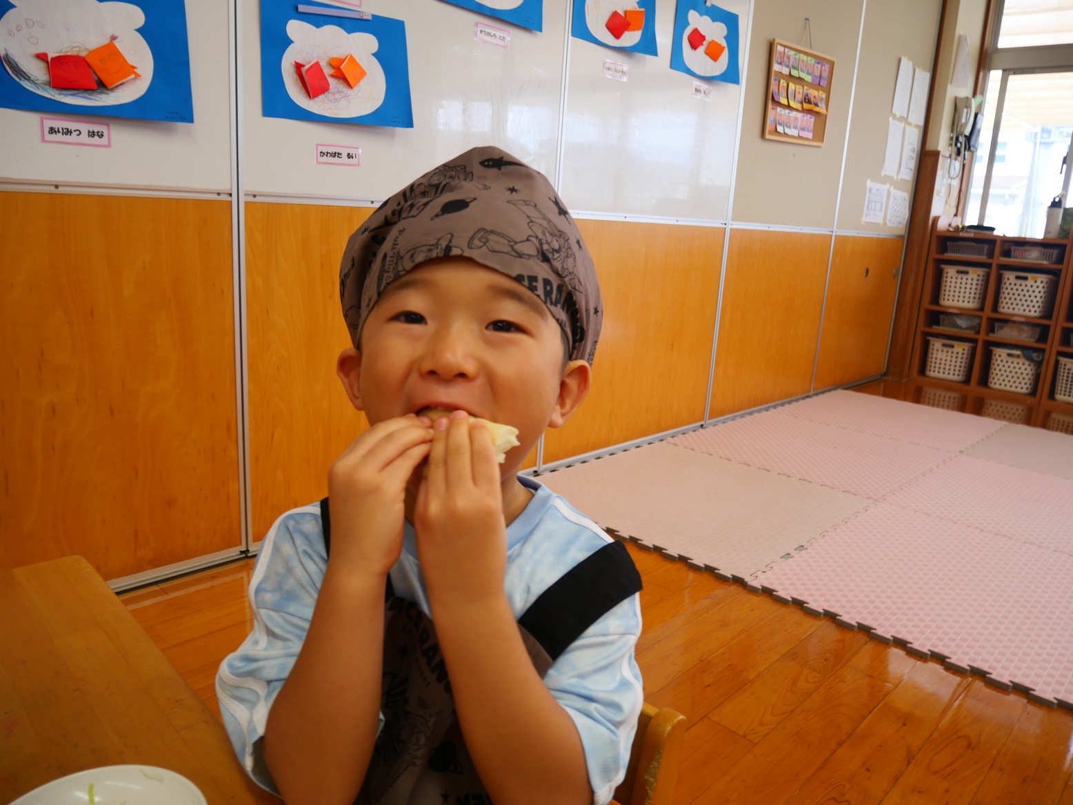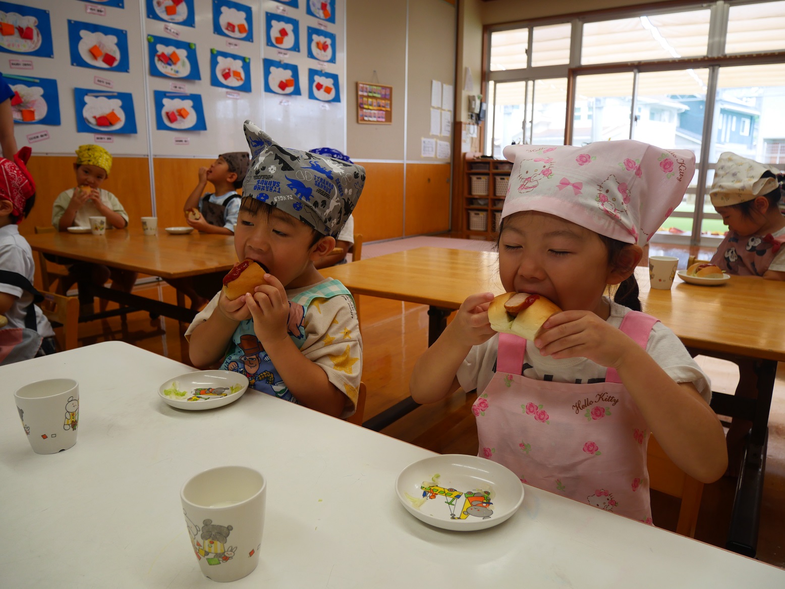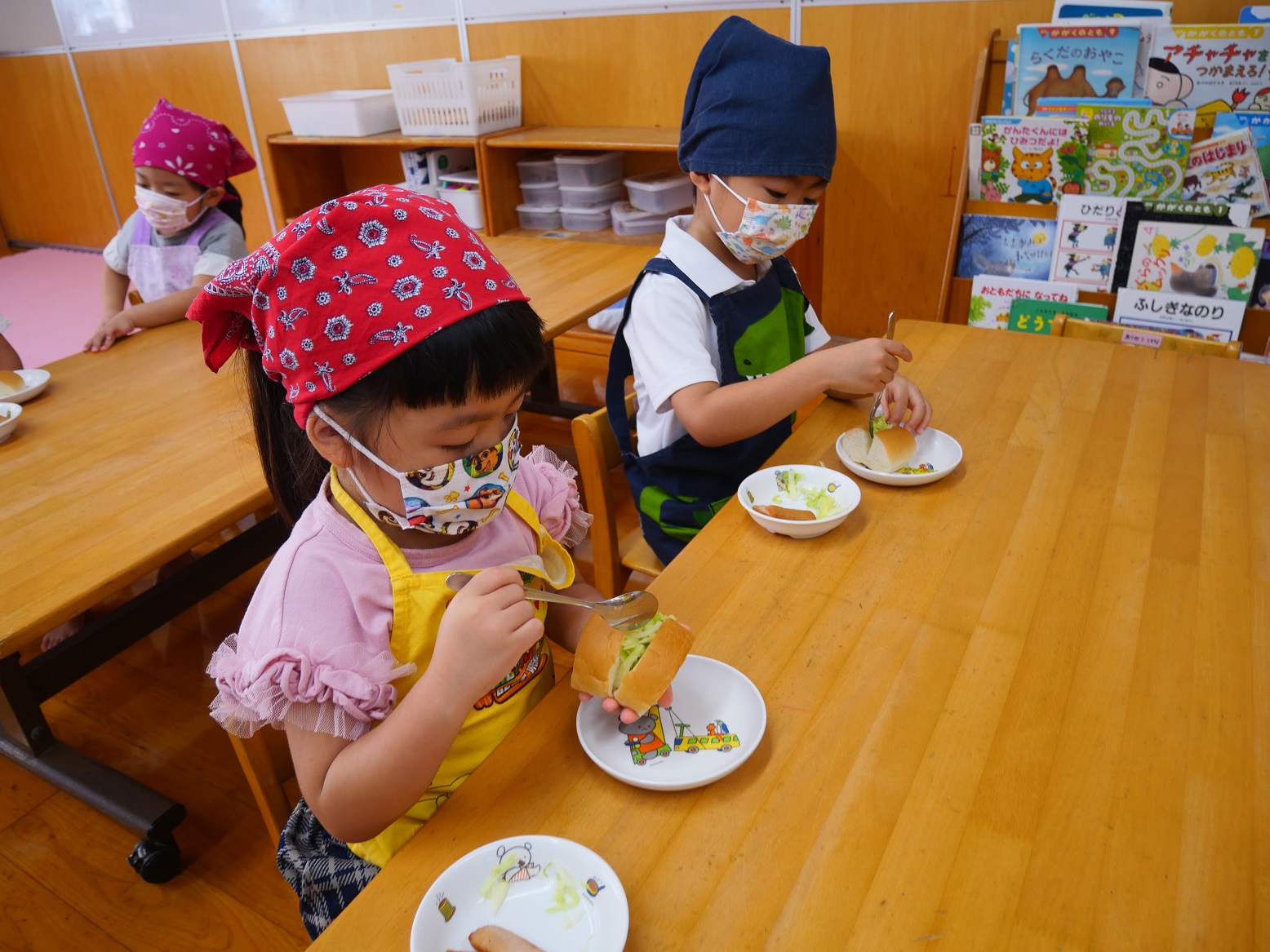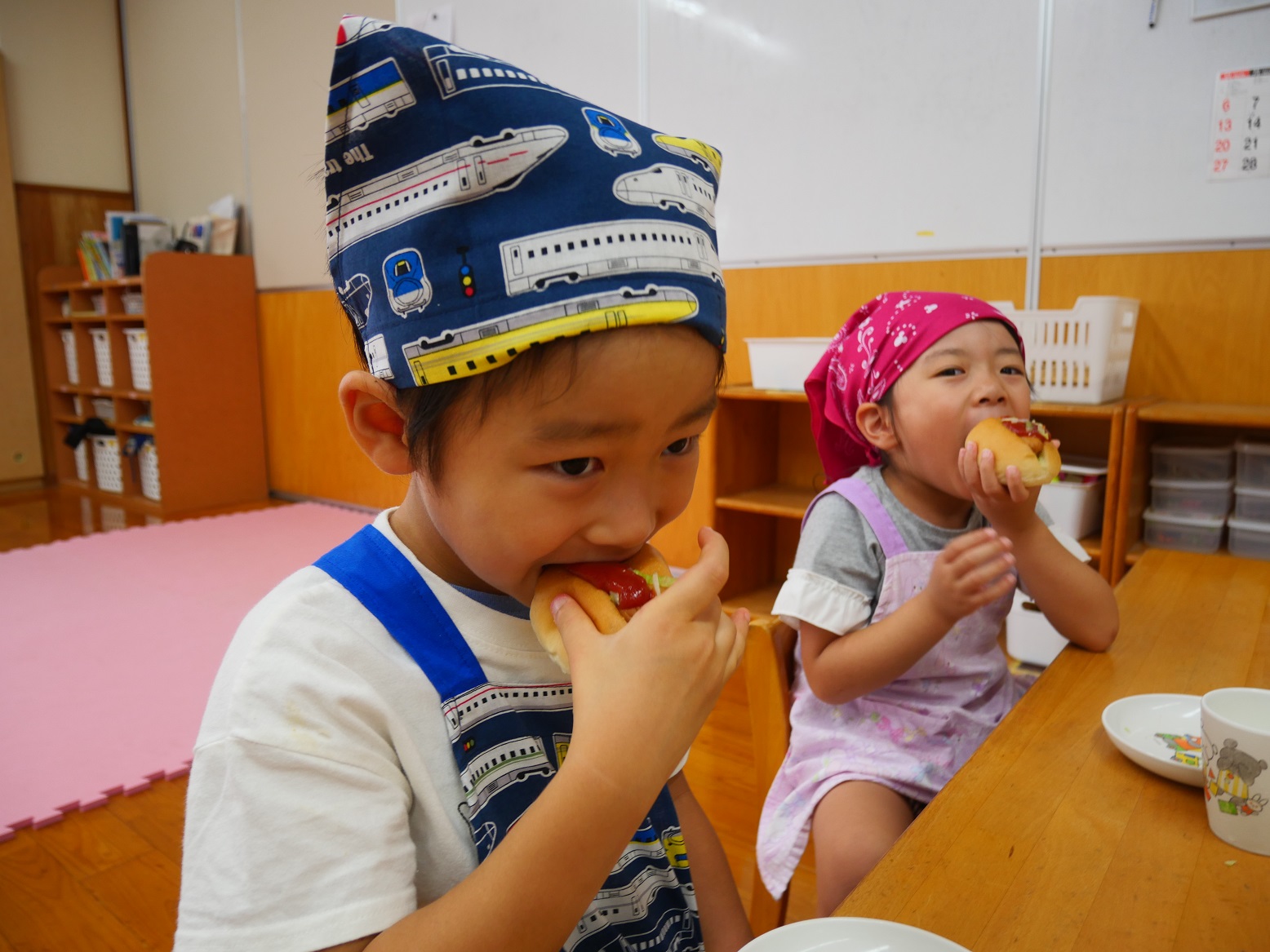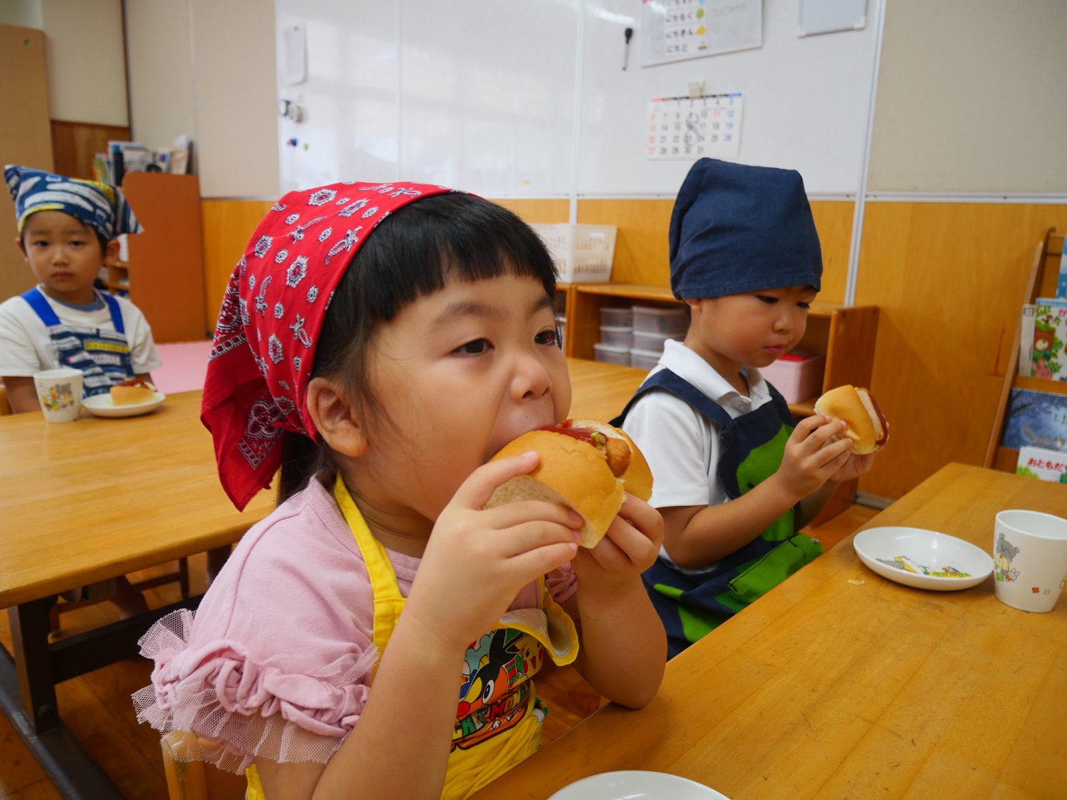 全員が作り終わったら、元気よく「いただきます!」をして、大きな口でかぶりつきました。「おいしい!」「ケチャップつけすぎたかも!」と嬉しそうに頬張る子どもたち。