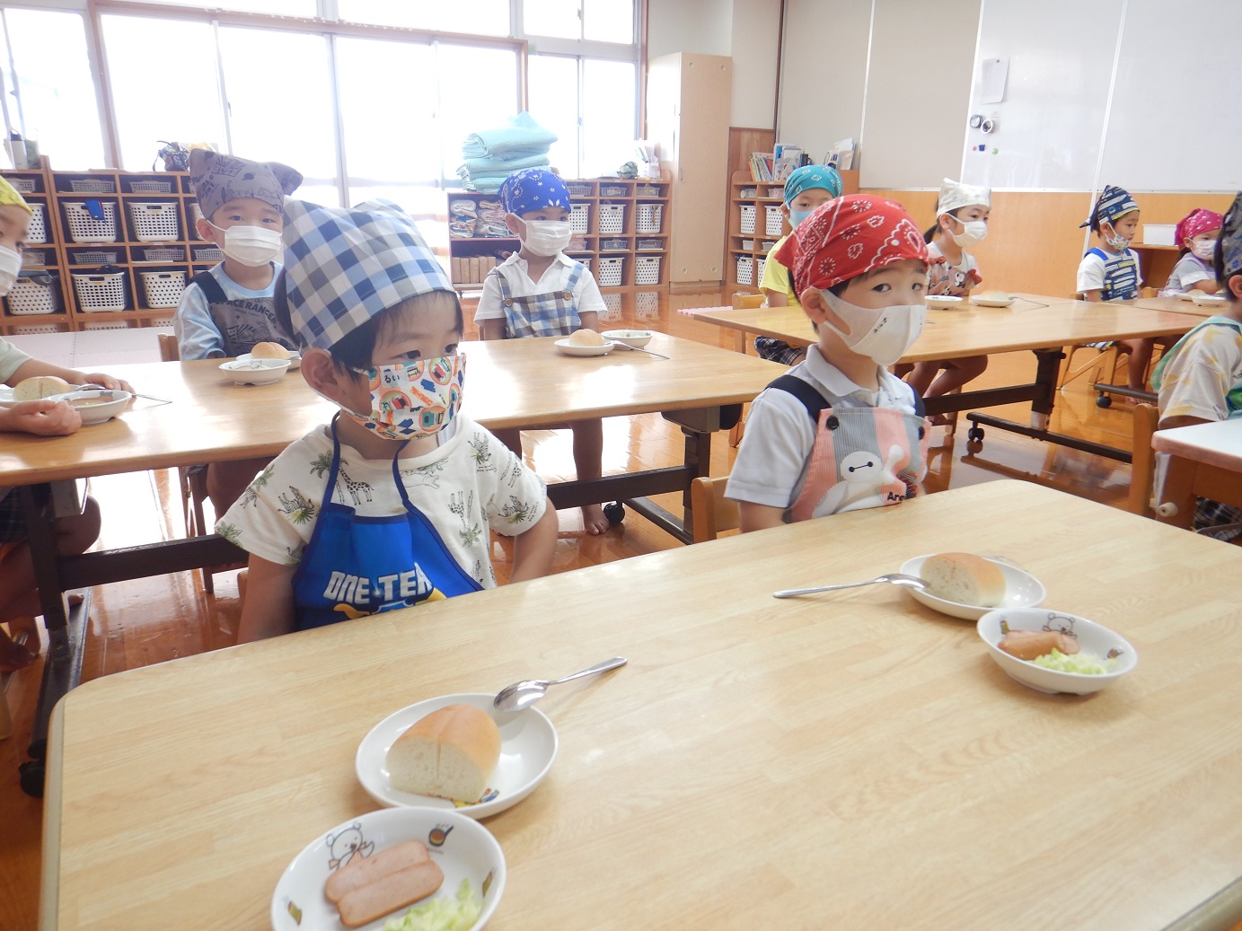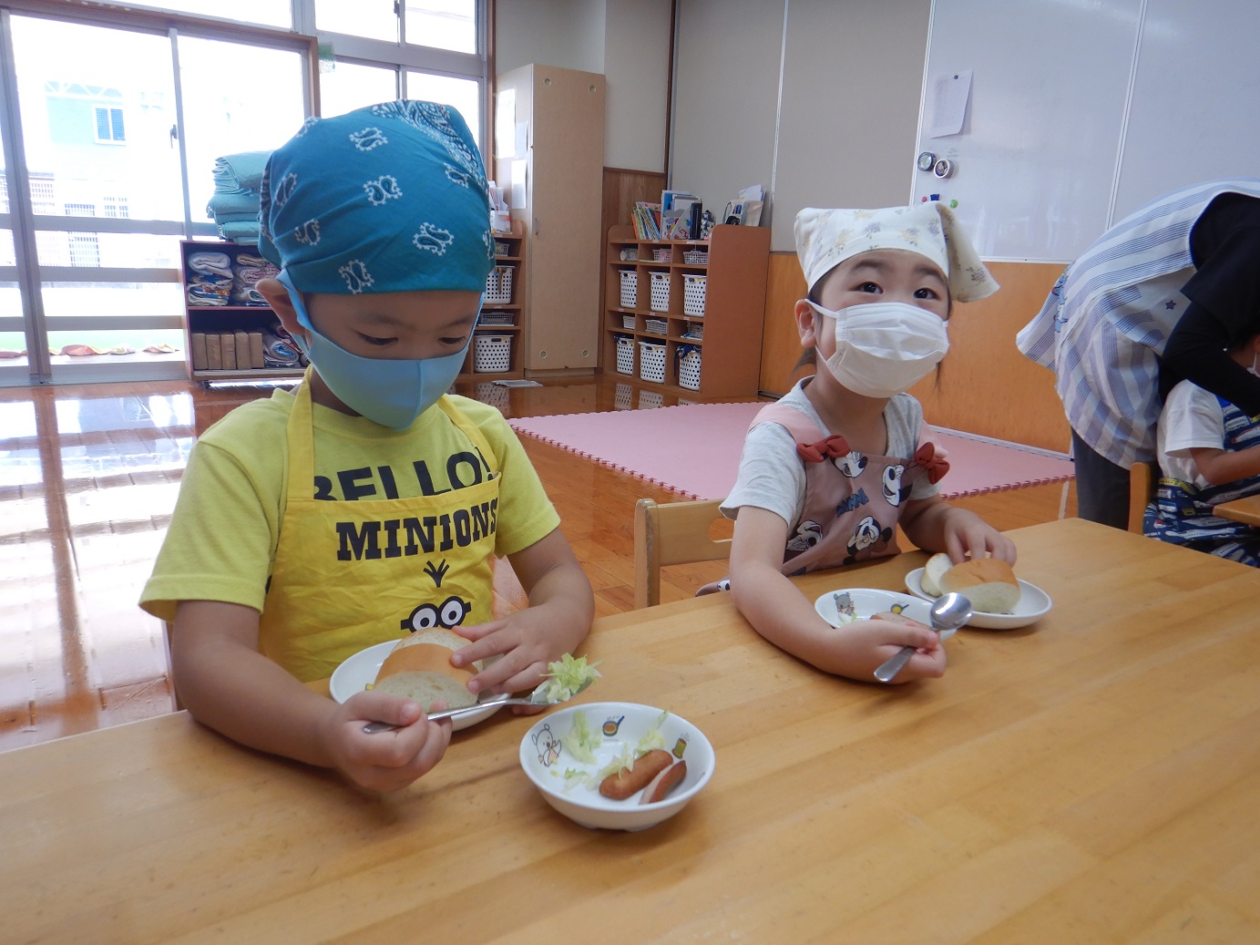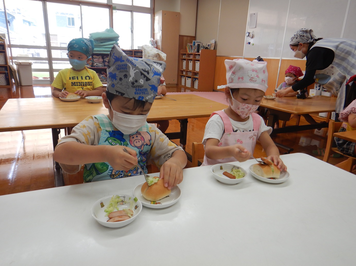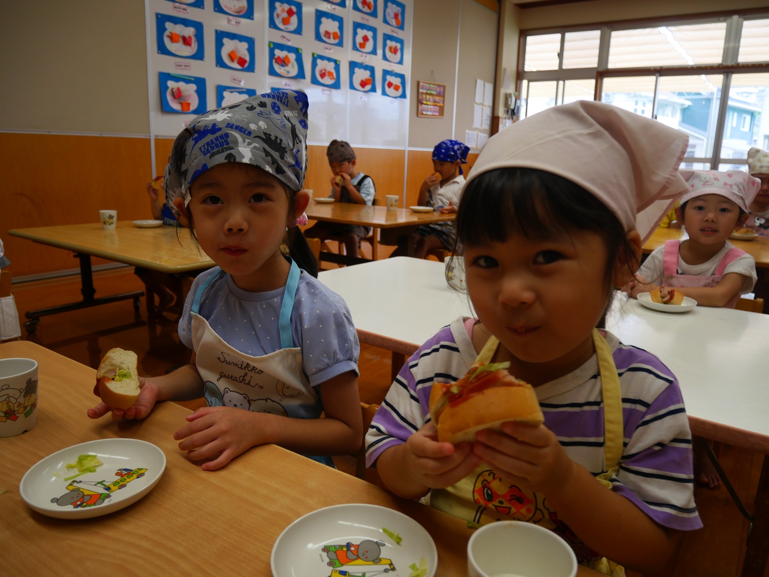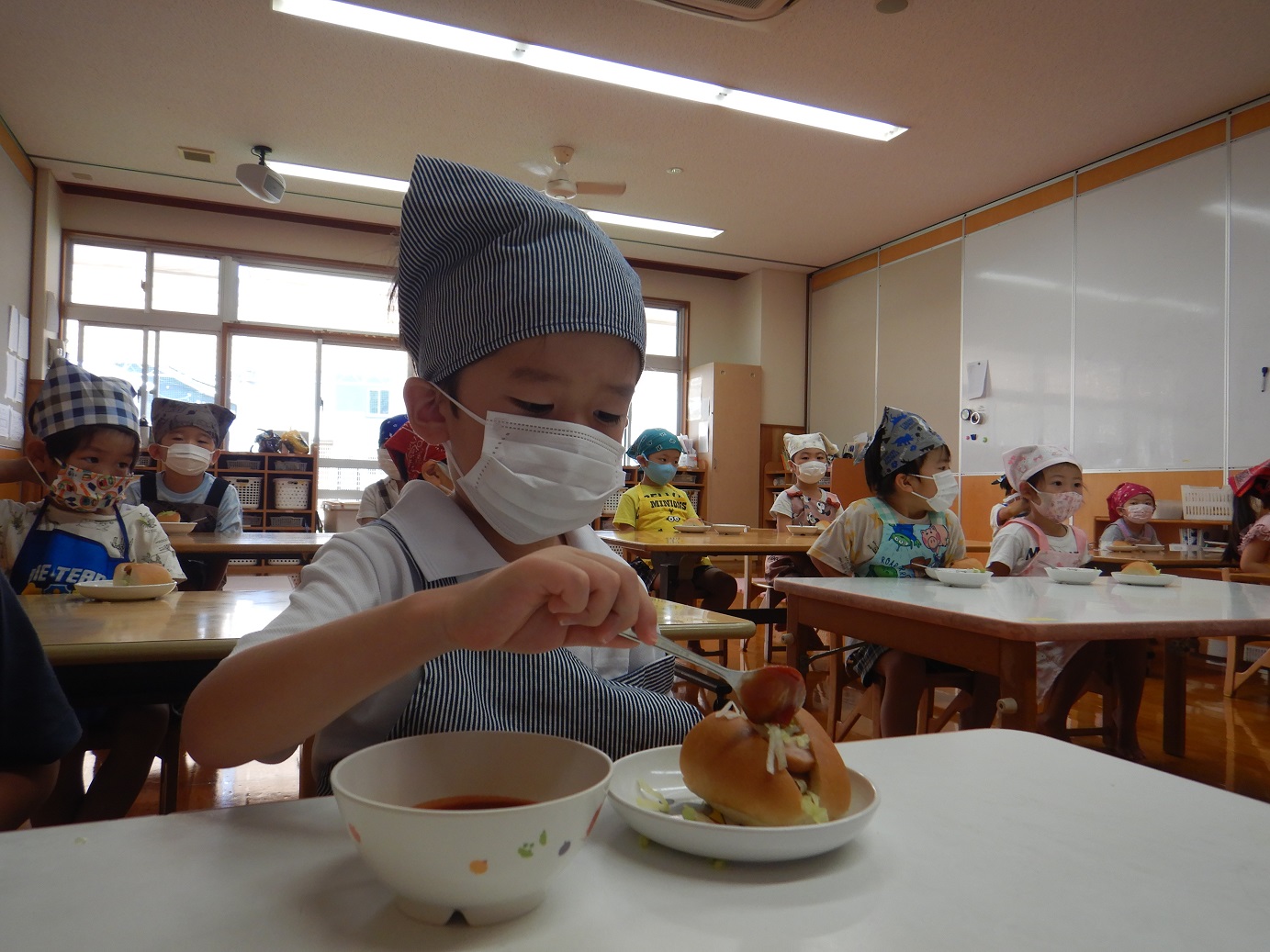 全員が作り終わったら、元気よく「いただきます!」をして、大きな口でかぶりつきました。「おいしい!」「ケチャップつけすぎたかも!」と嬉しそうに頬張る子どもたち。