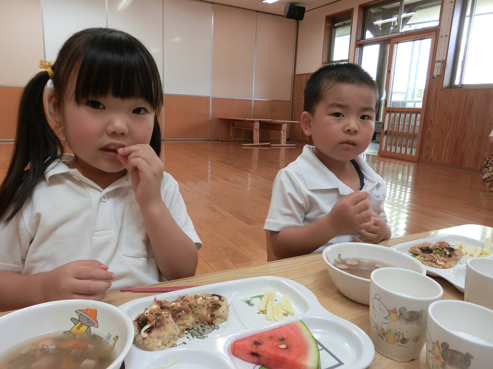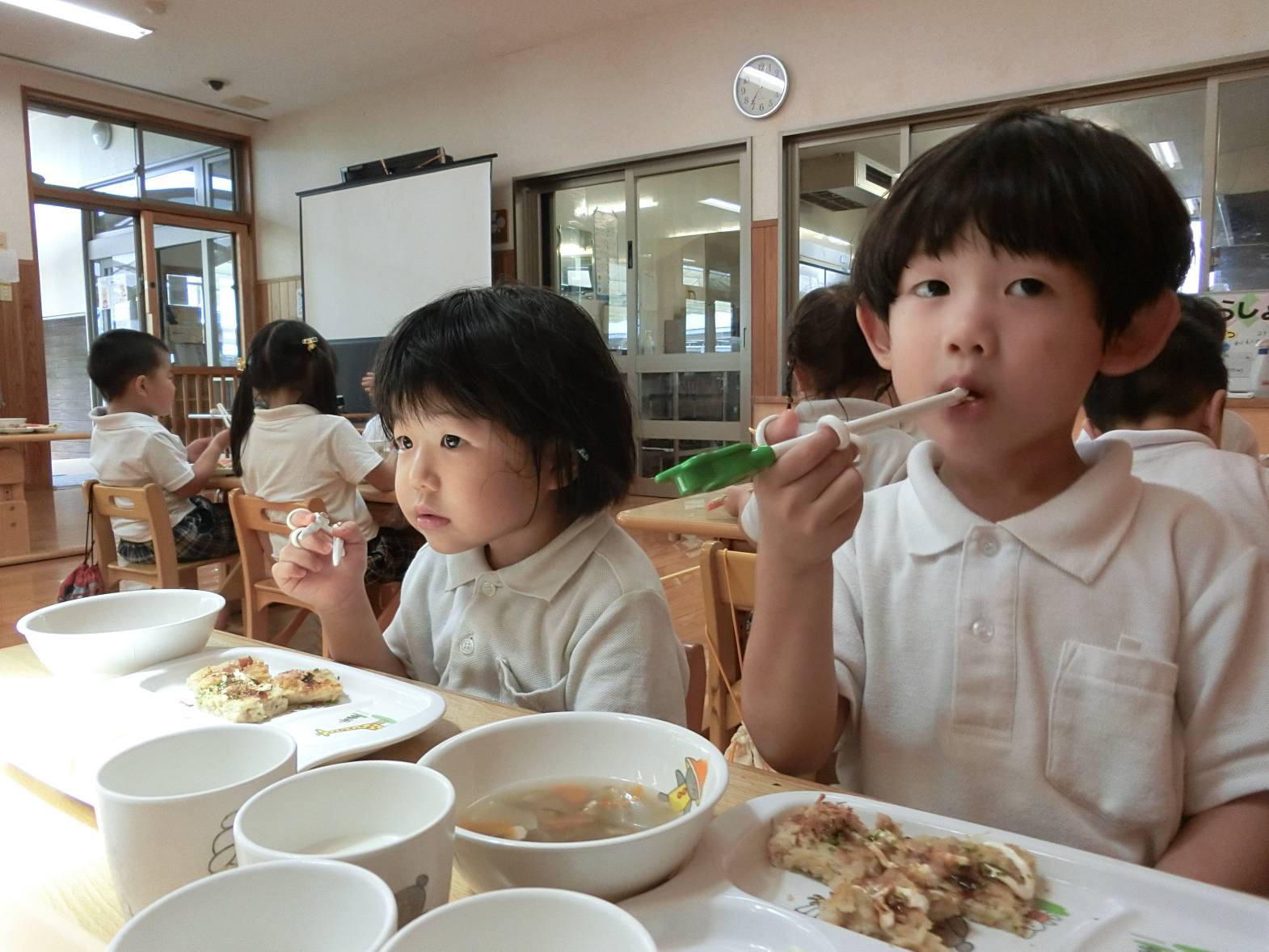「先生がお好み焼きって言ってたよ。」と友だちに言われて「みんなお好み焼きだって!」と会話も弾んでいる様子でした。