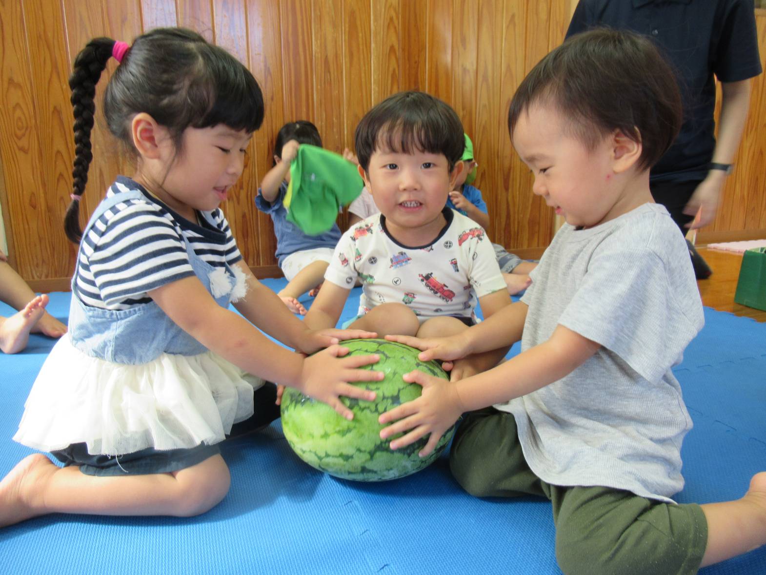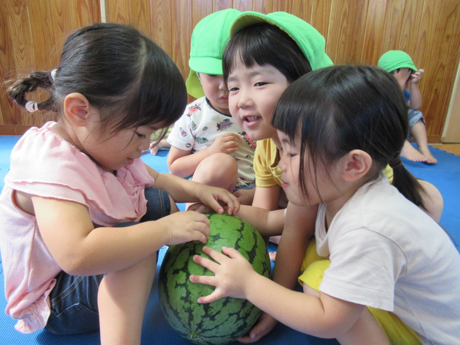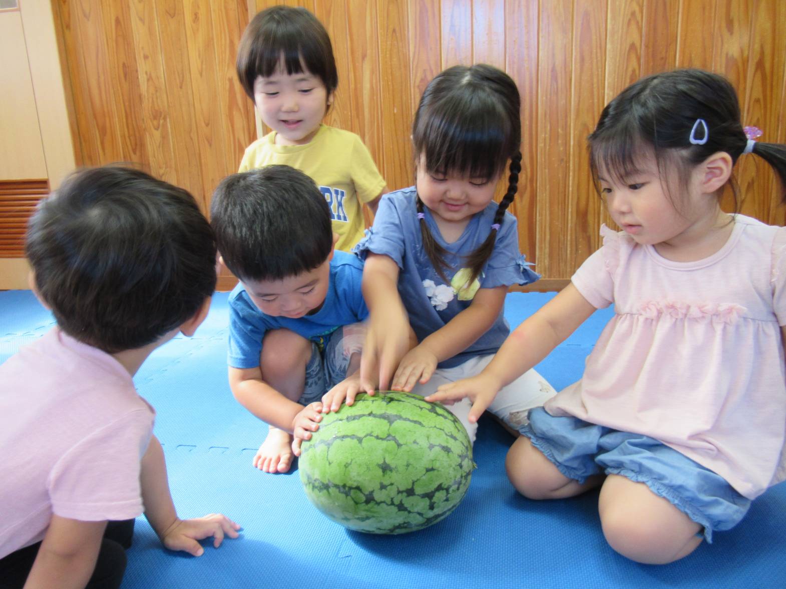 先日、隣の畑のおじさんからスイカを頂いたので、観察をしました! 「わぁ!スイカだ!」、「大きいね!」と興味津々な様子で見たり、触ったりする子どもたち。 「スイカの中は何色か知ってる?」と尋ねると、「赤だよ!」、「おうちで食べたことある!」と答える姿が見られました。 実物に触れながら、様々な知識を増やしているぱんだ組さんです!