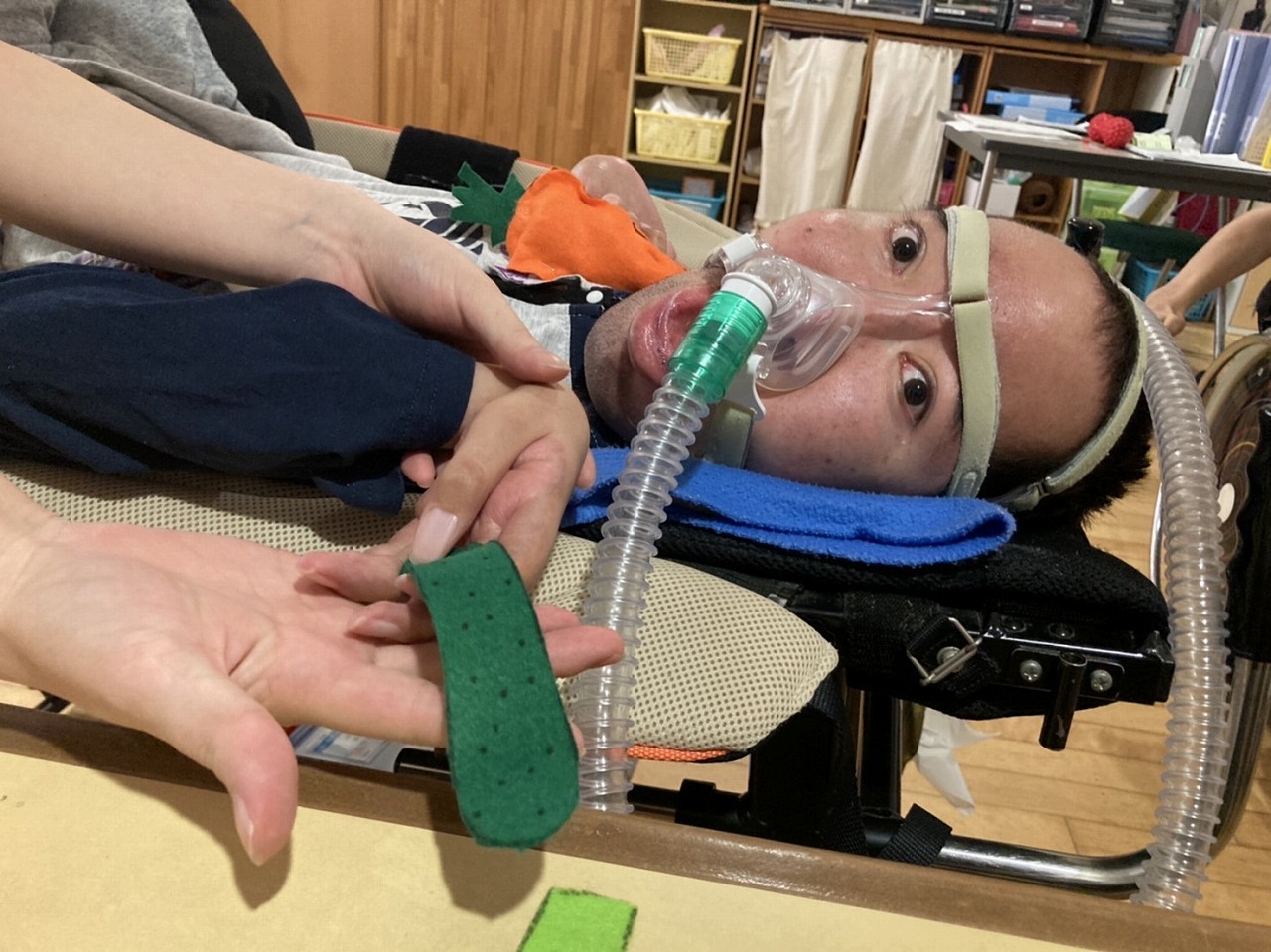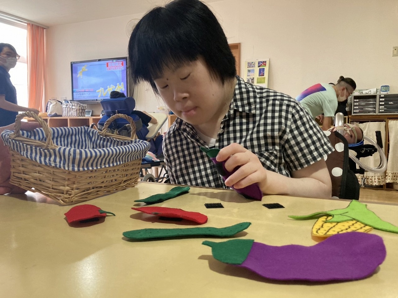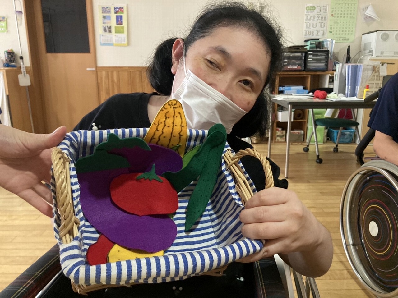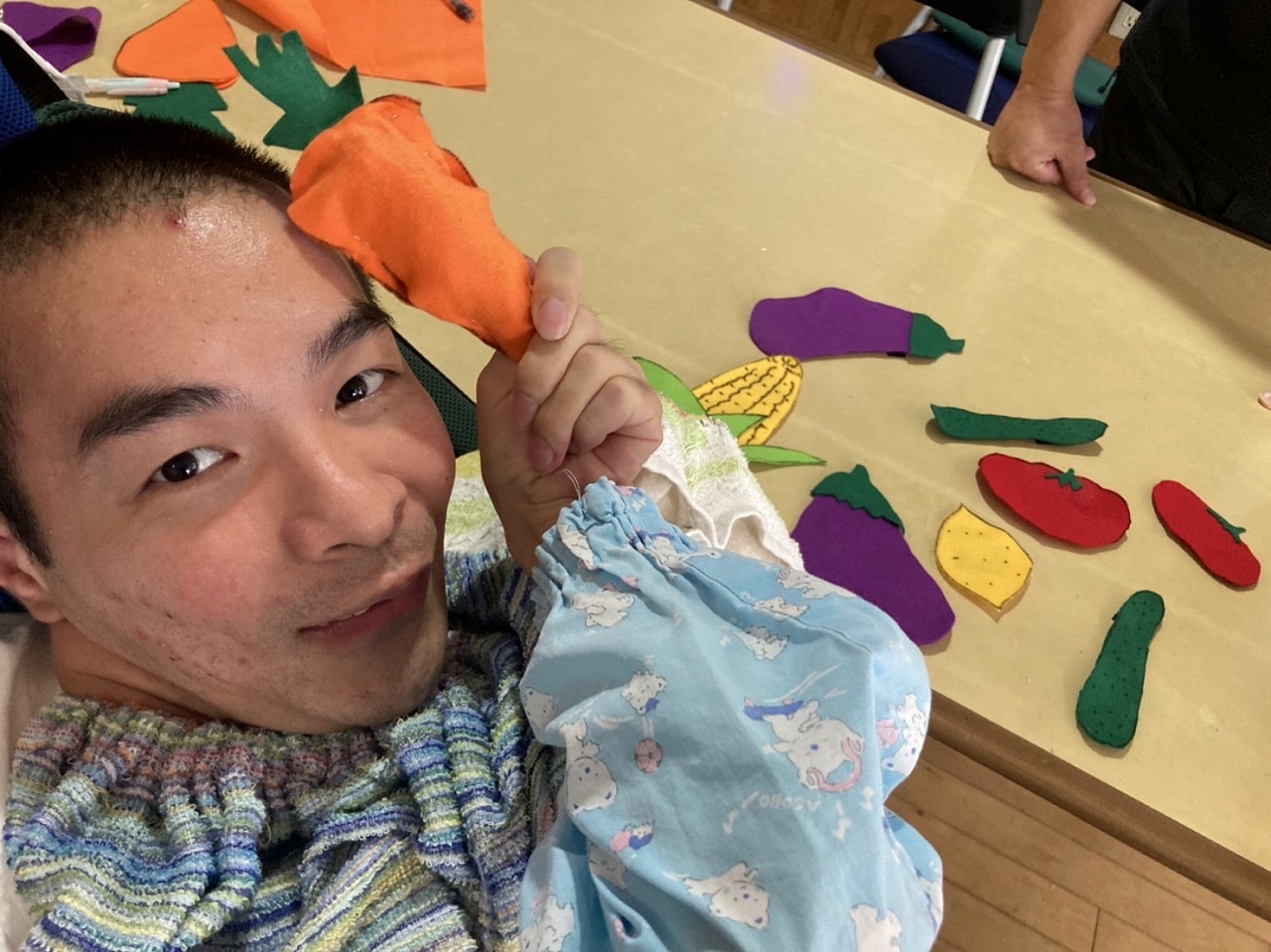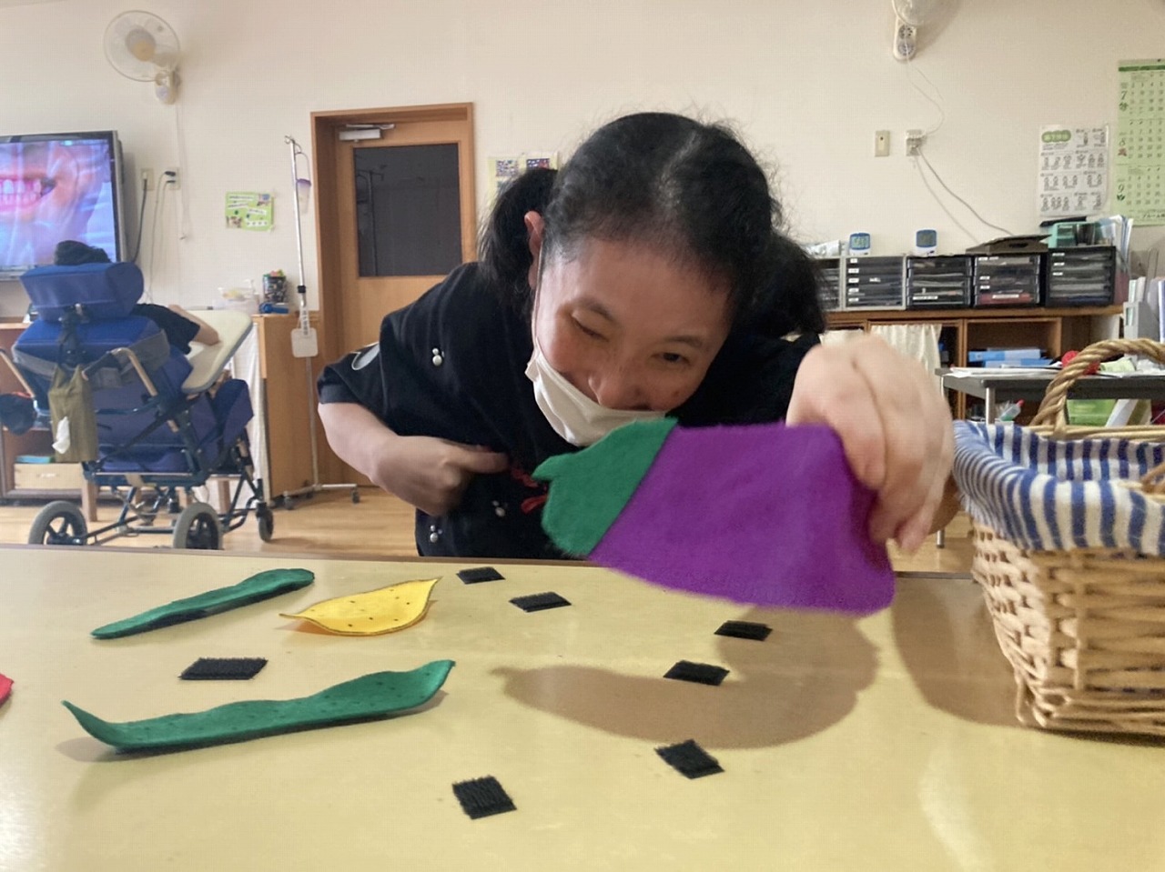 今日はレクリエーション活動で「秋の収穫祭」ゲームを行いました。 好きな野菜を取ってくださいね!と伝えると、「僕はニンジン」「トウモロコシも好き」「トマトときゅうりがいい」と色んな野菜の名前が出てきました。 「楽しいね!」 バリバリッ!とマジックテープが剥がれる音と感触も楽しめるポイントだったみたいです。 あっという間に全ての野菜を剥がされて、かごの中に入れられる方もおりました。 次回のレクリエーションも楽しみにしてくださいね!