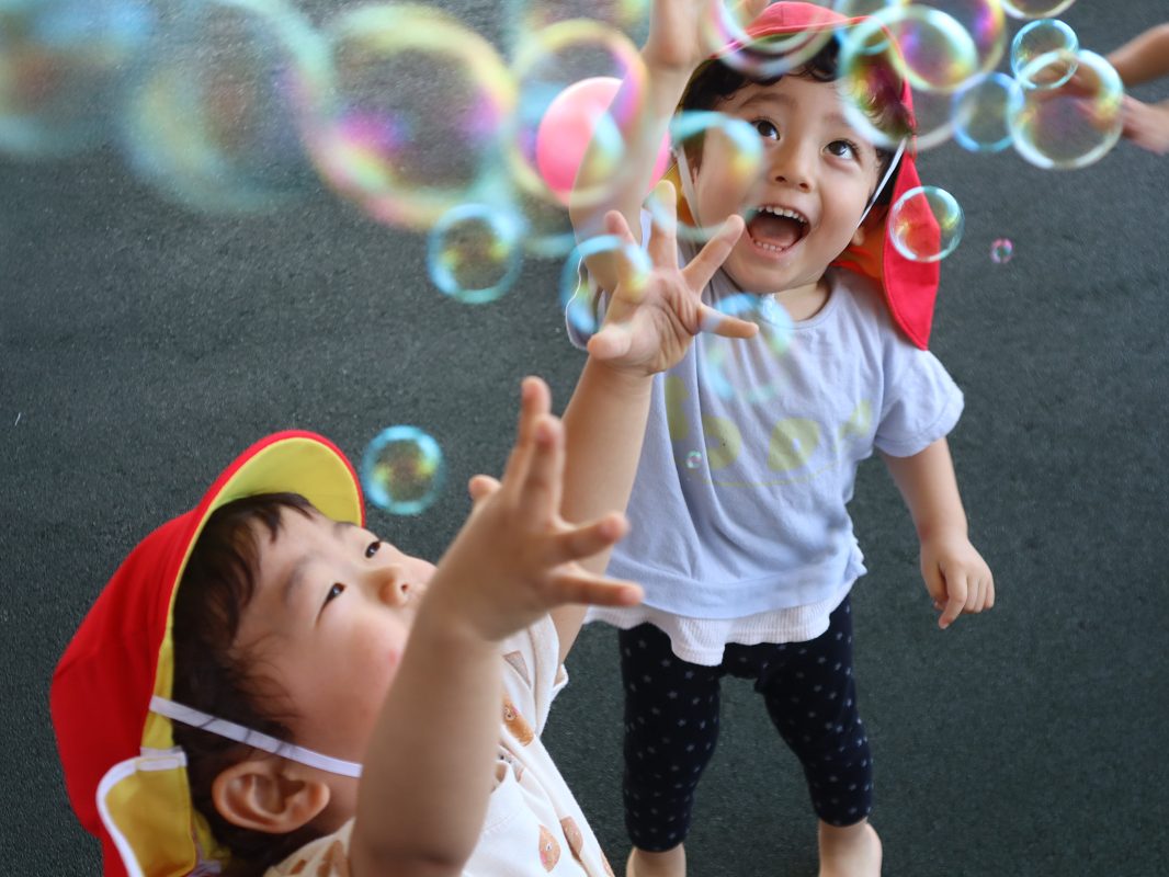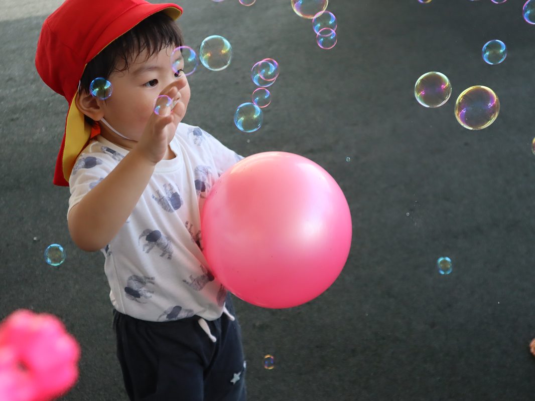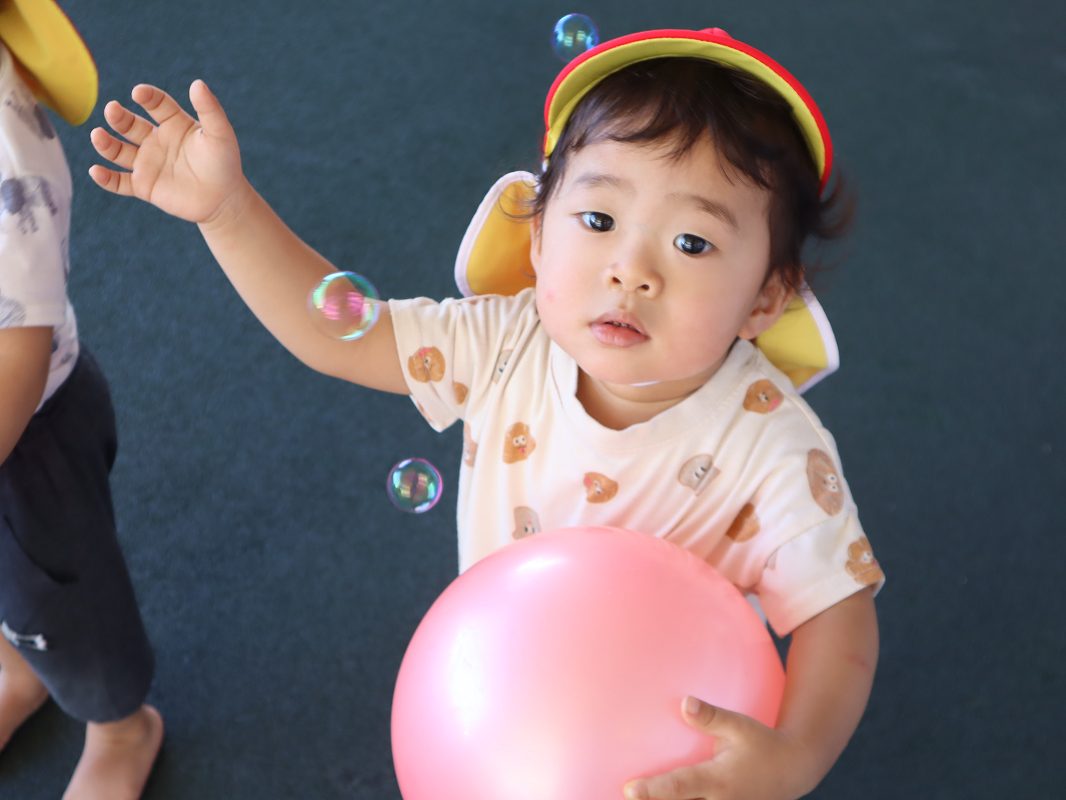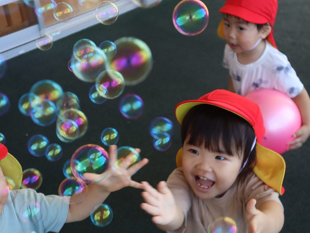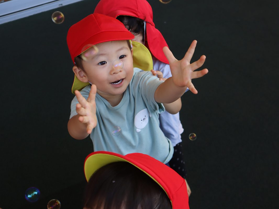 天気がいい日にテラスでシャボン玉を楽しんだこあら組さん。 職員がシャボン玉をプクプクっと出すと、「キャー!」と大興奮! 自由にパチンと叩いたり、フーっと吹いたりと思い思いに楽しむ子どもたち。 片付けの時間になると「またしようね。」「楽しかった~!」と大満足だったようです。 また天気のいい日には、外で体をいっぱい動かして遊ぶことができるようにしていこうと思います。