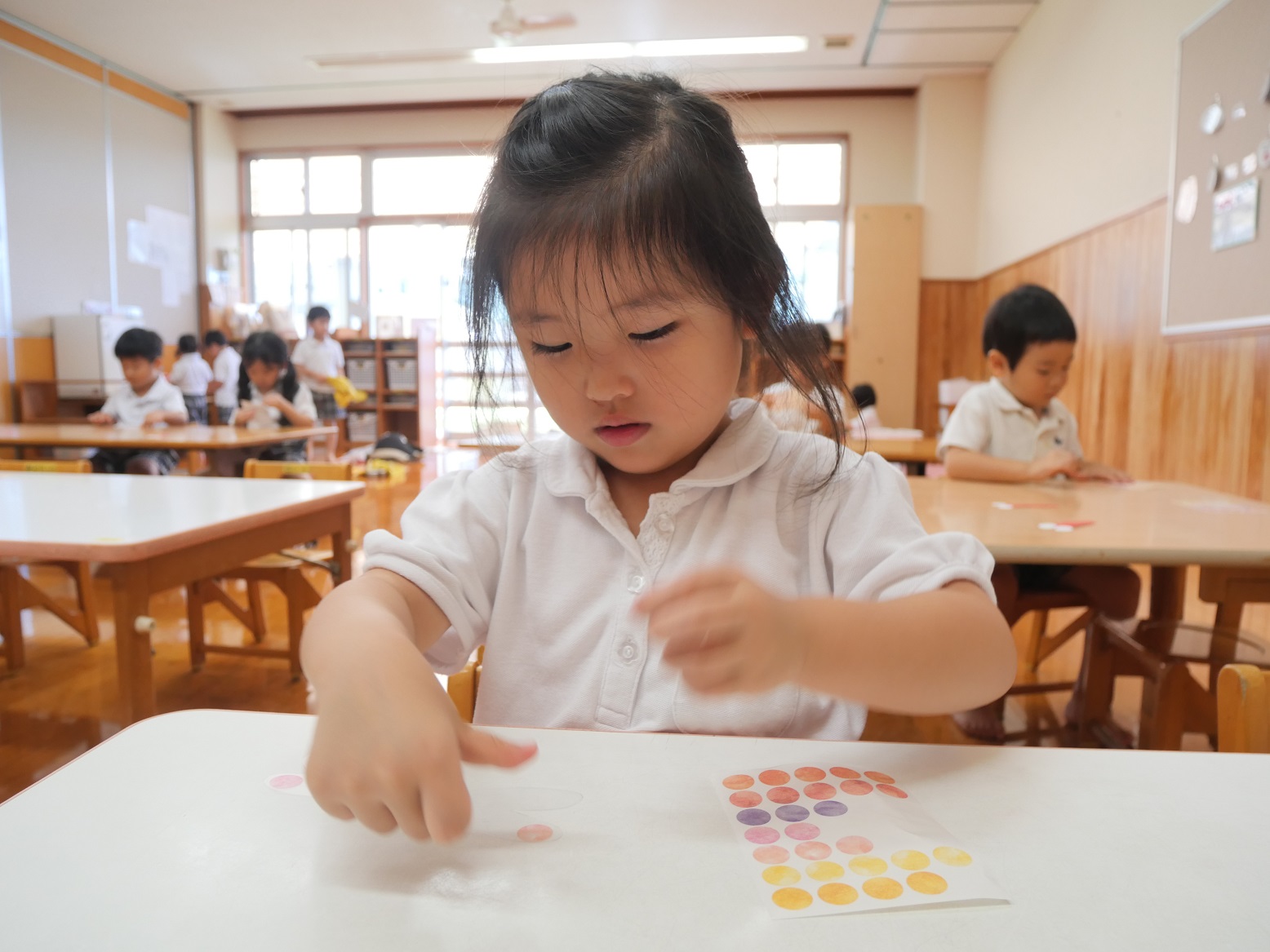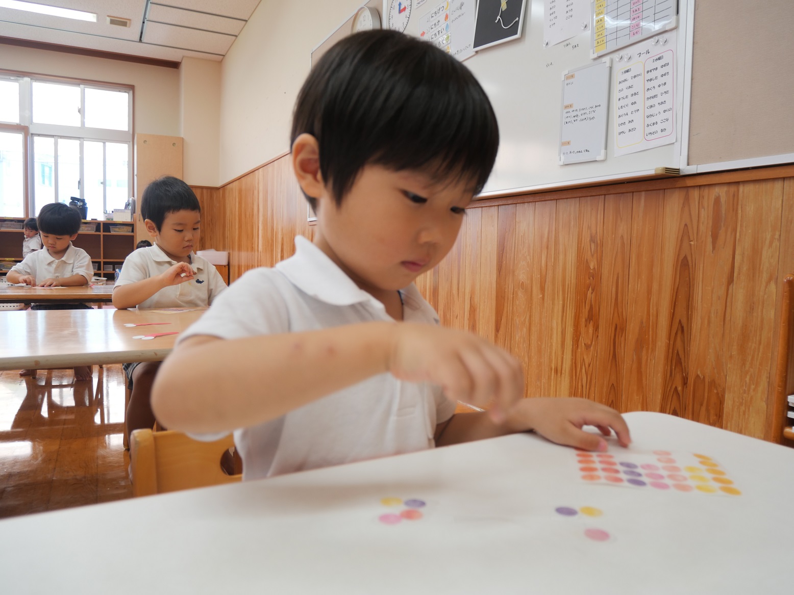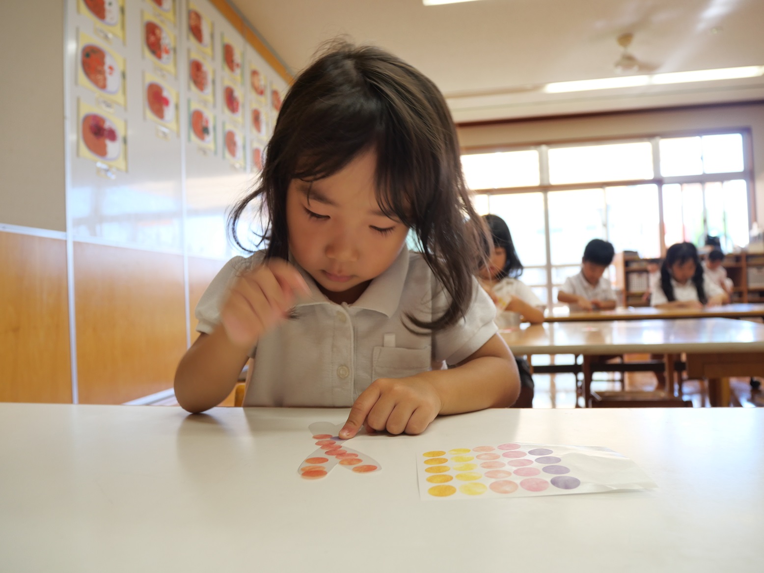 たくさんの丸シールを貼っていき、個性豊かな羽を作っていくりす組さん。