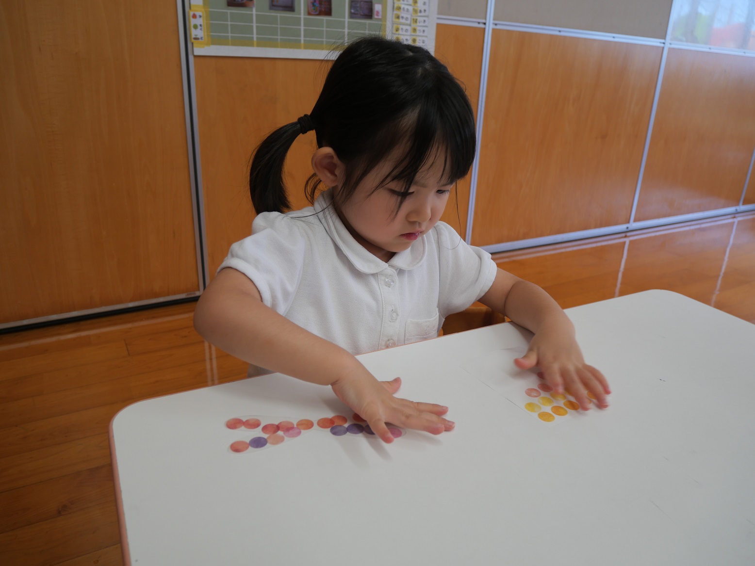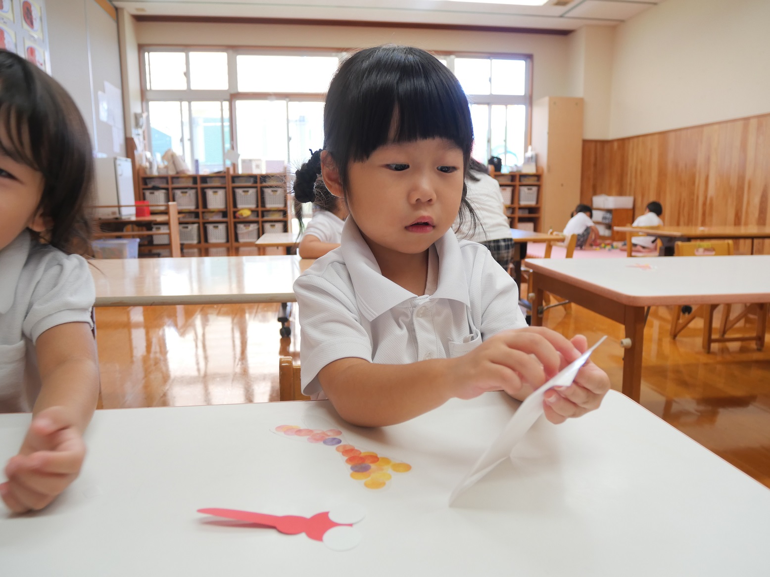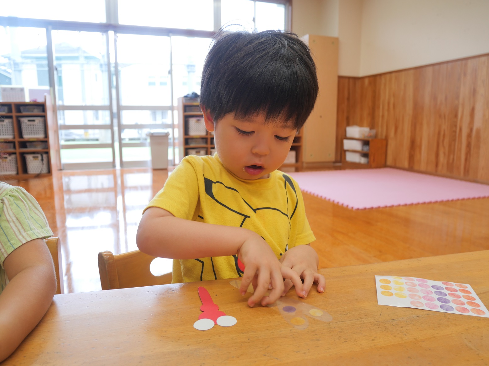 「赤色の羽になったよ。」「私はカラフルにしちゃおう!」と、自由に貼り進めていく姿が見られました。