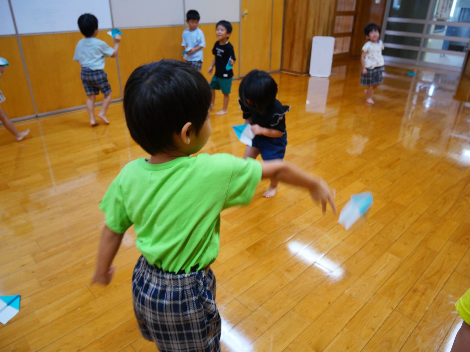 自分だけの紙飛行機を何度も何度も飛ばしていくうさぎ組さん。「見て!遠くまで飛んだよ!」「あんまり飛ばなかった」と結果は様々でしたが、楽しそうに遊ぶ姿がたくさん見られました。