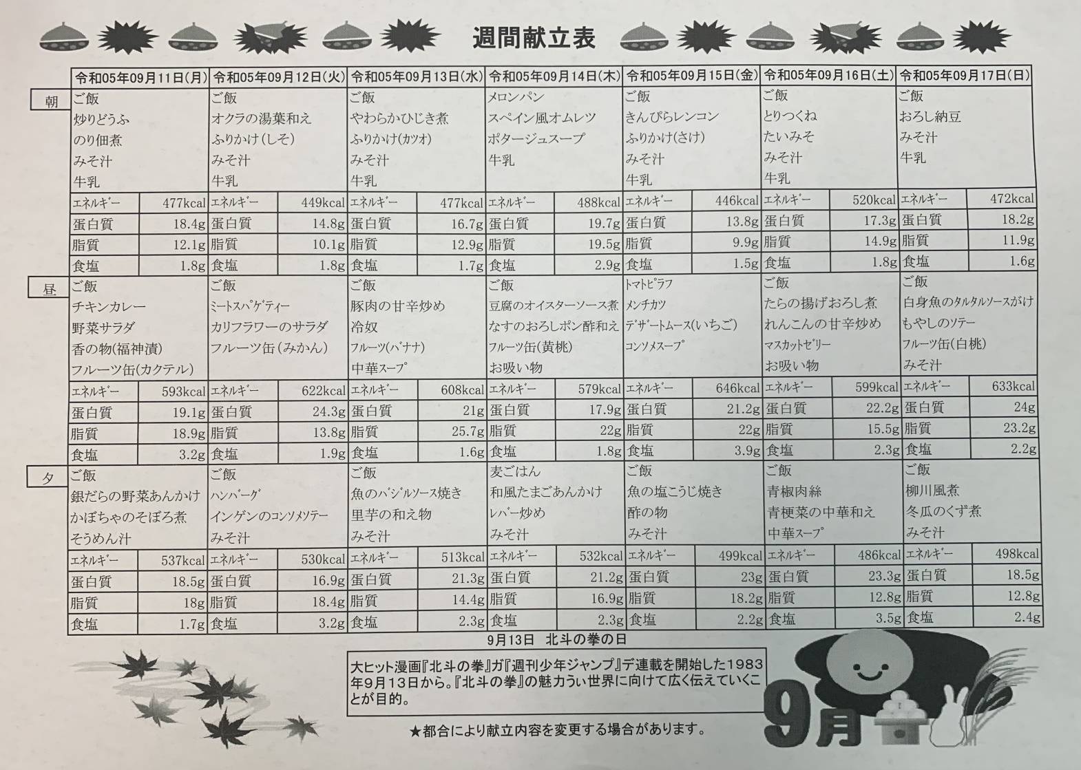 9月11日(月)~9月17日(日)の献立表です。是非ご覧ください。
