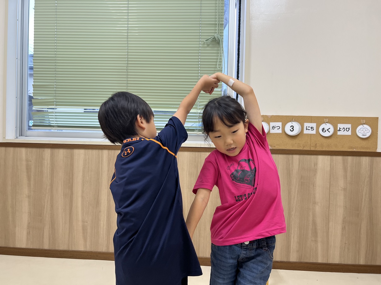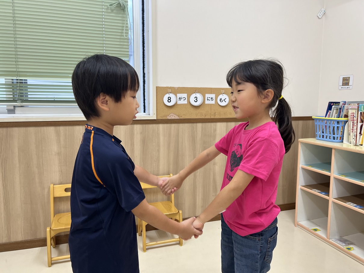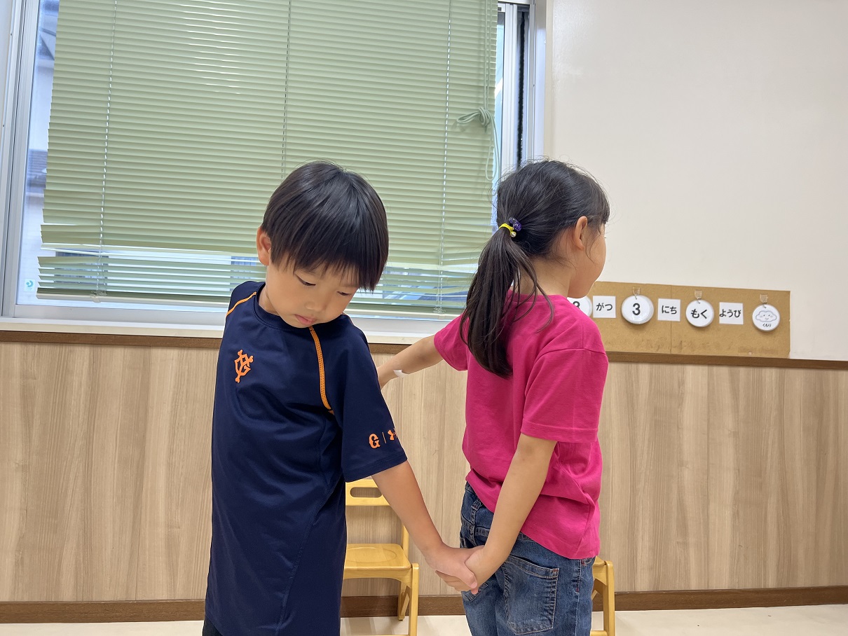 なべなべ底抜けというゲームに挑戦しました。 最初は回転する方向が合わずに、「あれ?あれ?」と迷う様子も見られていましたが、お友だちと一緒に、「右から回ろう!せーの!」と声を掛け合うことで、回転することができるようになりました☆ 歌のスピードを変えたり、先生と一緒にしたりと様々な方法で楽しみました! これから昔の遊びもたくさん取り入れていきたいと思います♪