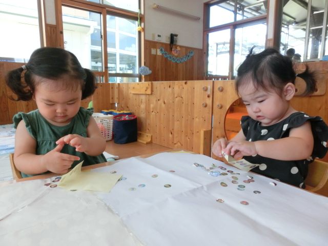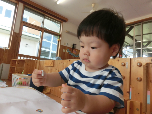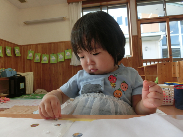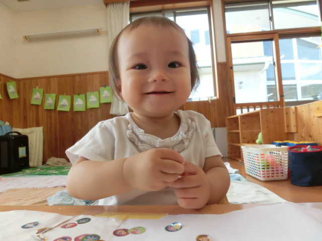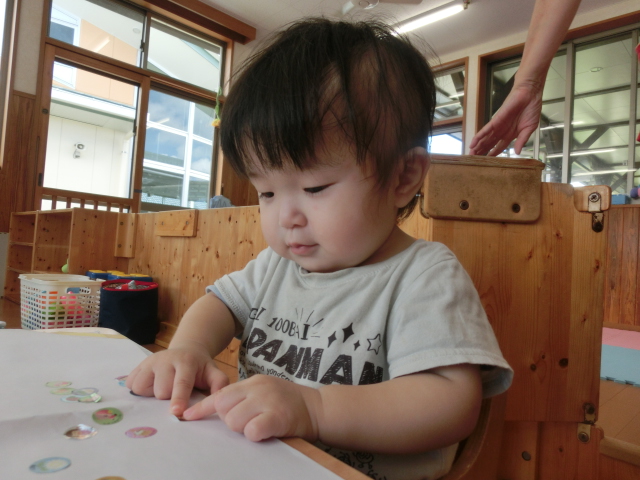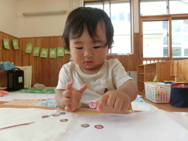 最近、指先を使った活動に挑戦している子どもたち! 今回は、シール貼りを行ってみました。保育者がシールを一枚渡してみると、 「お?」、「あっ!」と手にシールがくっつくことを不思議そうにする姿が見られました。 また、「ここにぺったんだよ!」と見本を示すと、紙に貼ろうとする子どもたち。 保育者と一緒に貼ったり、子どもたち自身で貼ったりすることを楽しみました♪ 今後も、手先を活用した活動を取り入れていきたいと思います!