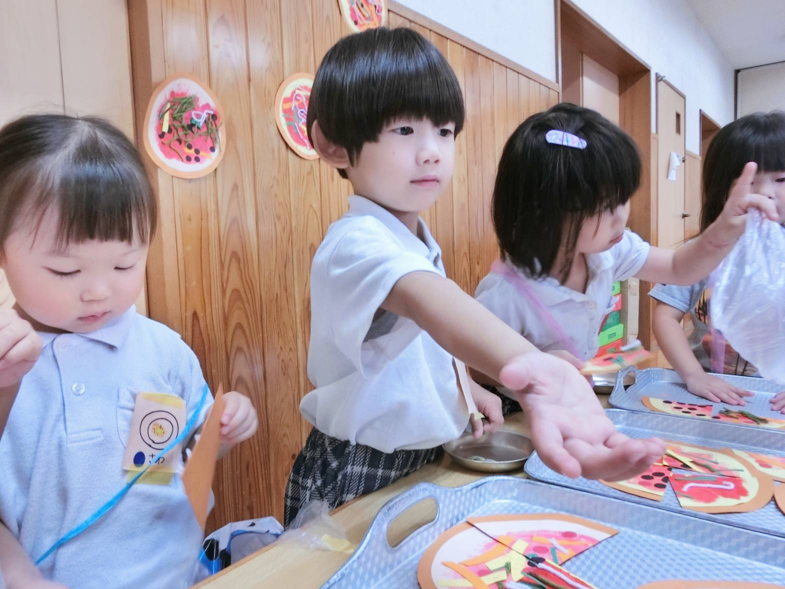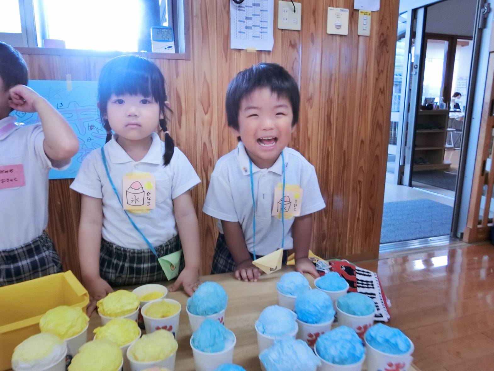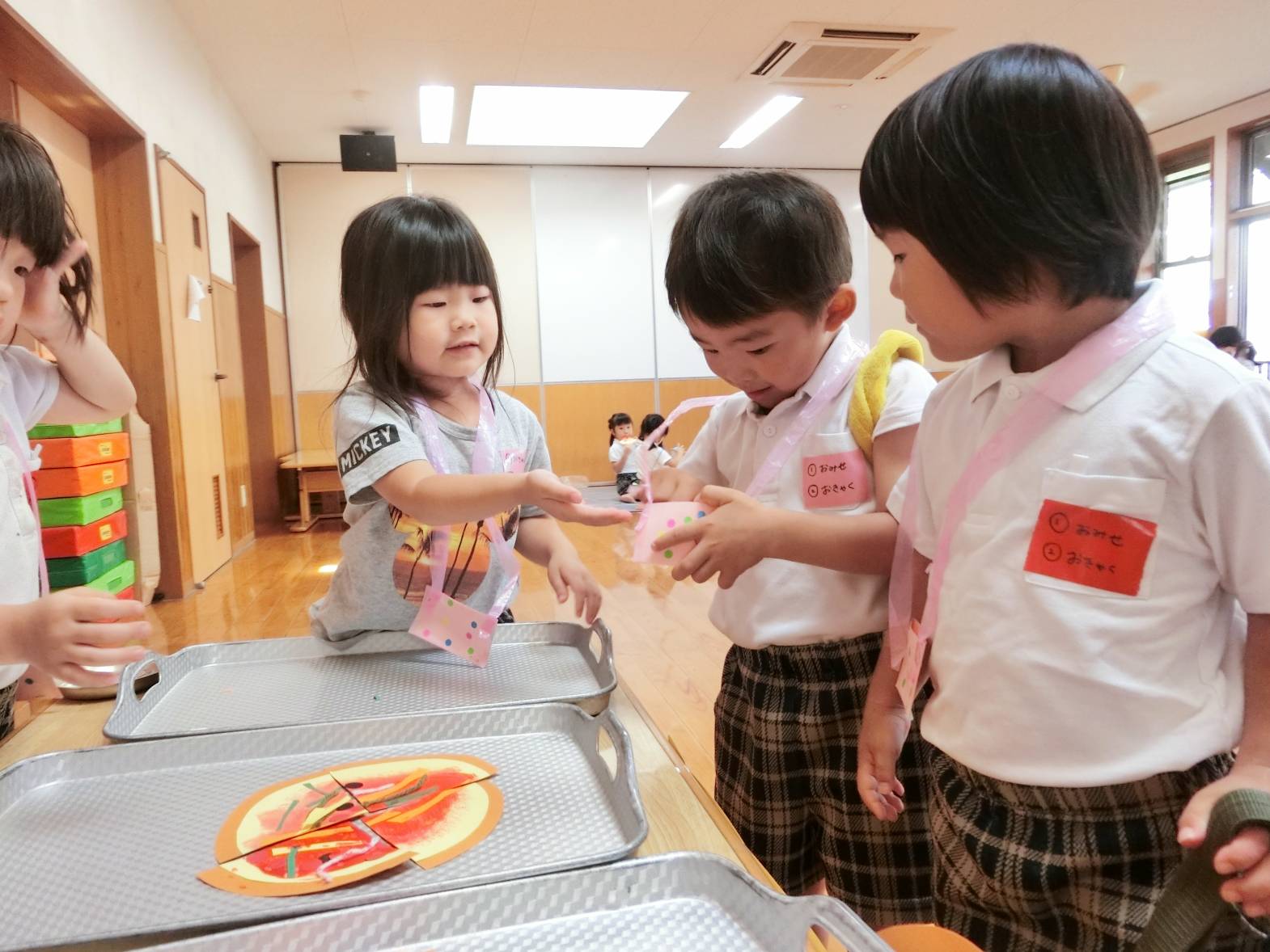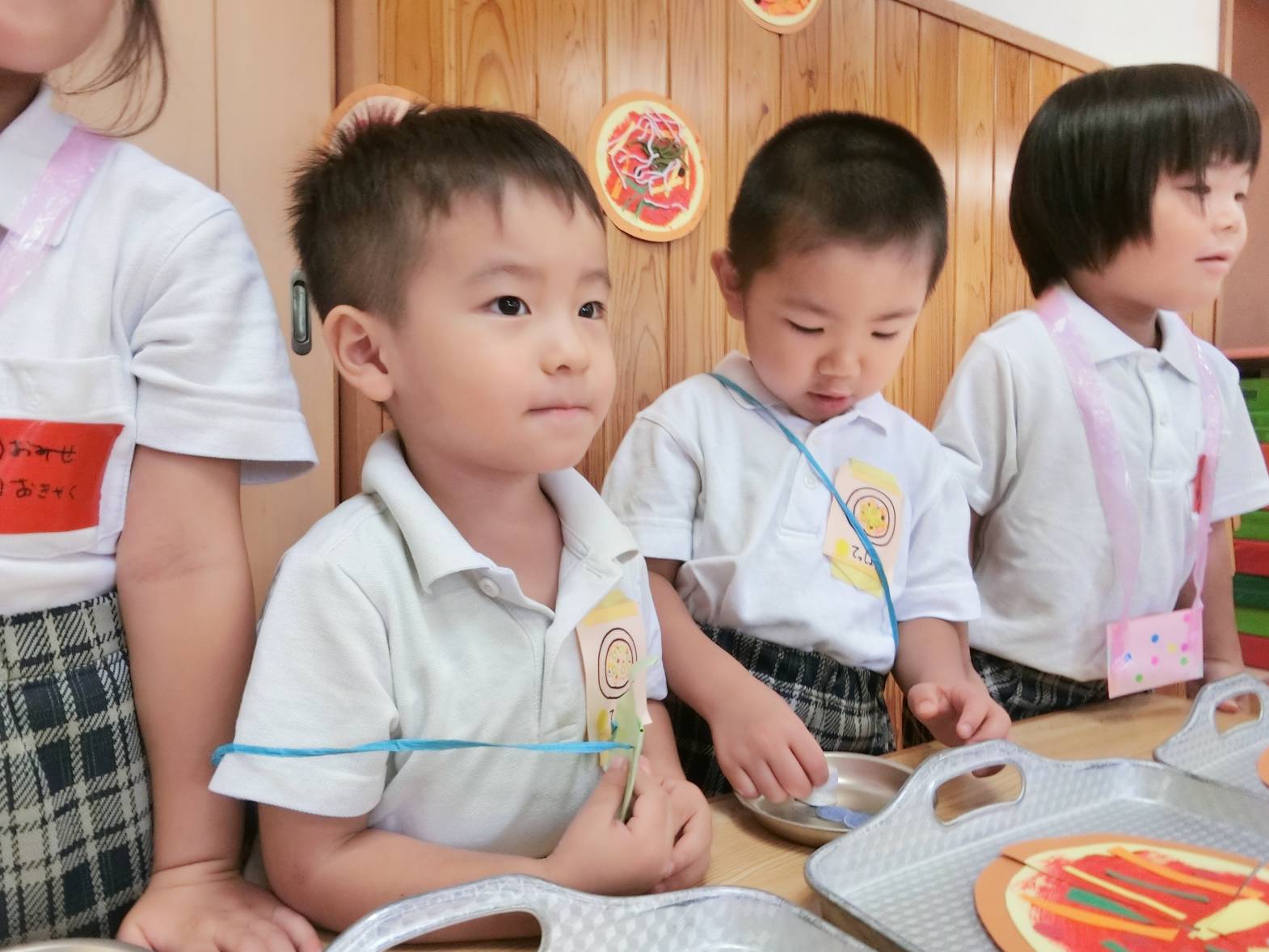 お店屋さんは、ピザ、かき氷、チョコバナナ屋さんがあり。りす組さん、うさぎ組さんの担当です。