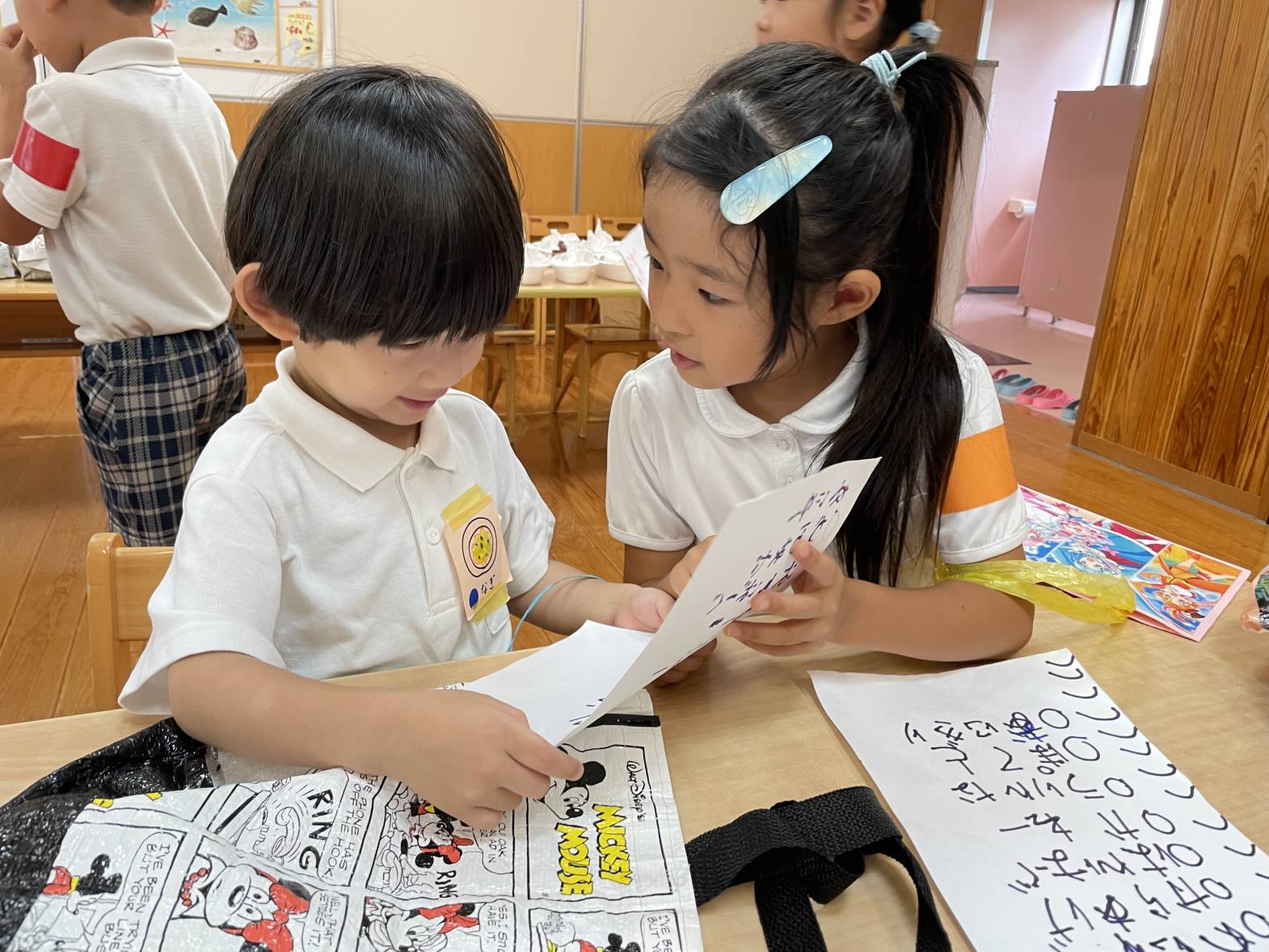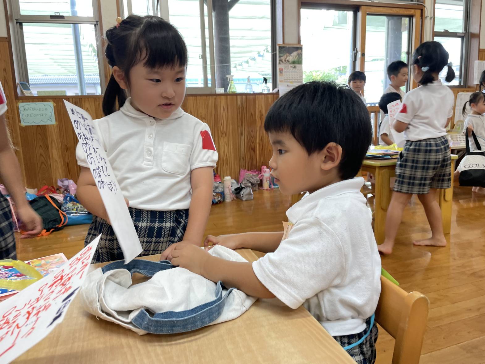 「一緒にしようね。」、「いらっしゃいませっていうんだよ。」とりす組さんに優しく教えてあげるうさぎ組さん。