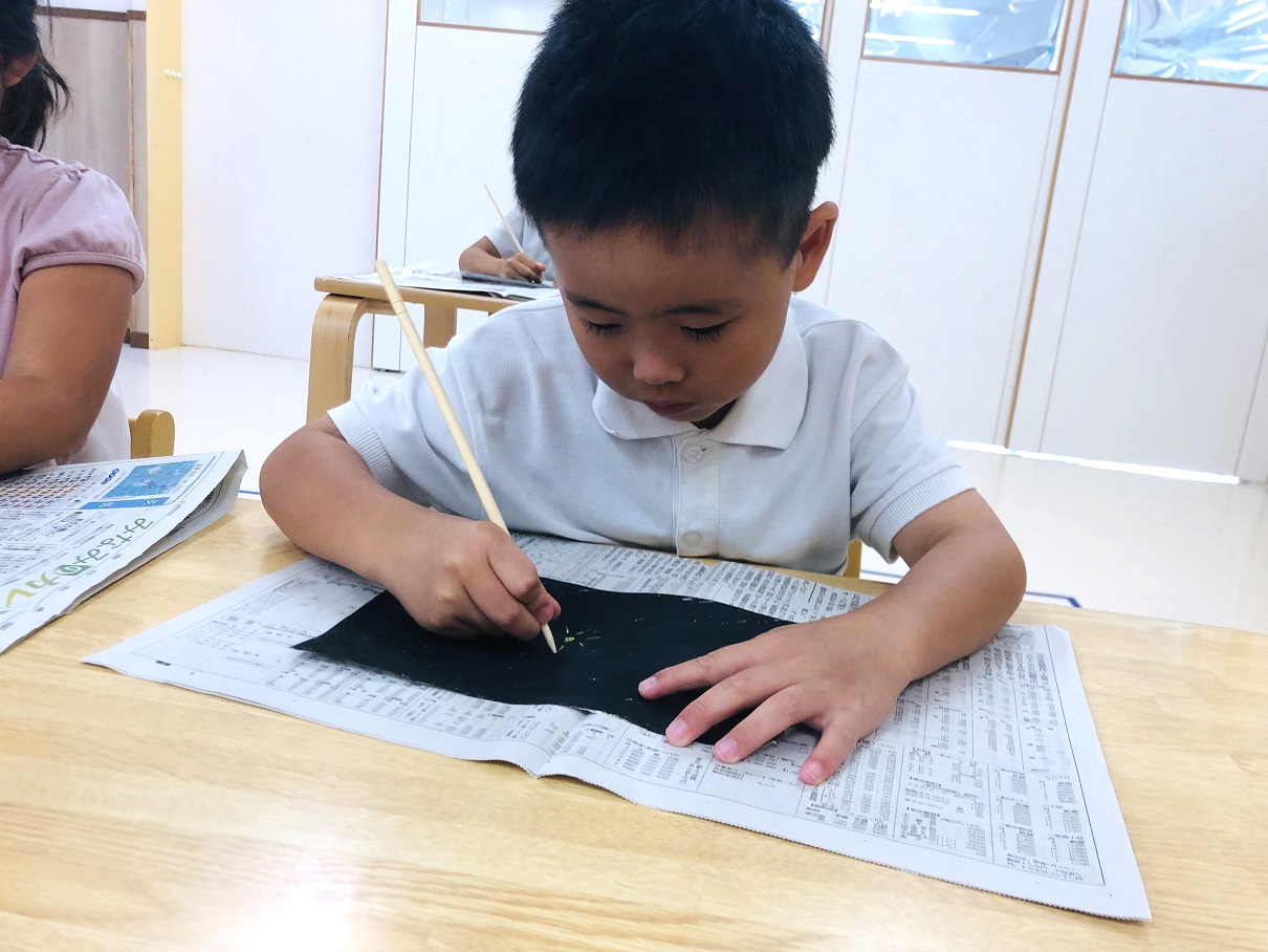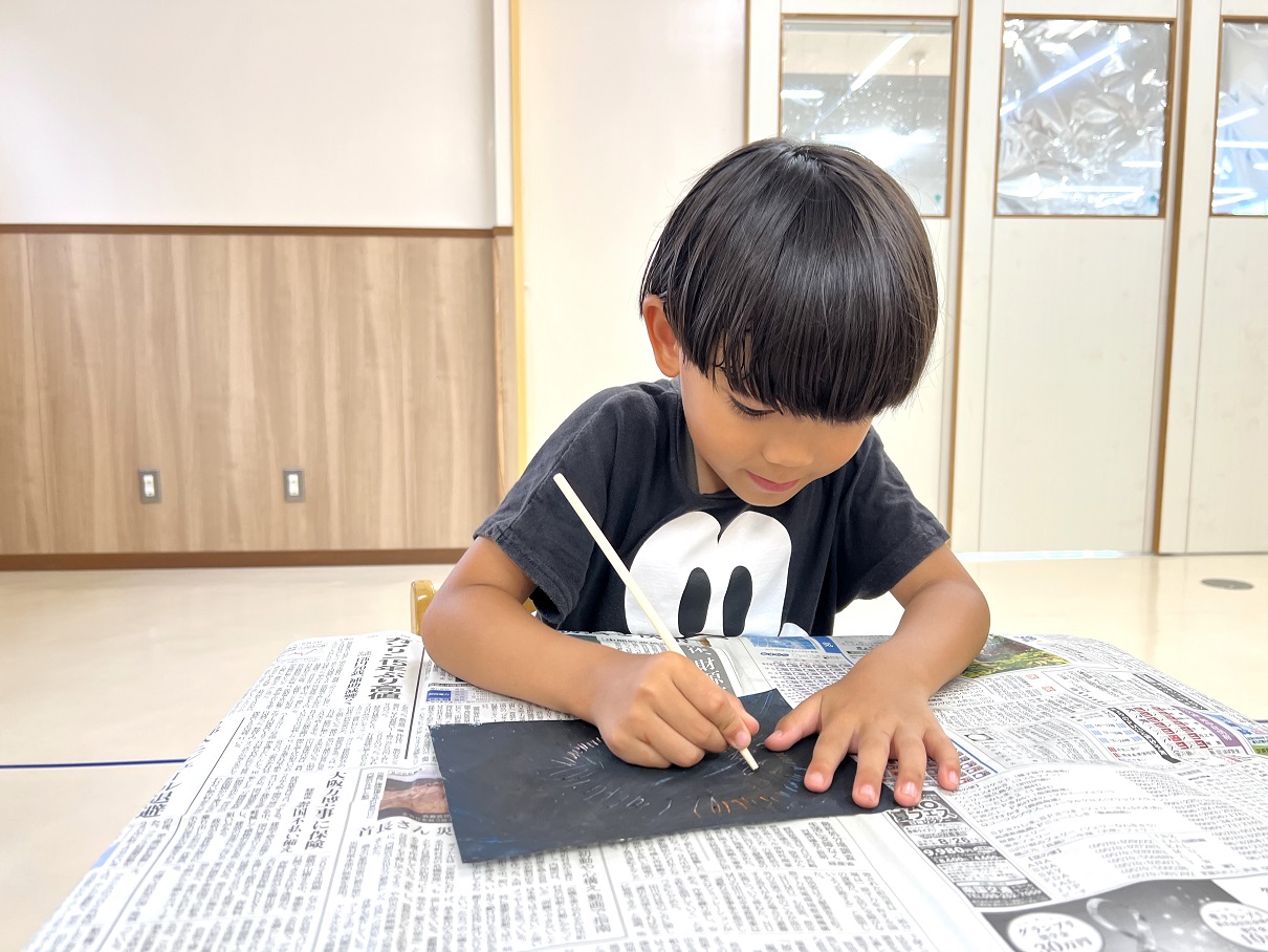 今月のお話し会は、『花火』をテーマにした絵本の読み聞かせや、スクラッチアートを行いました。