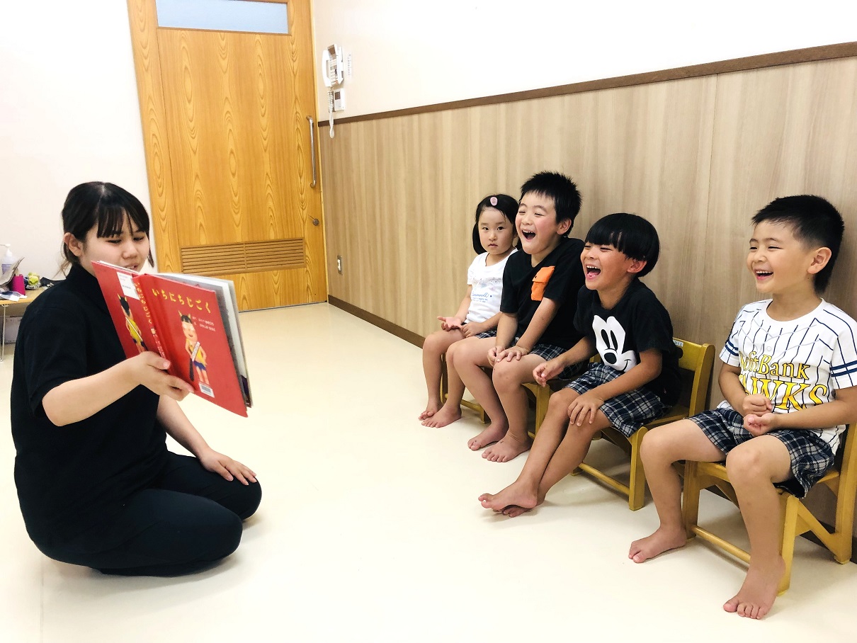 絵本の読み聞かせでは、面白い絵本や綺麗な花火の絵本など子どもたちは興味津々!