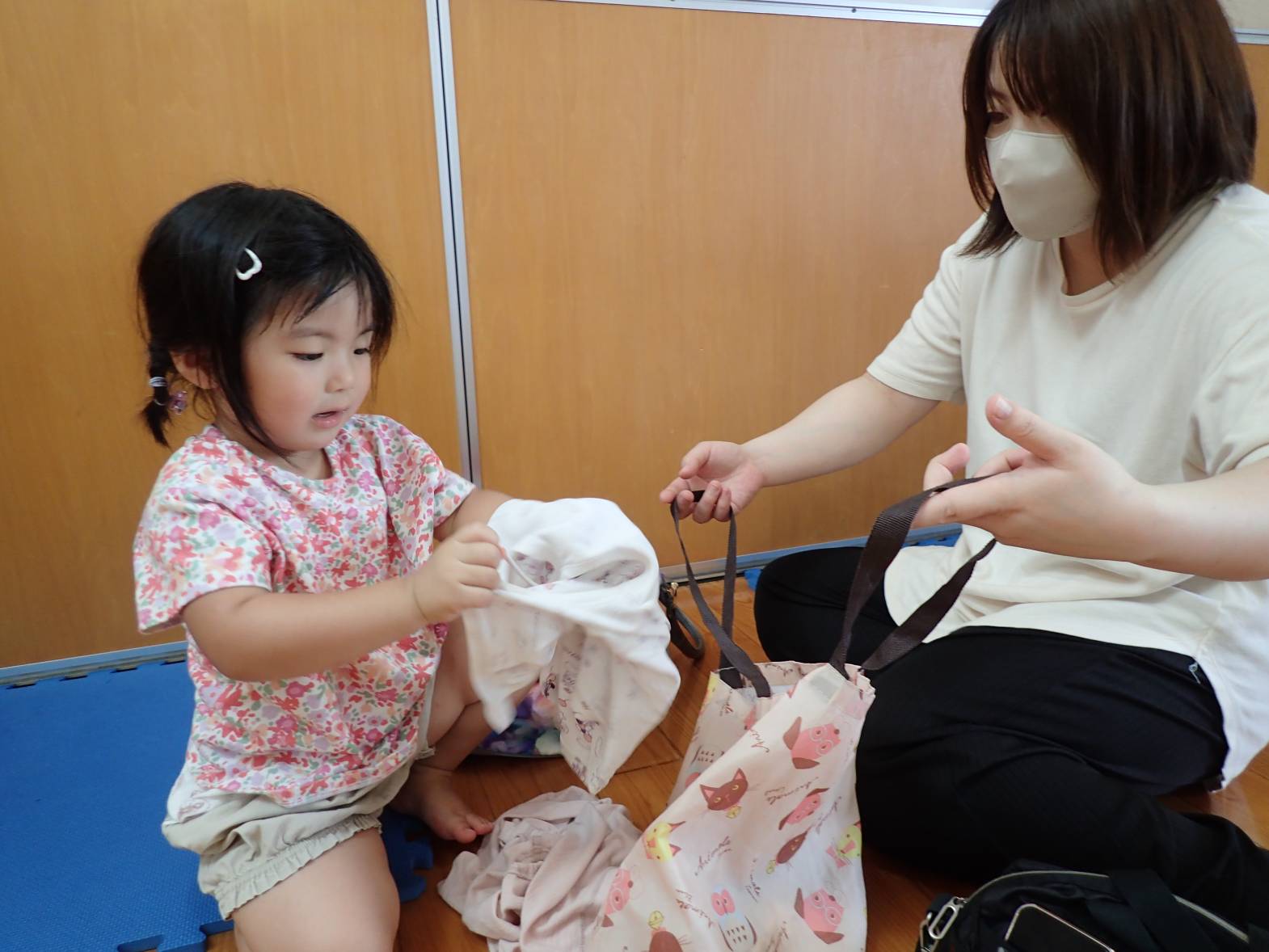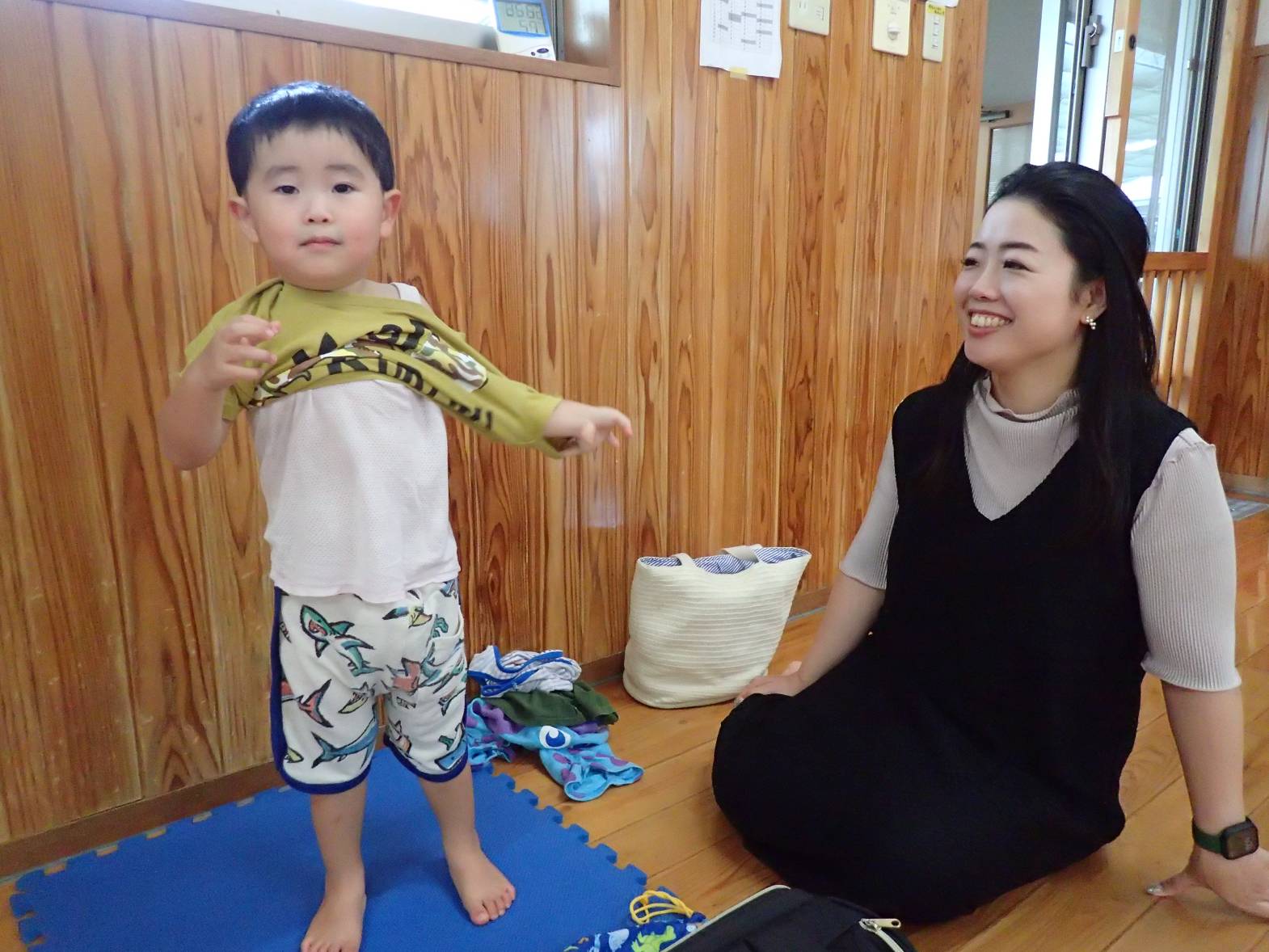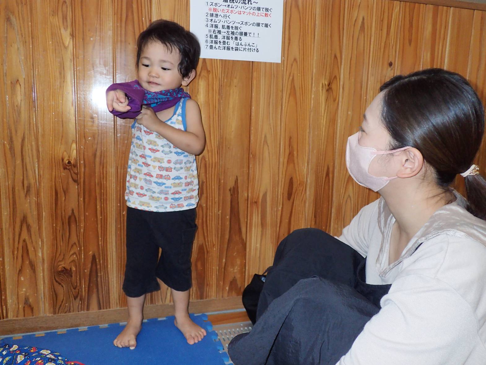 着脱では、「トイレでおしっこ出たよ!」、「ズボンできたよ!」とトイレでの排尿に成功したり、自分でズボンやTシャツを着たりするととても嬉しそうな子どもたち。