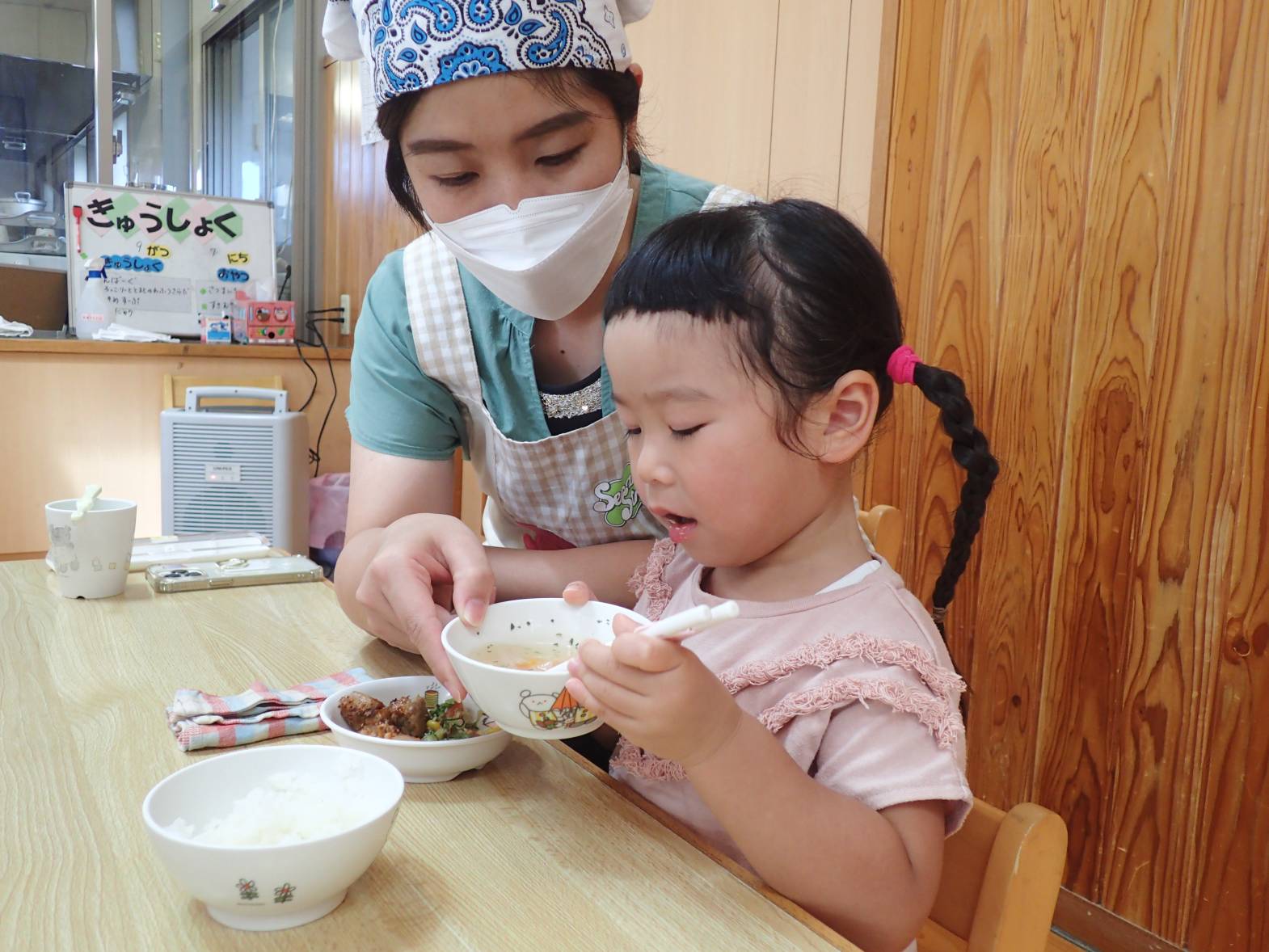 食事では、スプーンの持ち方や姿勢を確認しながら食べ進めていきます。