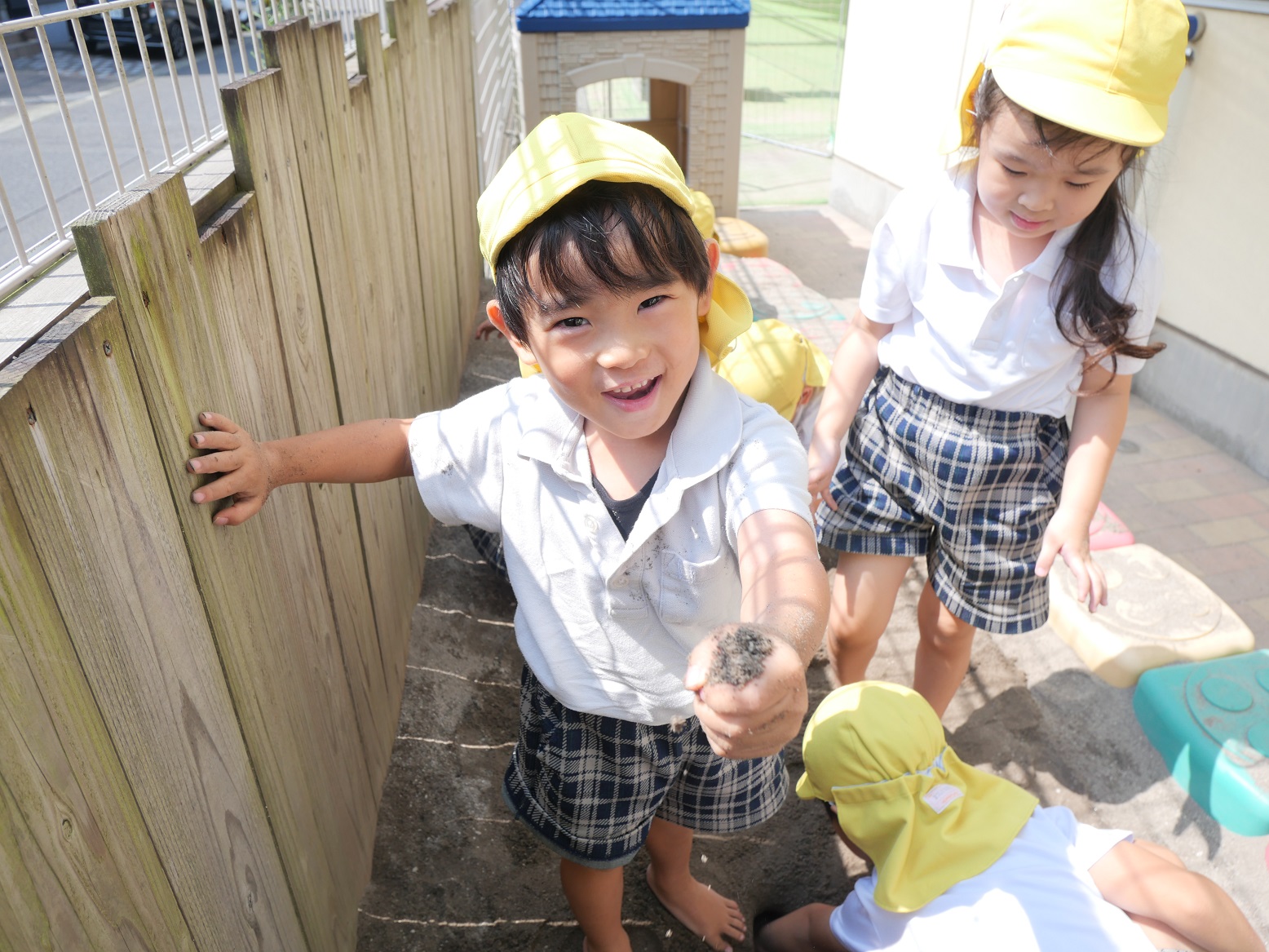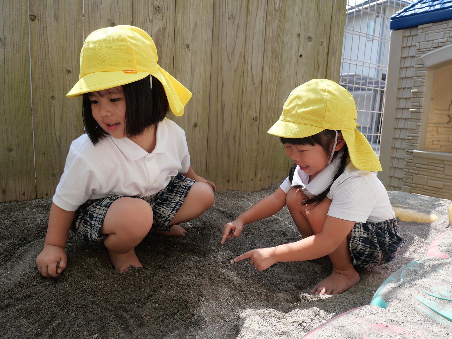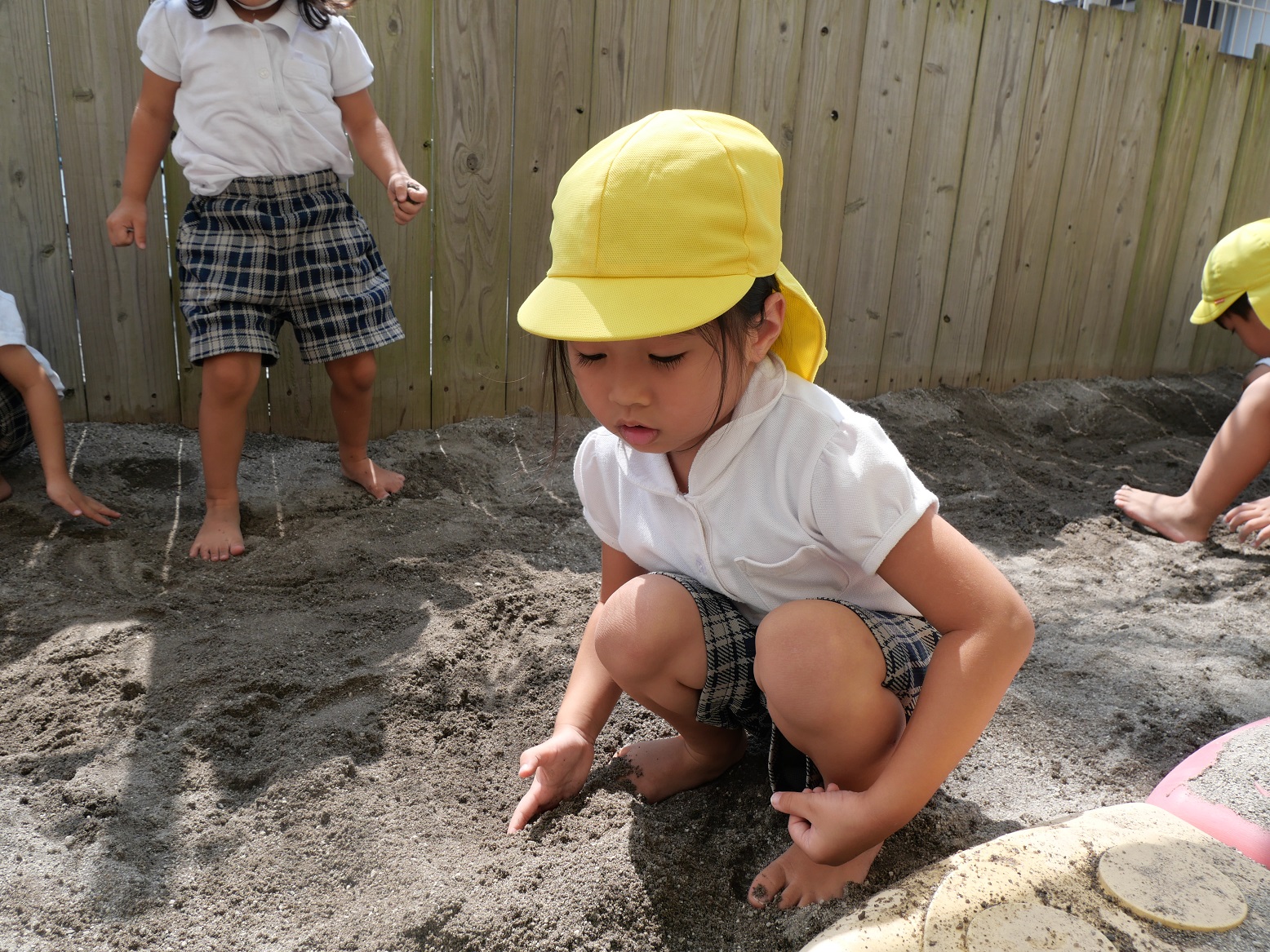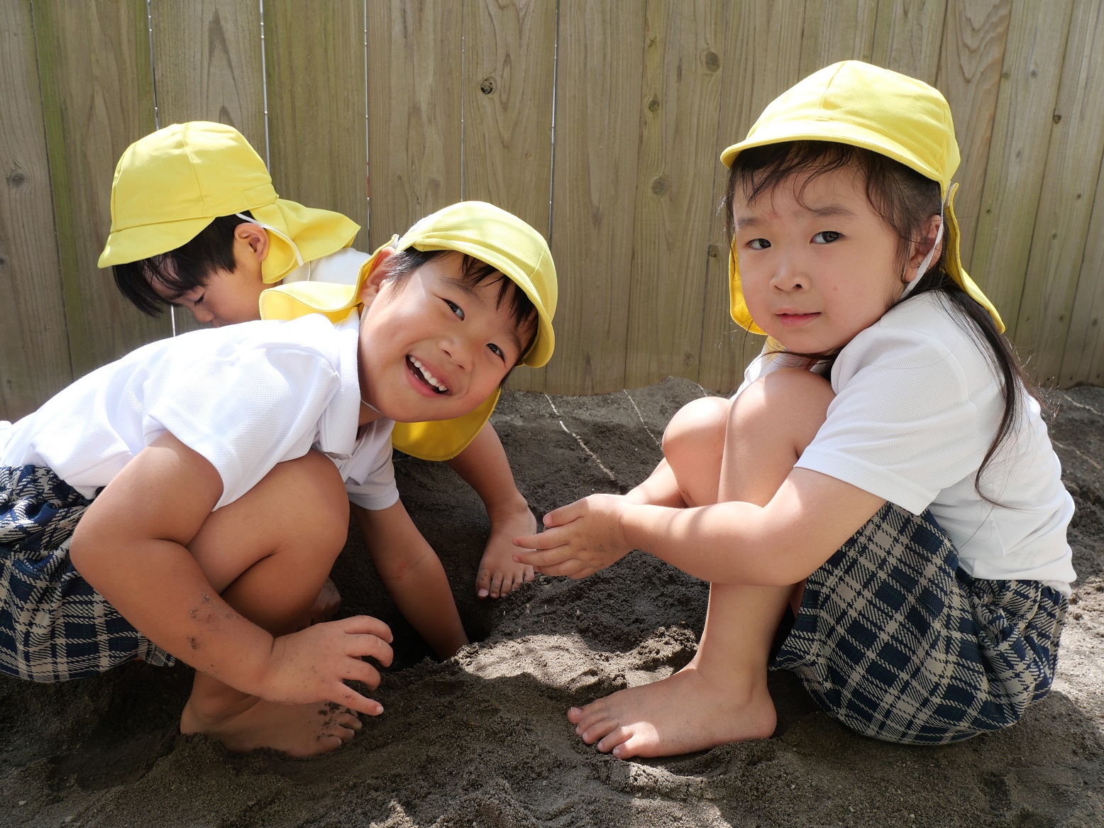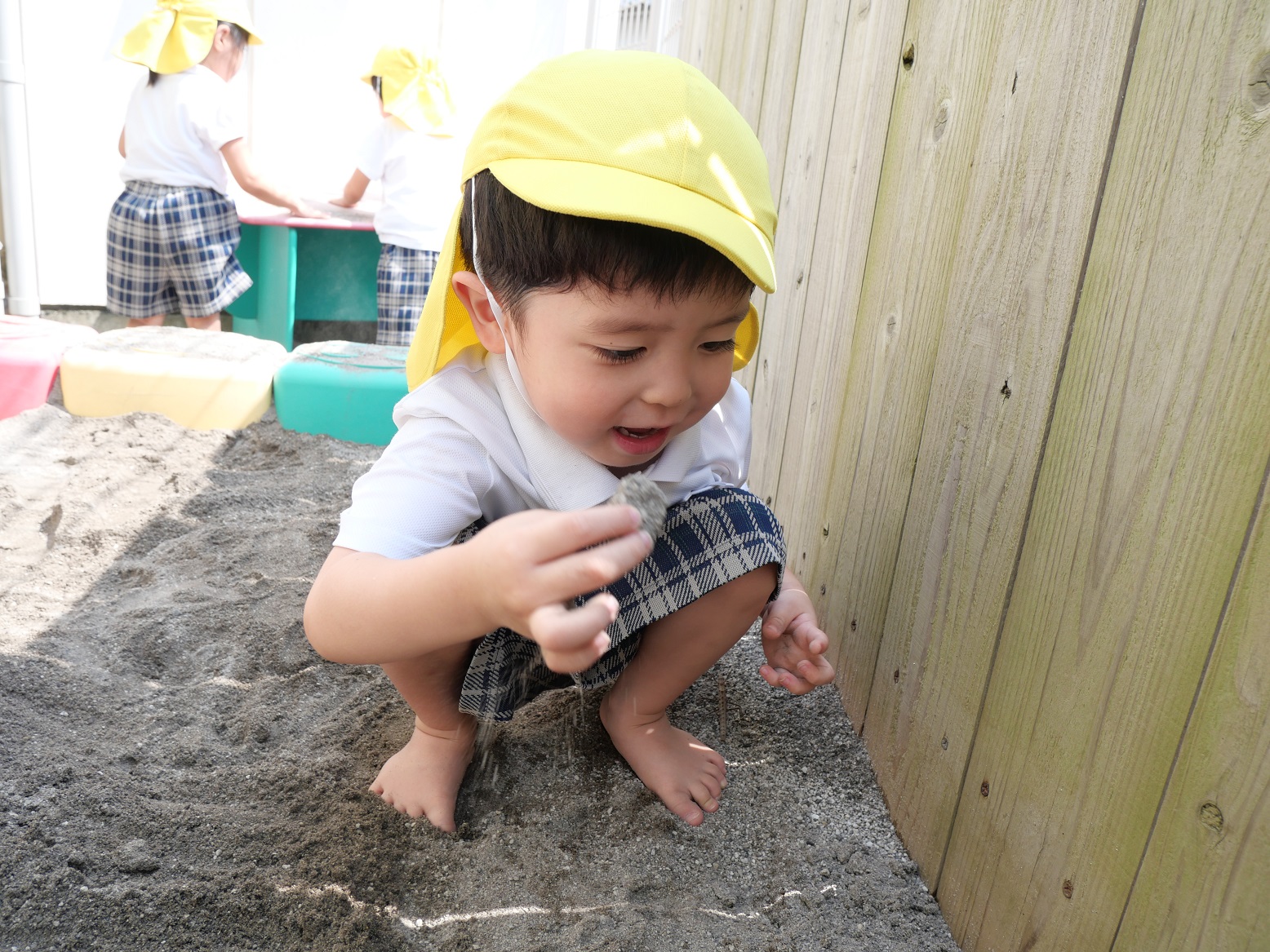 砂場では砂を集めて山を作ったり、穴を掘って遊んだりする姿が見られます。