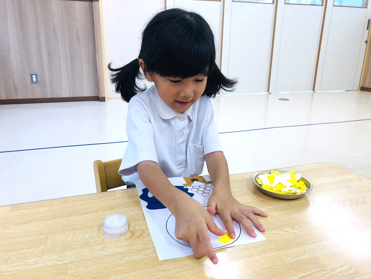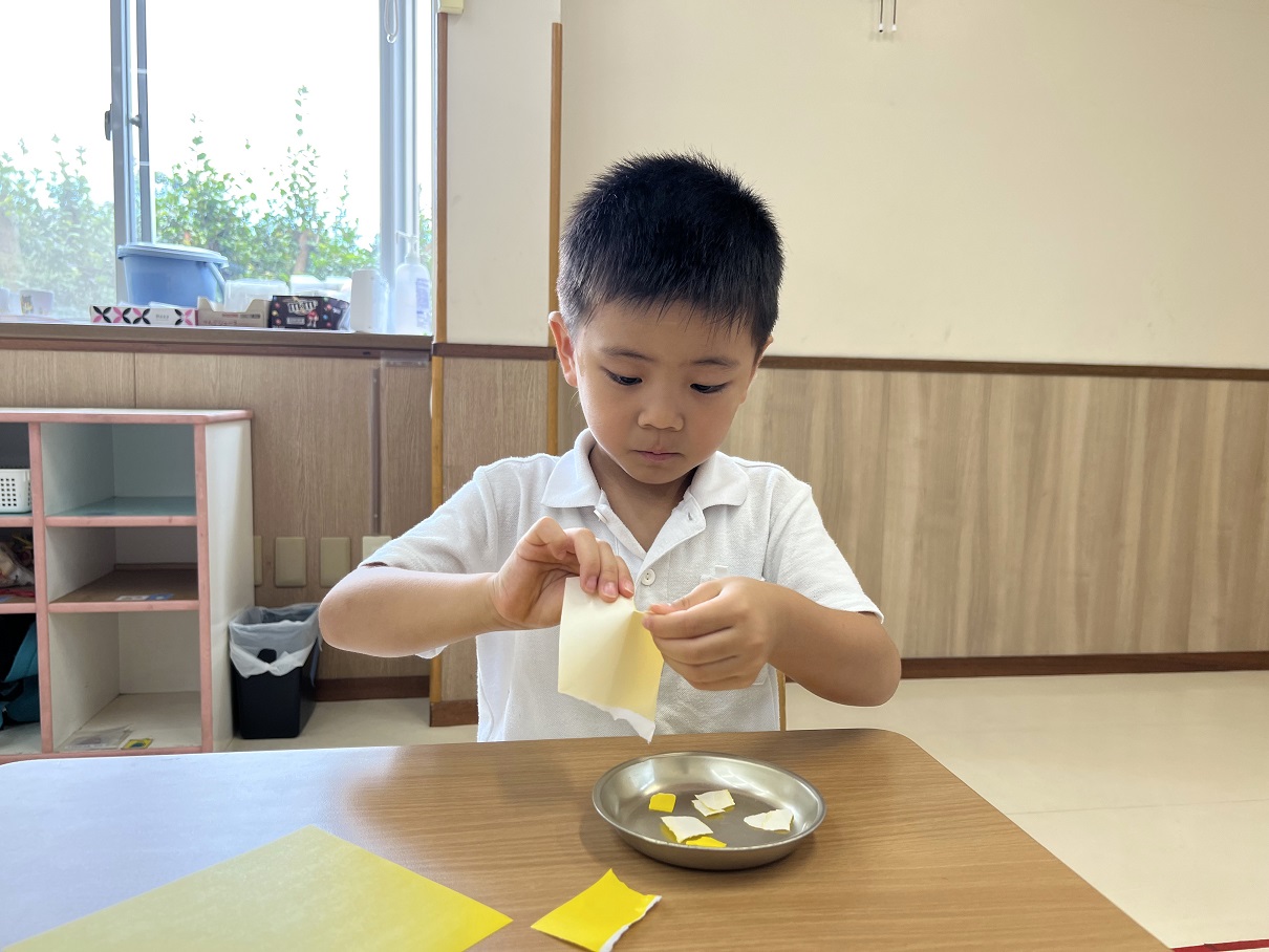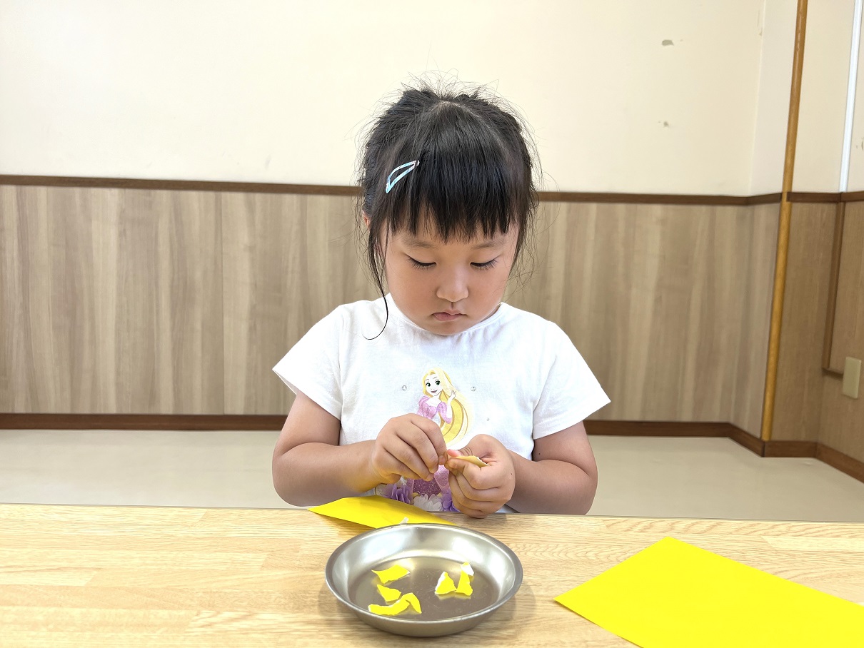 目的である、指先を使って折り紙をちぎるということも意識しながら、黄色の折り紙をちぎっていく子どもたち。
