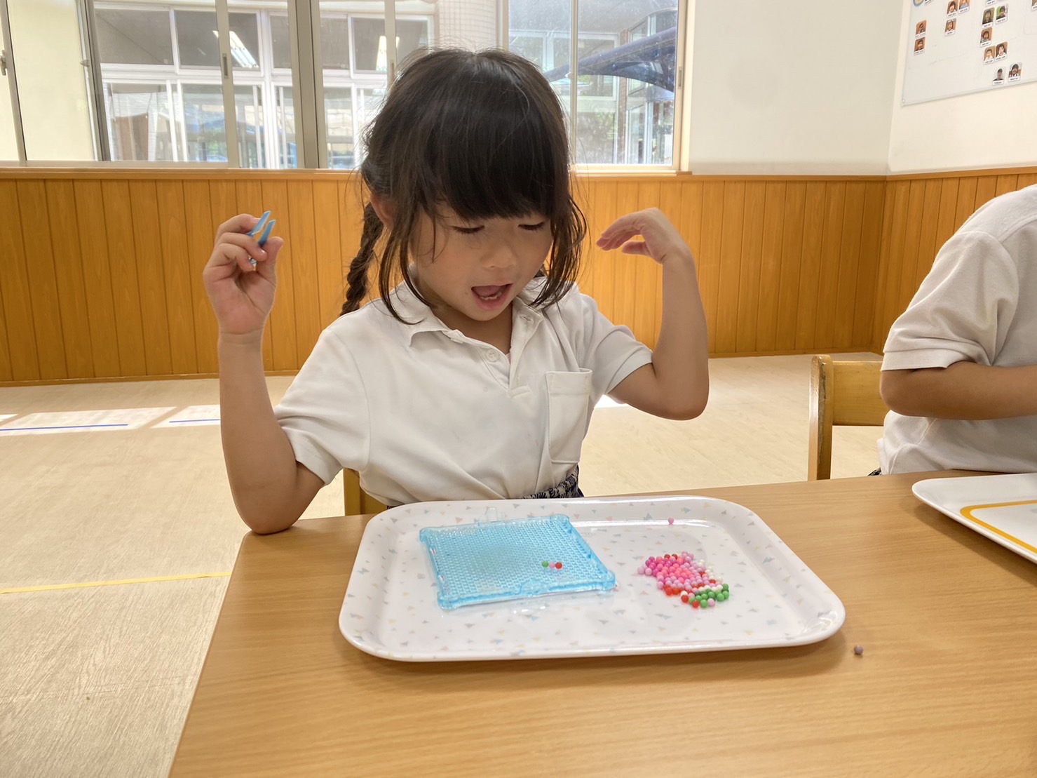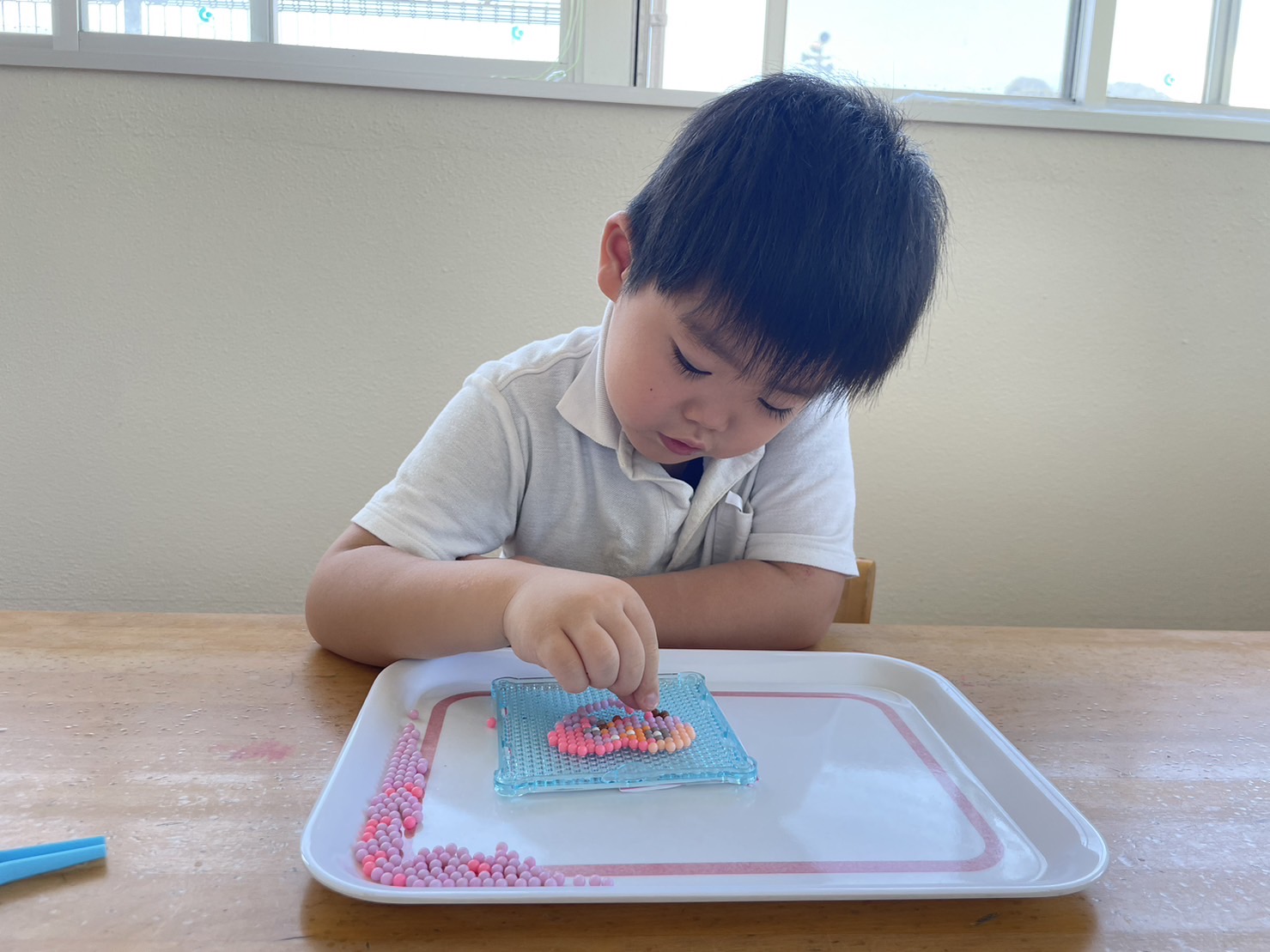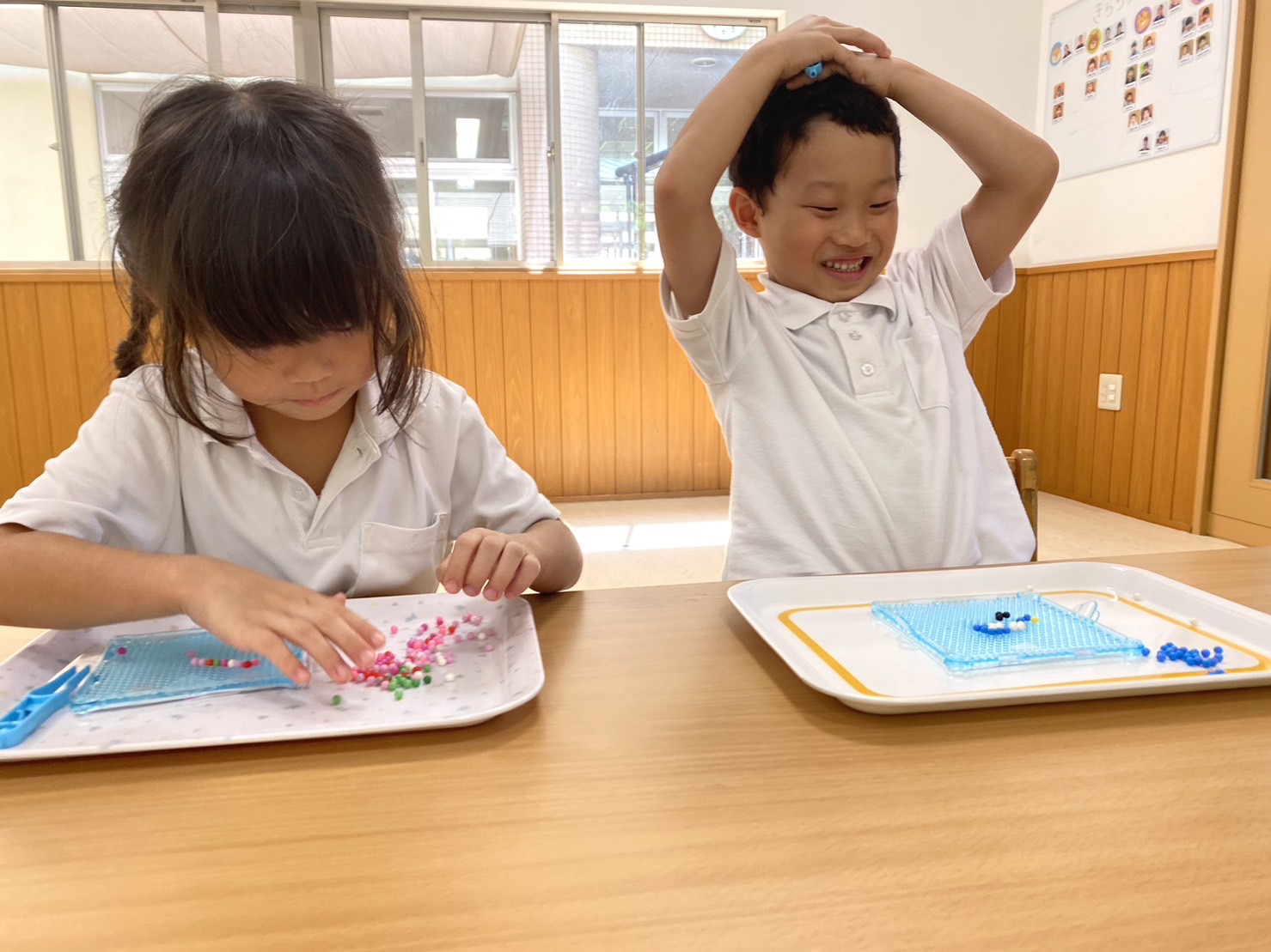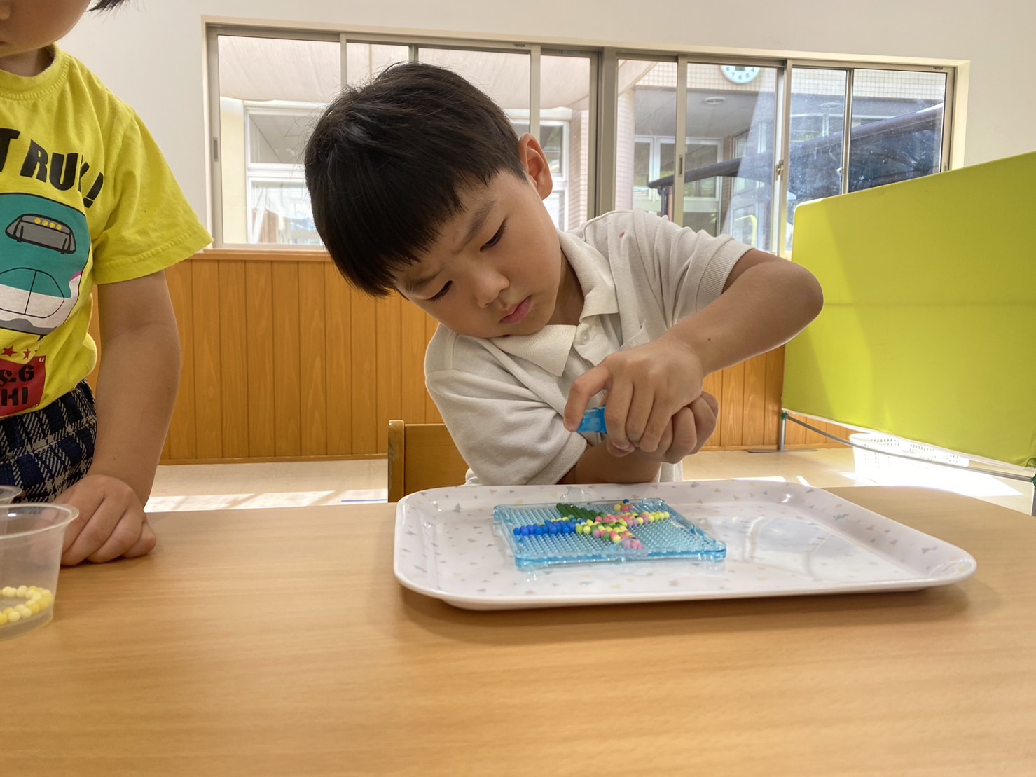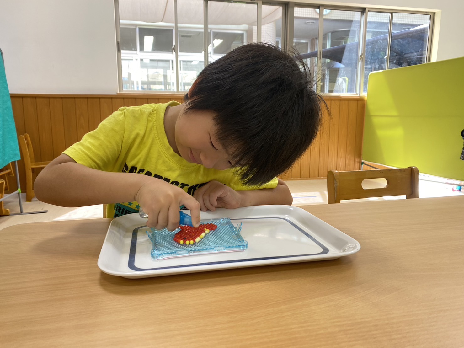 アイロンビーズをしました! 小さいビーズをピンセットや指先で掴み、台紙の色に合わせて置いていきます。1つ置くことにとても集中する姿が見られ、「置けた!」とその都度笑顔も見られましたよ。 完成するまで諦めずに取り組み続ける子どもたち。全部置き終わった後は、スプレーで水をかけて固めました。スプレーをするのも壊れないように慎重にかける姿が見られましたよ。 完成したのを笑顔で持ち帰る子どもたちでした♪