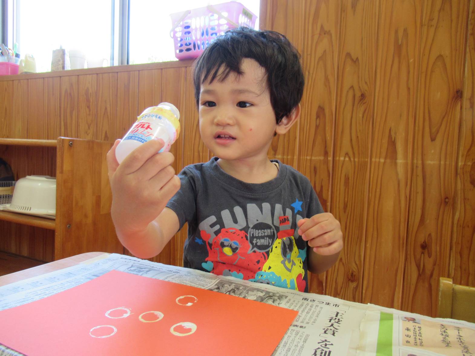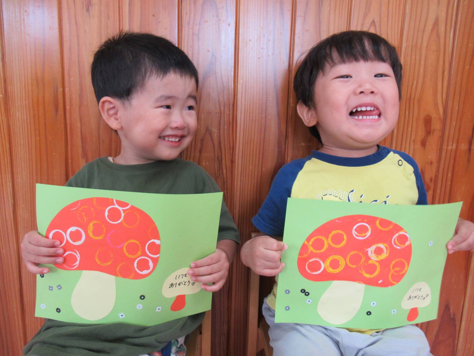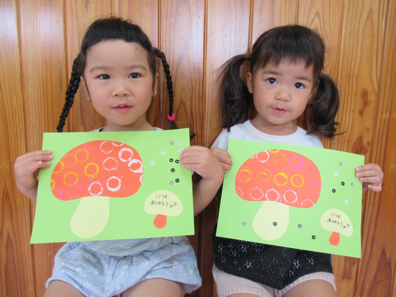 敬老の日の製作に向けて、きのこ製作をしました。 まず、ヤクルトの容器に絵の具を付けて、画用紙に「ぺったん!」と言いながら押し付けていきます。 「見て!丸になったよ!」、「丸がたくさん!」と丸の形ができると嬉しそうな子どもたち! 絵の具が乾くと、きのこの形に切り取り、かわいいきのこが完成しました! “おじいちゃん、おばあちゃん喜んでくれるかな~”と渡すことを楽しみにしているぱんだ組さんです。