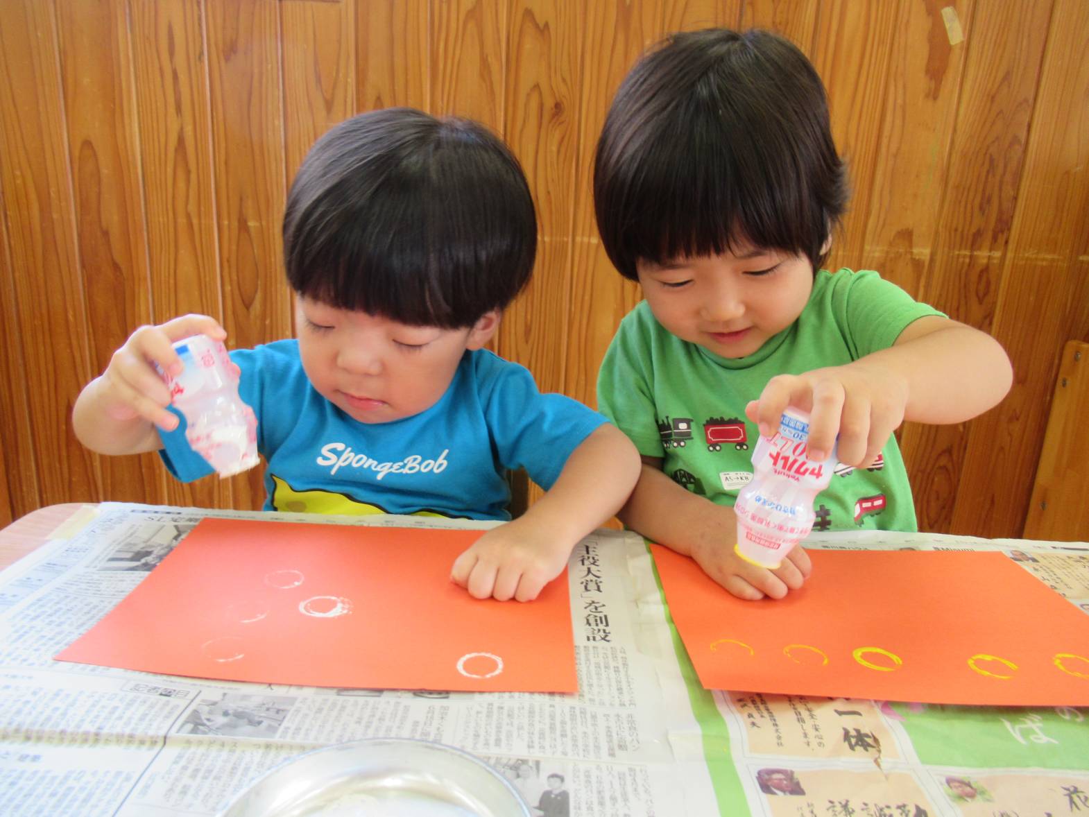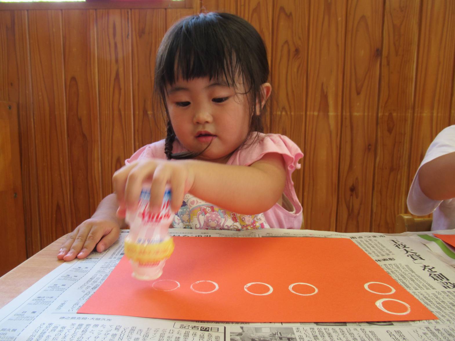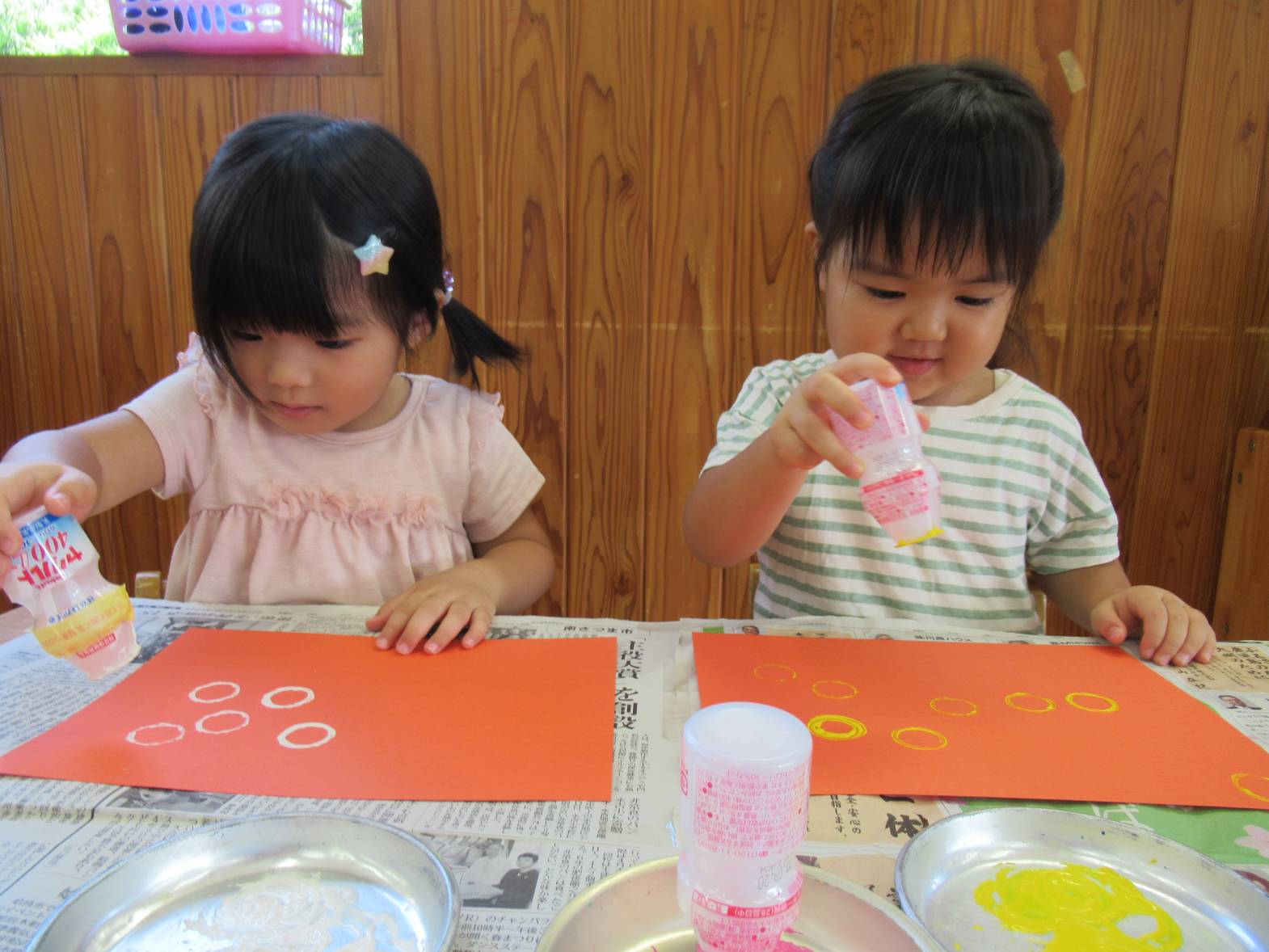 敬老の日の製作に向けて、きのこ製作をしました。 まず、ヤクルトの容器に絵の具を付けて、画用紙に「ぺったん!」と言いながら押し付けていきます。 「見て!丸になったよ!」、「丸がたくさん!」と丸の形ができると嬉しそうな子どもたち! 絵の具が乾くと、きのこの形に切り取り、かわいいきのこが完成しました! “おじいちゃん、おばあちゃん喜んでくれるかな~”と渡すことを楽しみにしているぱんだ組さんです。