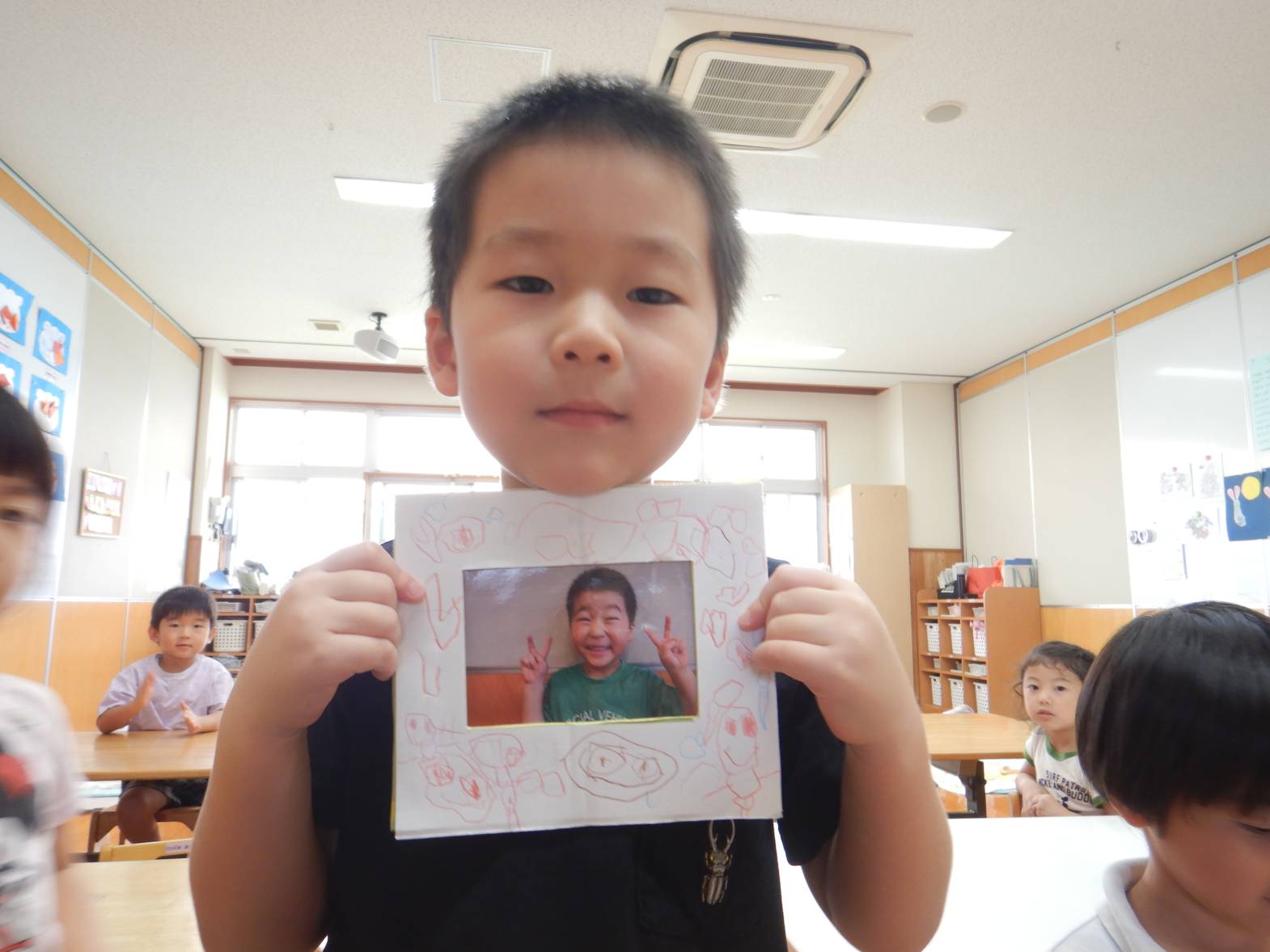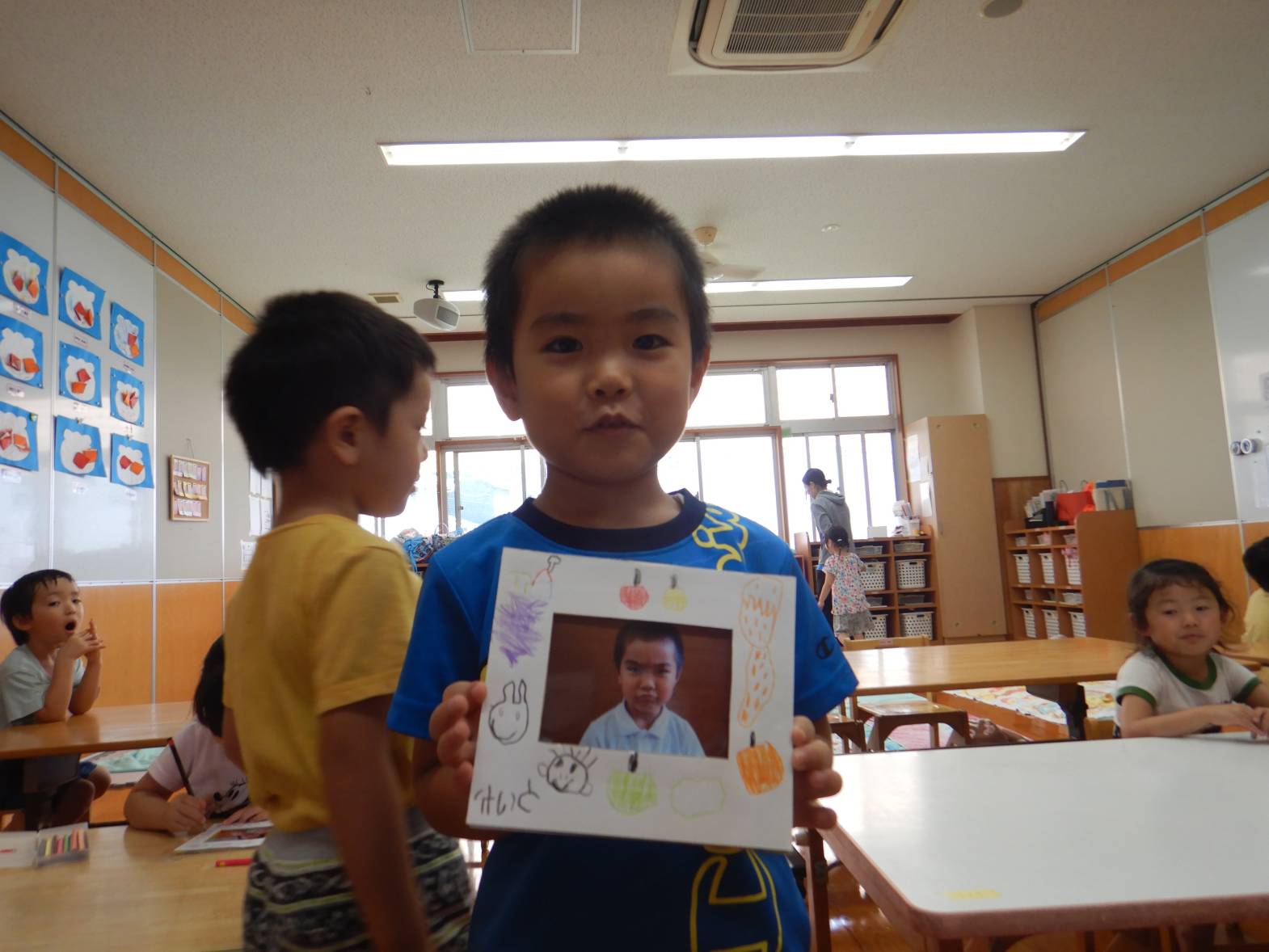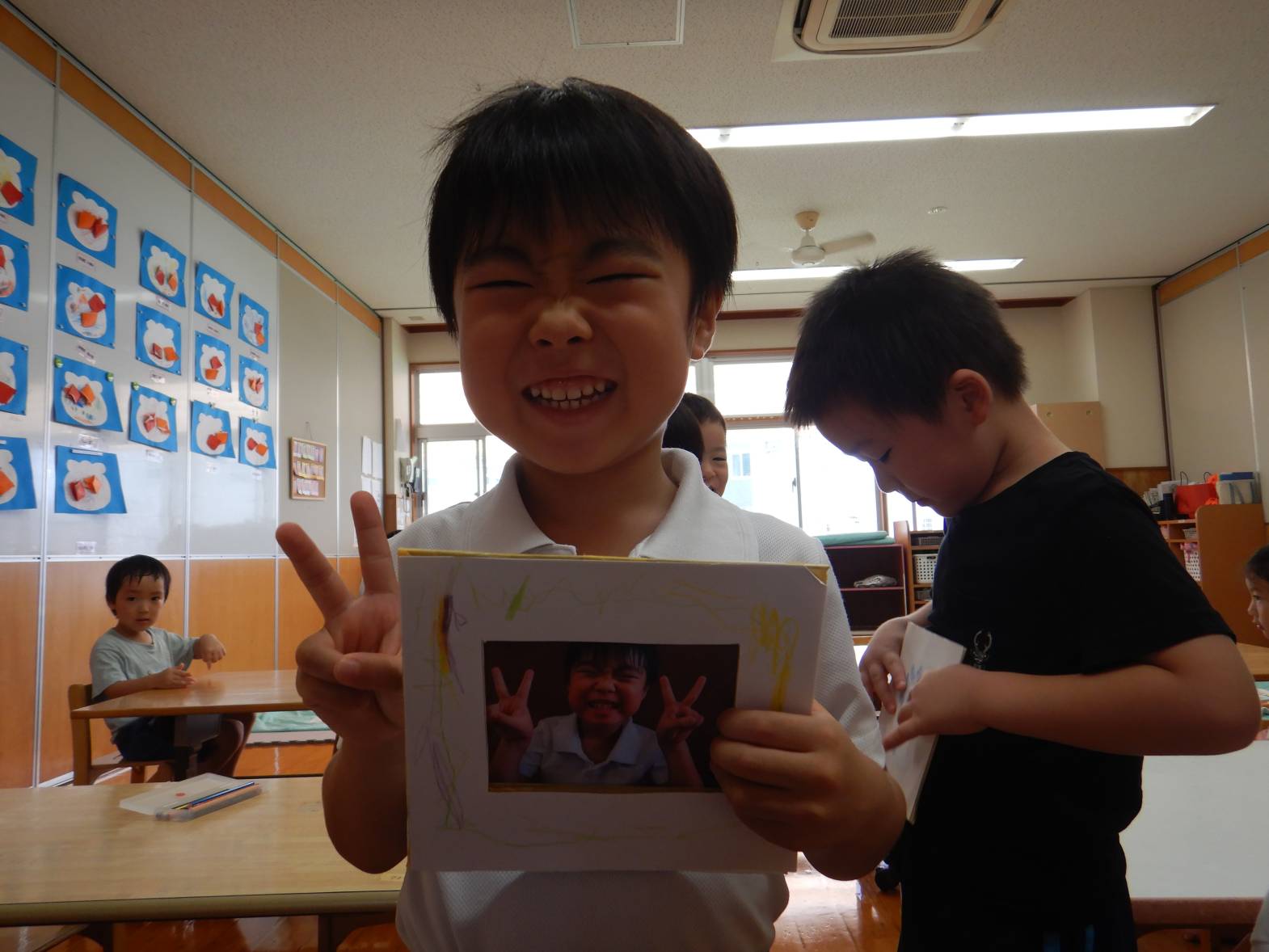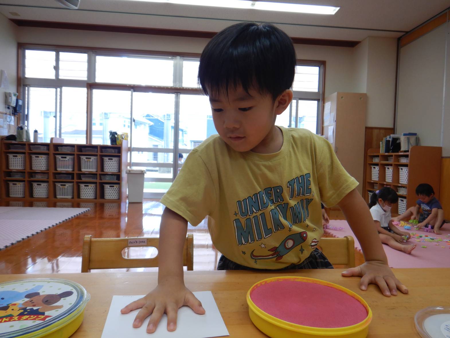 今日は敬老の日の製作をしました。 「おじいちゃんおばあちゃんにありがとうを言う日でしょ!」と教えてくれる子どもたち。 写真立てを作ると伝えると「作りたい!」と目をキラキラさせる子どもたち。 まずは自分の手にインクを付けて手形を取ります。 「手大きくなったかな?」と自分の手形を見つめる姿が見られました。 「かわいいのができたよ!」と完成した写真立てを見て喜ぶうさぎ組さんでした。