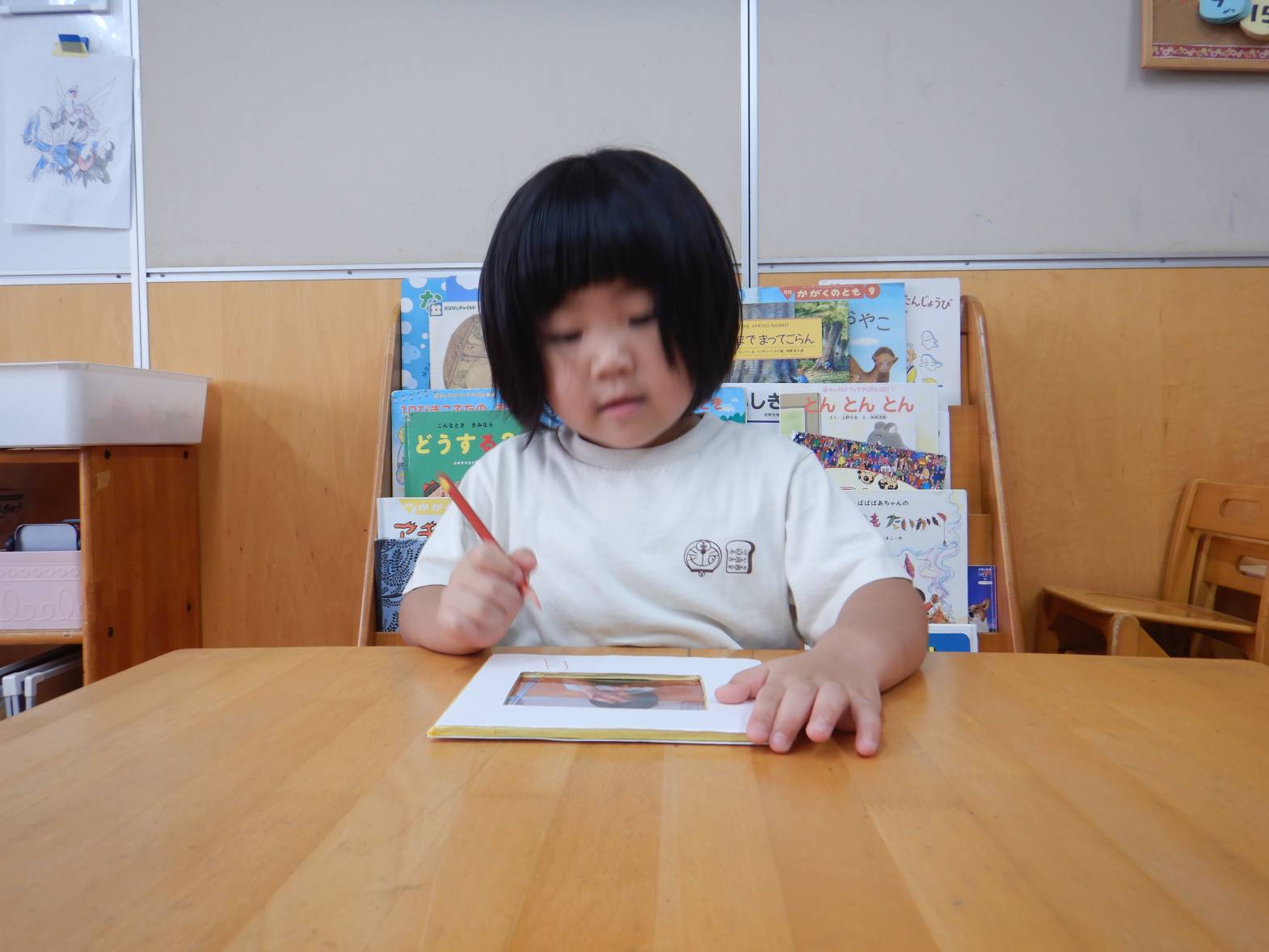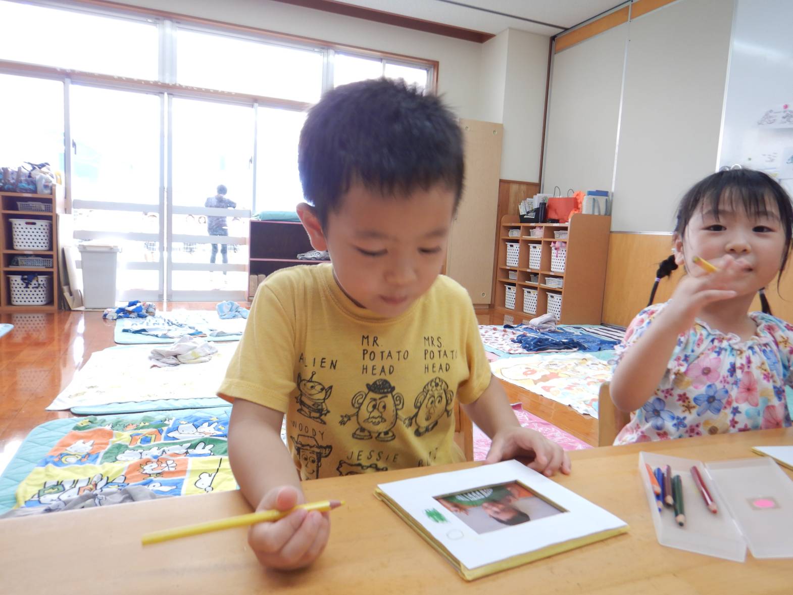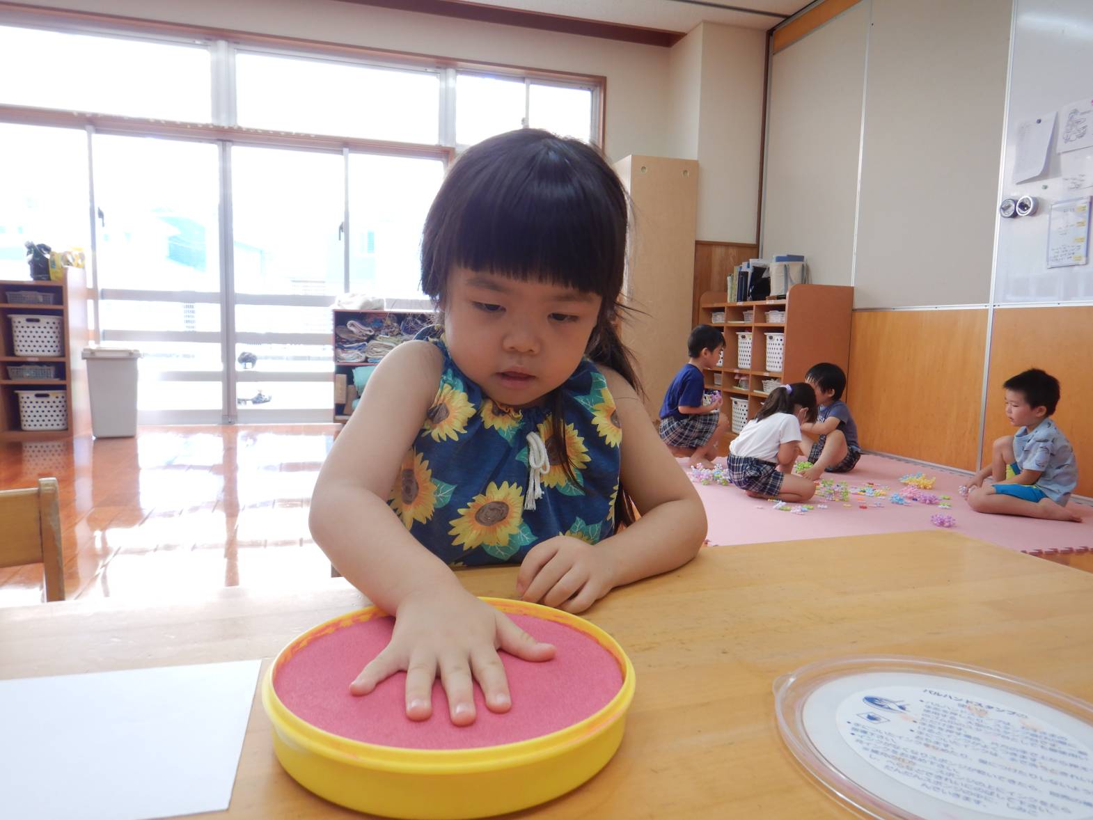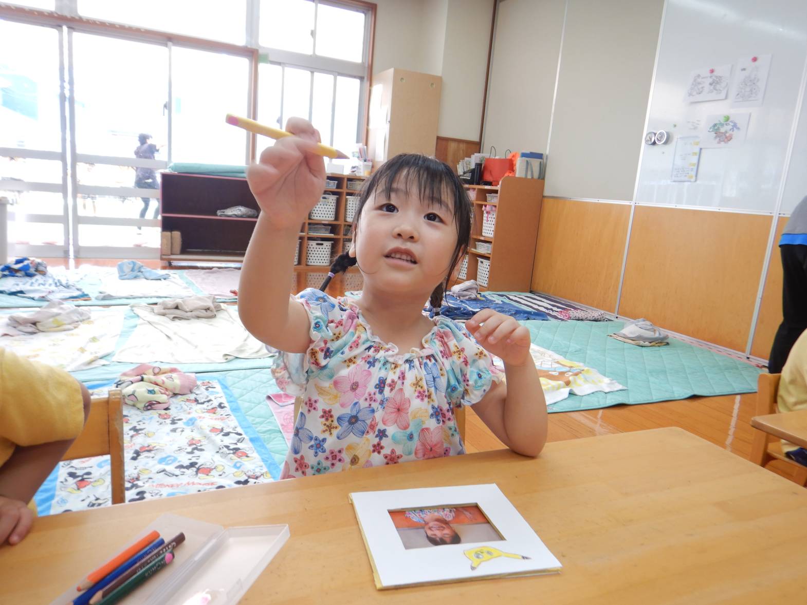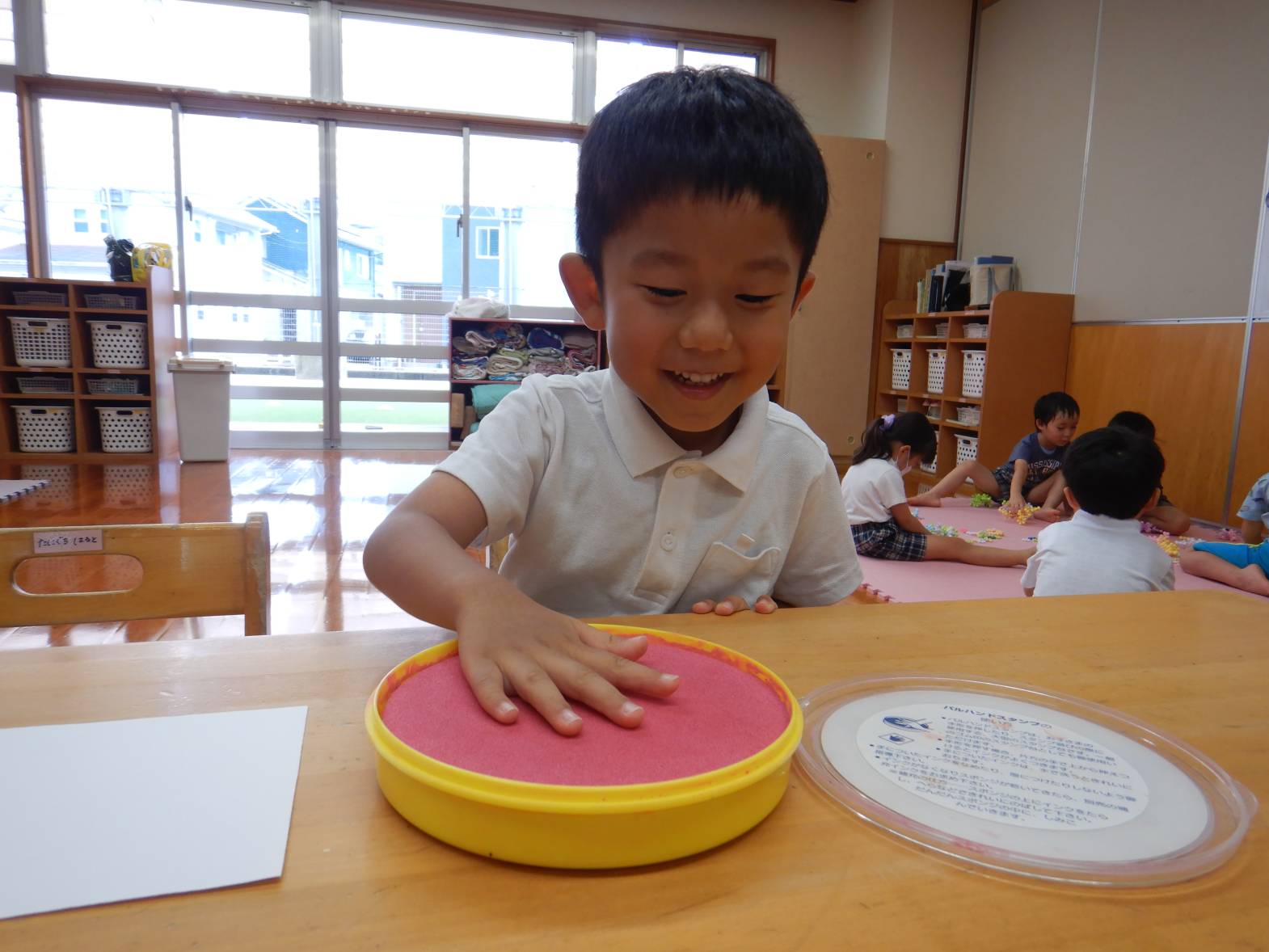 今日は敬老の日の製作をしました。 「おじいちゃんおばあちゃんにありがとうを言う日でしょ!」と教えてくれる子どもたち。 写真立てを作ると伝えると「作りたい!」と目をキラキラさせる子どもたち。 まずは自分の手にインクを付けて手形を取ります。 「手大きくなったかな?」と自分の手形を見つめる姿が見られました。 「かわいいのができたよ!」と完成した写真立てを見て喜ぶうさぎ組さんでした。