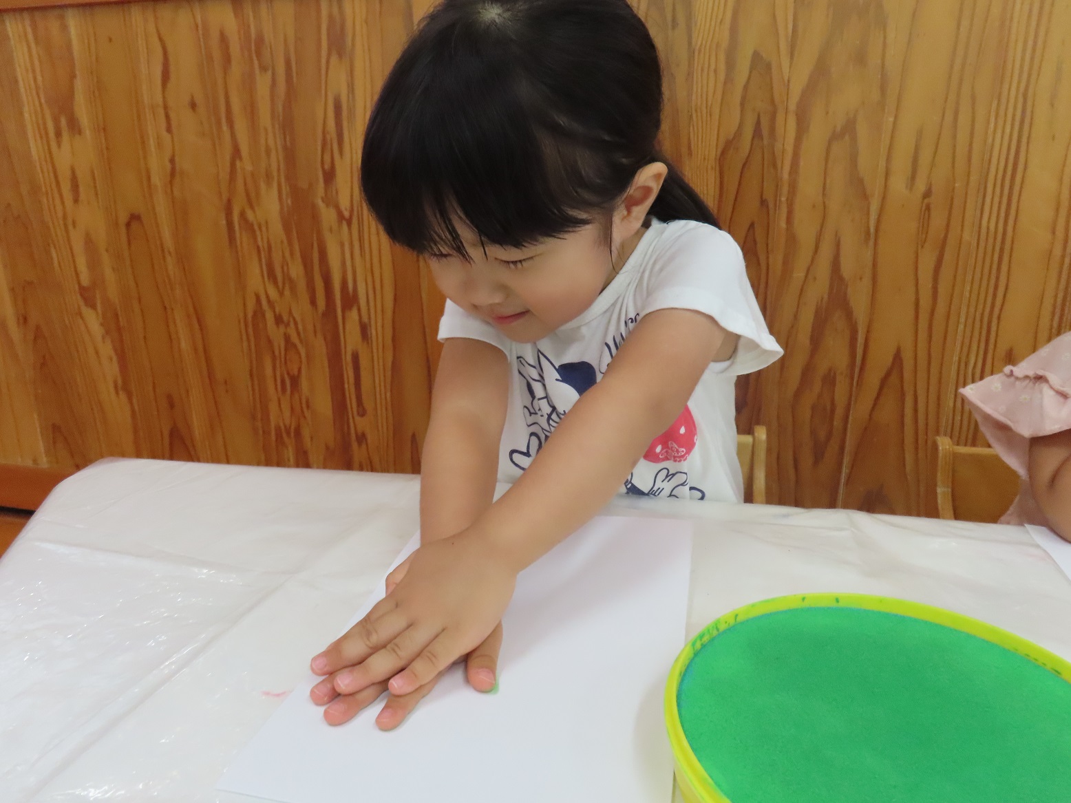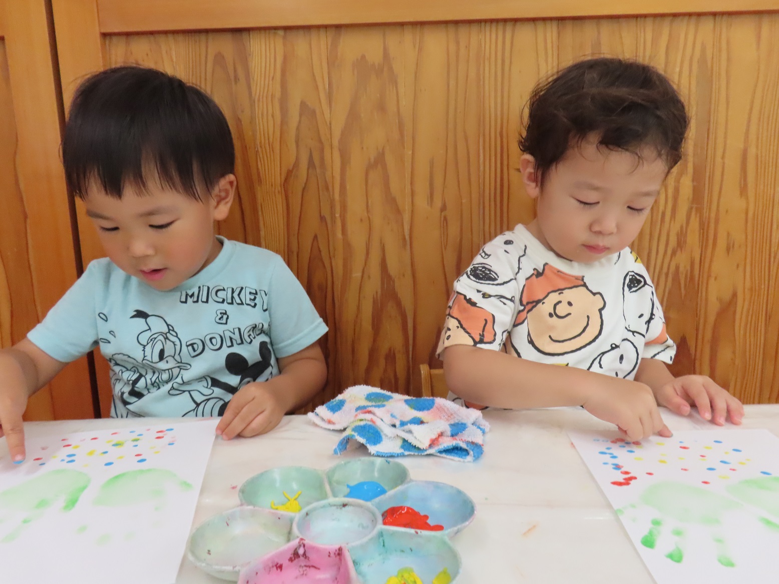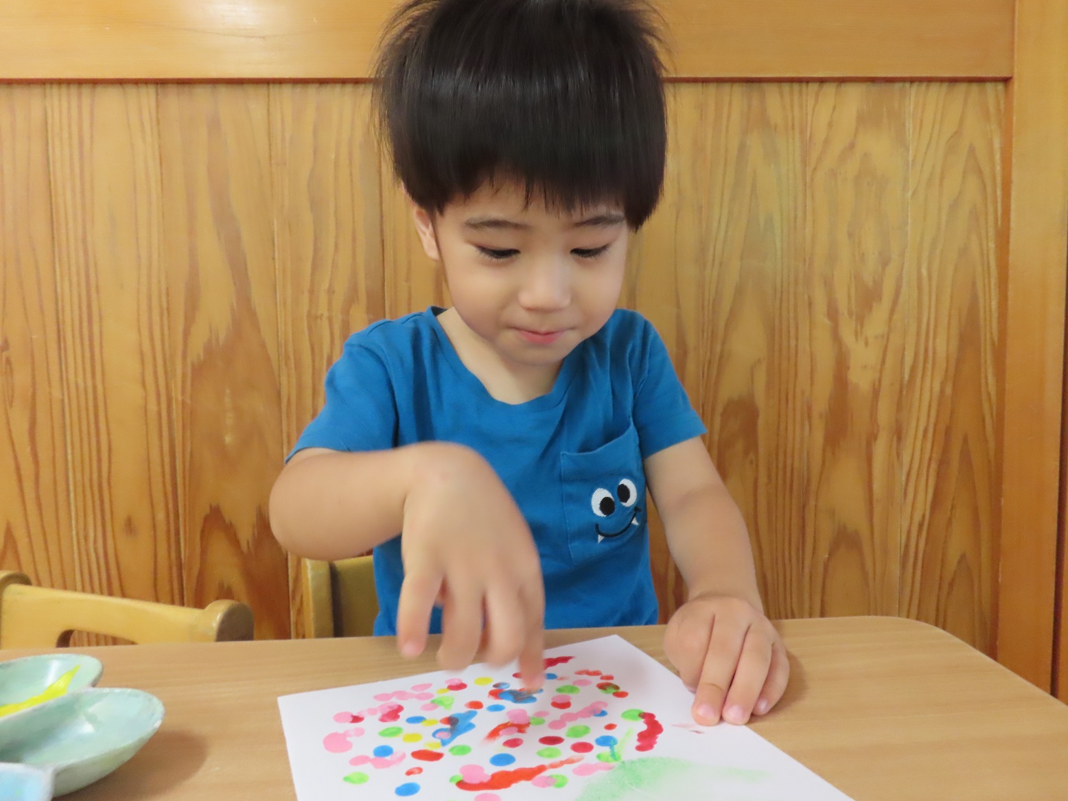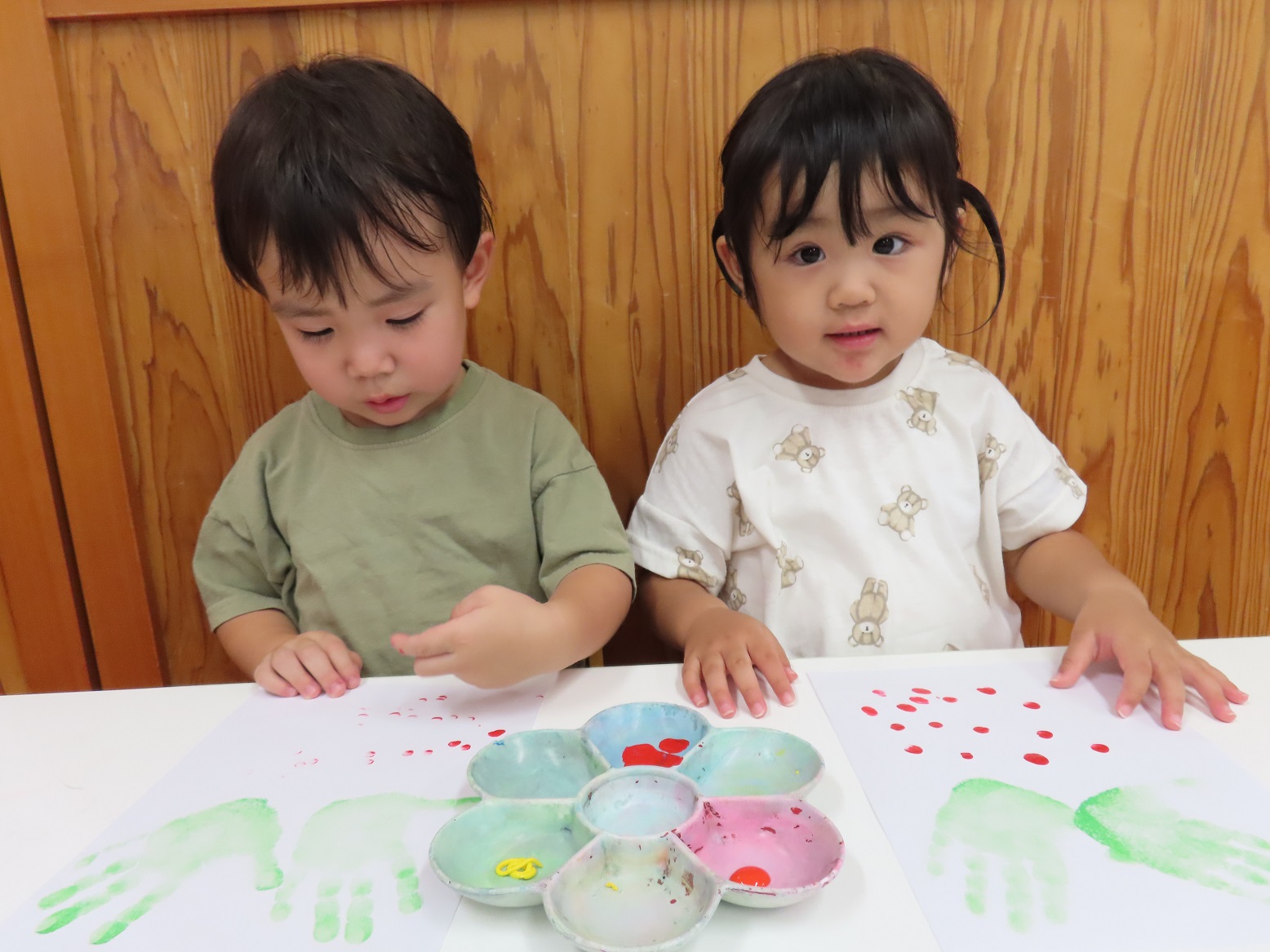 先週は、大好きなおじいちゃんおばあちゃんに「ありがとう」の気持ちを込めてプレゼントを作りました。 葉っぱとなる部分に手形スタンプを押したり、指スタンプでカラフルな花びらを作ったりしていきます。 「何色にしようかなぁ」「全部つけてもいい?」と、好きな色を選びながらスタンプを楽しむ子どもたち。 最後に、ニコニコ笑顔の写真を貼って、世界に1本だけの花が完成しました!