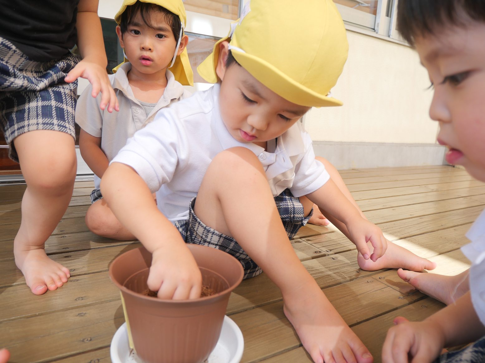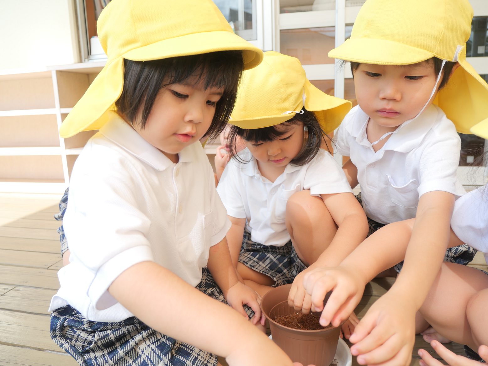 今日は、花の種まきを行った子どもたち。 石や土が鉢の中に入っていくと、「わあー!」「たくさん入っている。」と大興奮です。 その後の種まきでは、まず蒔き方を確認していきます。 「優しく入れるんだよね?」「大きくなってね。」と、声を掛けながら入れていました。 また、友だち同士で種の植える場所をアドバイスし合う姿も見られます。 「もうちょっとこっちがいいかな?」「ここに入れてみたらいいかも。」とグループの子たちと話しながら、種まきを行ったりす組さんです。