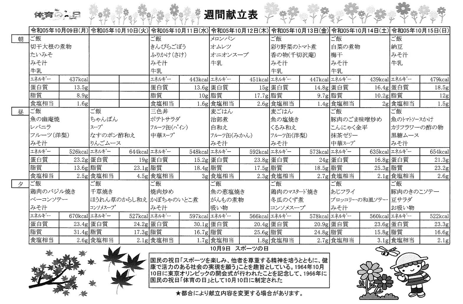 10月9日(月)~10月15日(日)の献立表になります。是非ご覧ください。