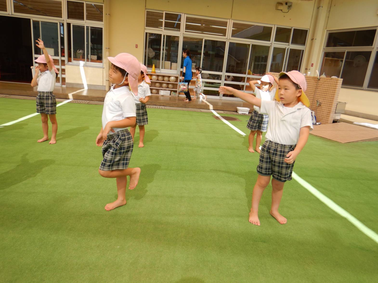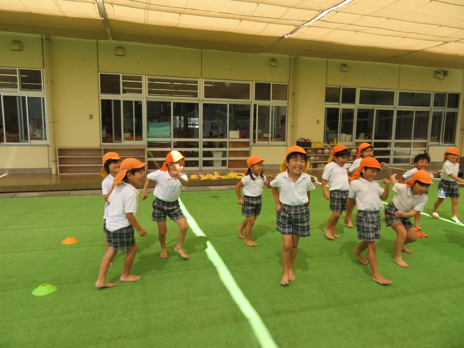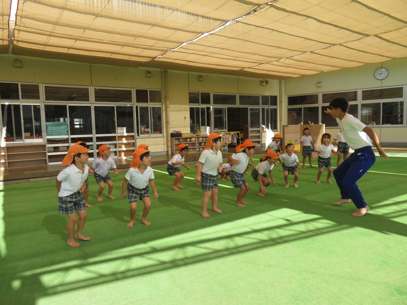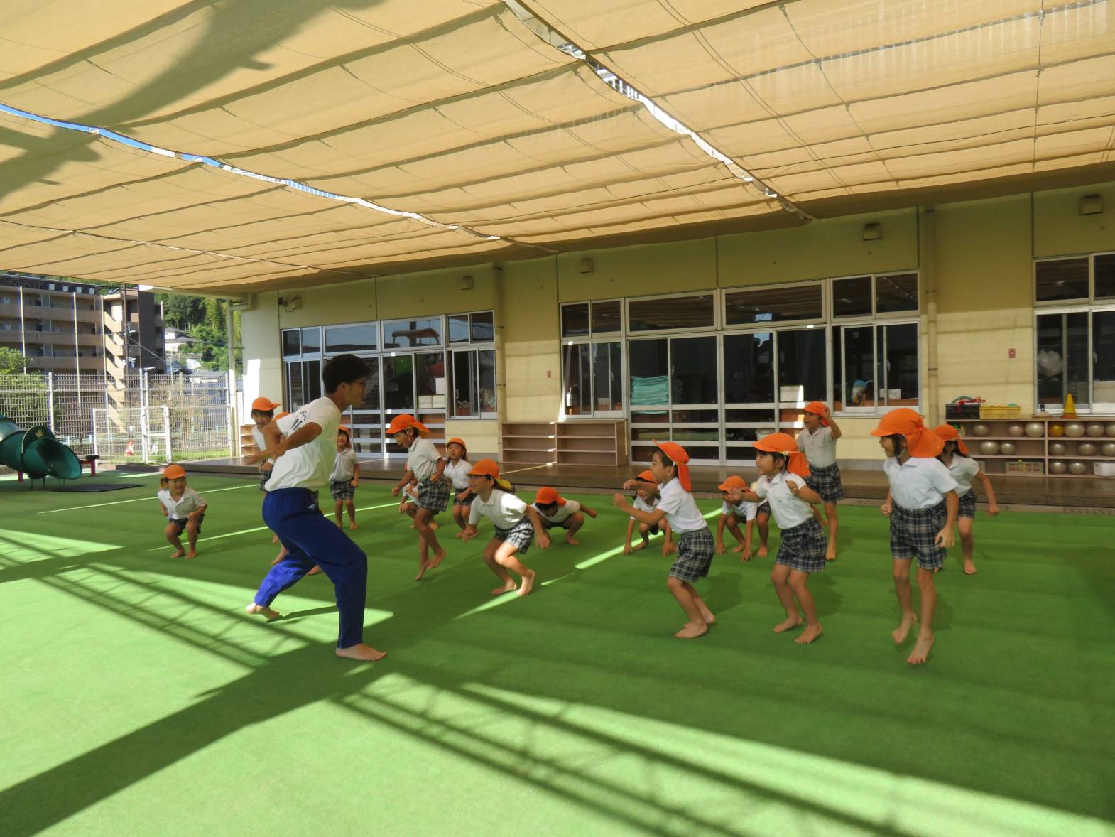 始めの準備体操では、忍者ジャンプやグーパージャンプという新しいジャンプに大盛り上がりの子どもたち。