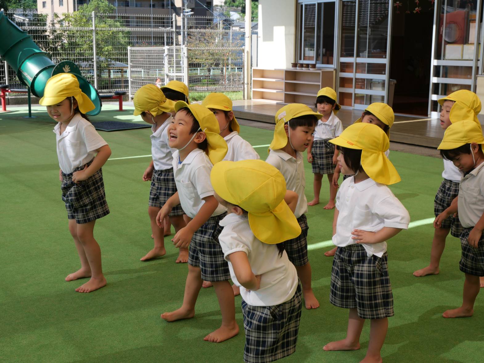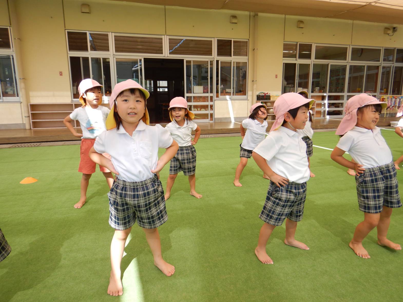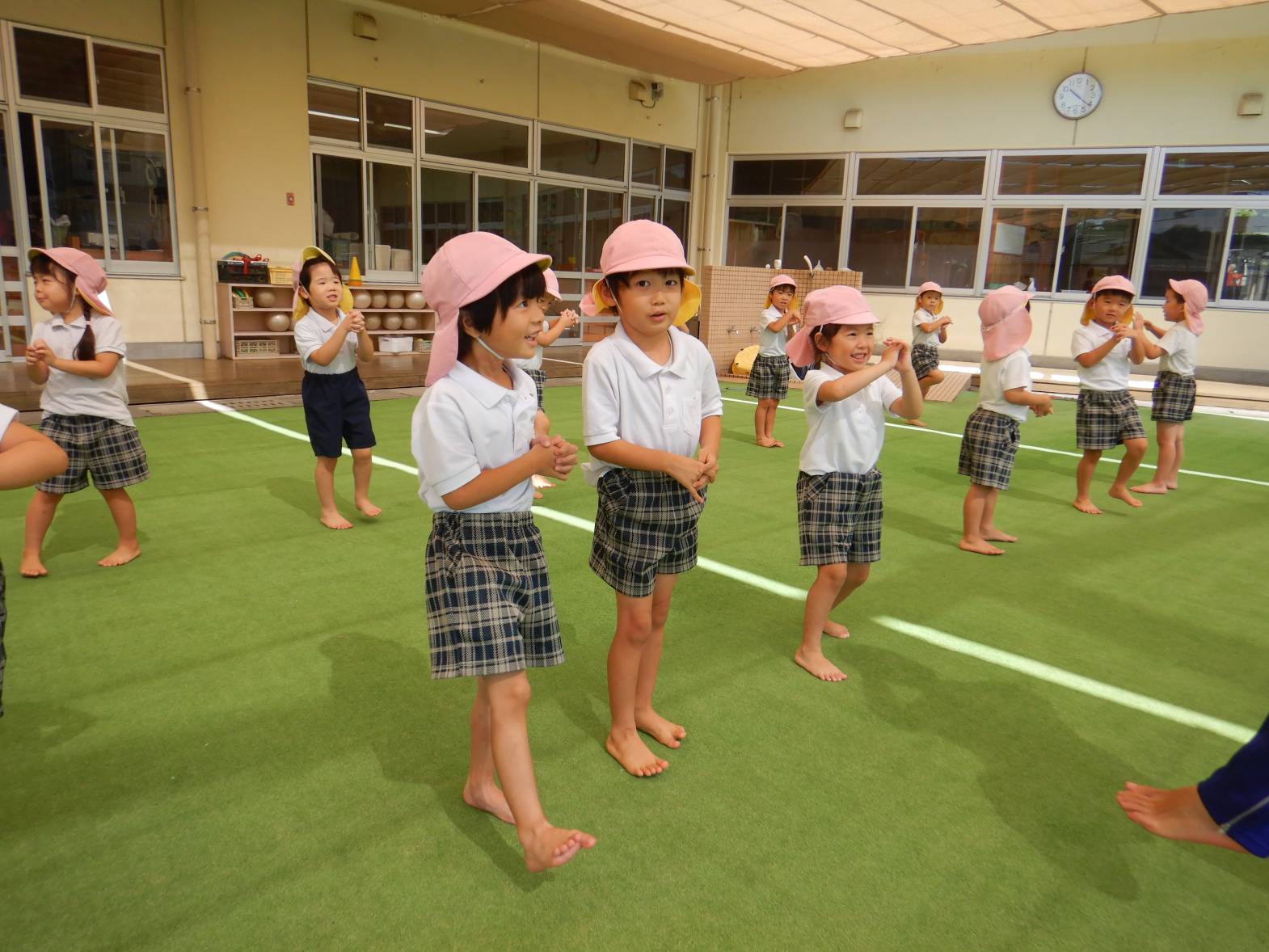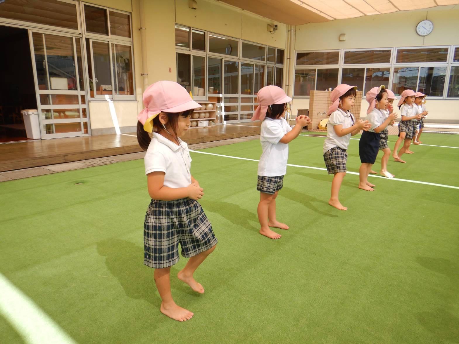 始めの準備体操では、忍者ジャンプやグーパージャンプという新しいジャンプに大盛り上がりの子どもたち。