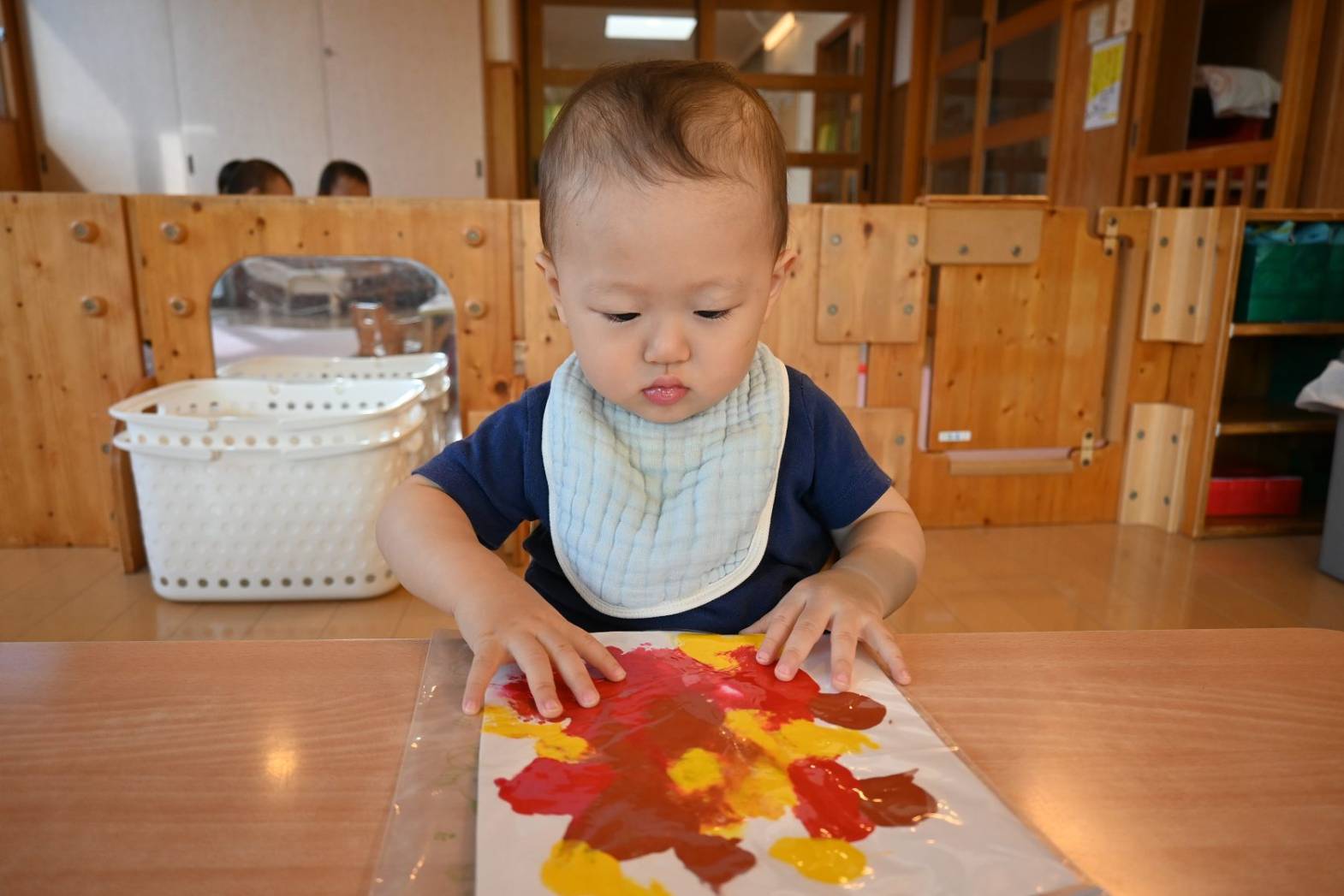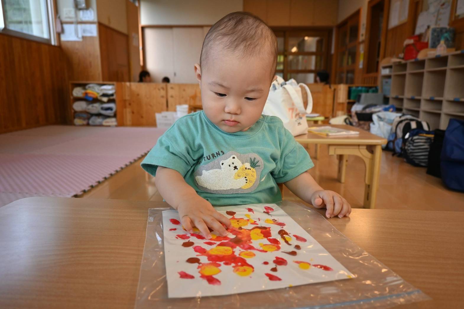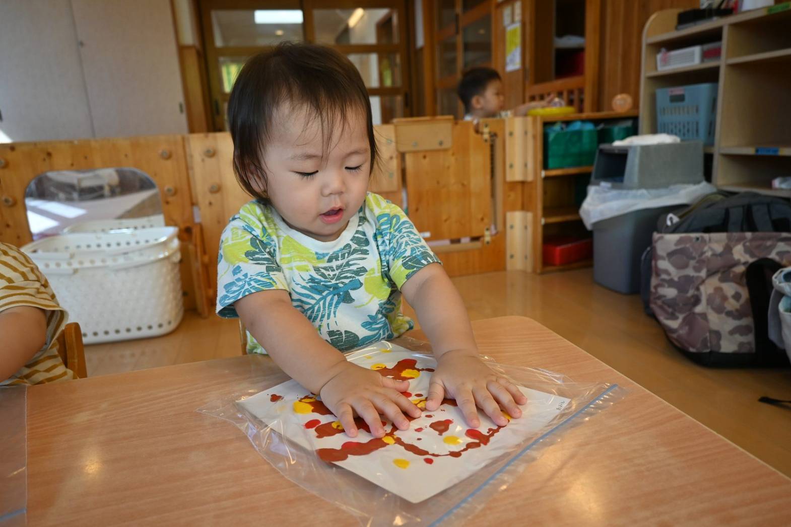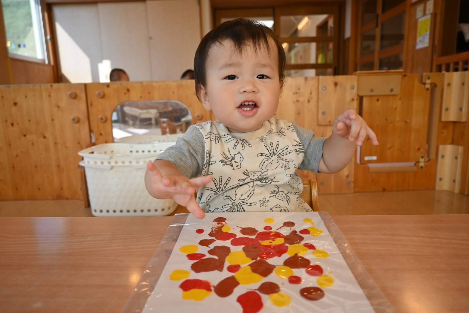 9月の製作は落ち葉作りをしました。 画用紙につけた絵の具を袋の上から触り、広げていきます。 始めは慎重に手を乗せる様子がありましたが、慣れてくると指でつんつんしたり、手のひらで叩いたりと思い思いに感触を楽しむひよこ組さん。 上手に絵具を広げ、綺麗な落ち葉を完成させることができました。