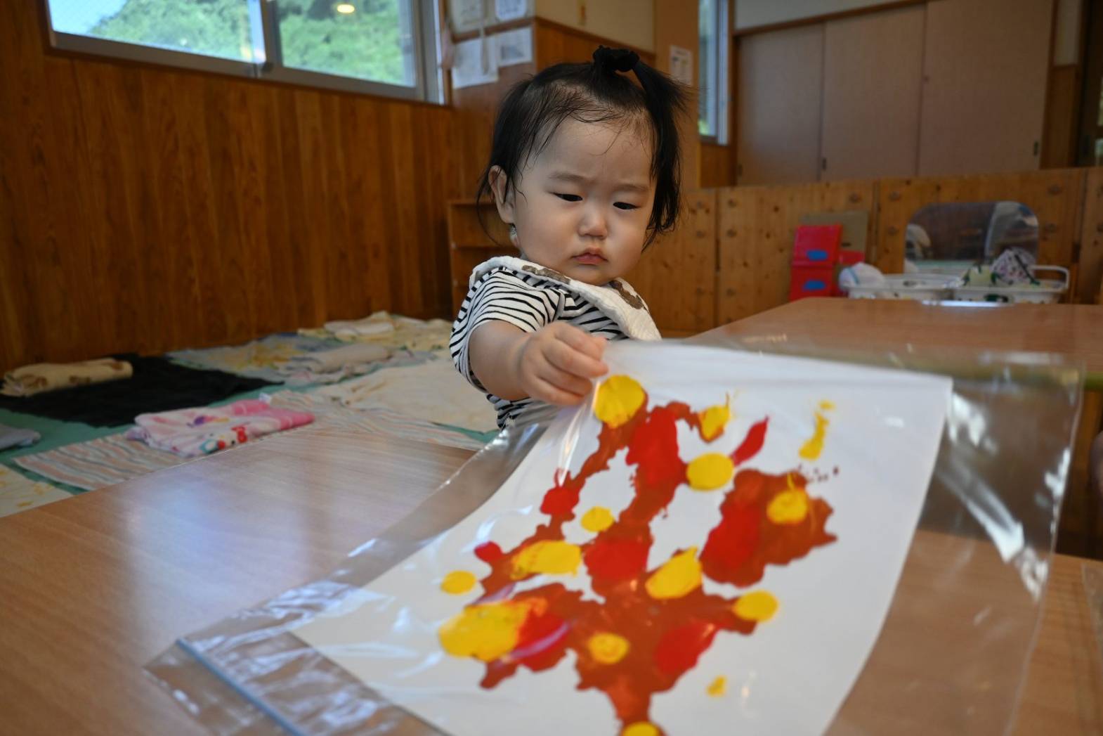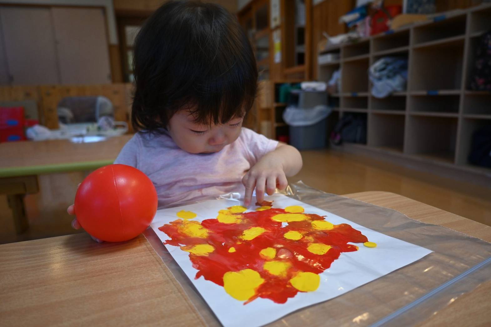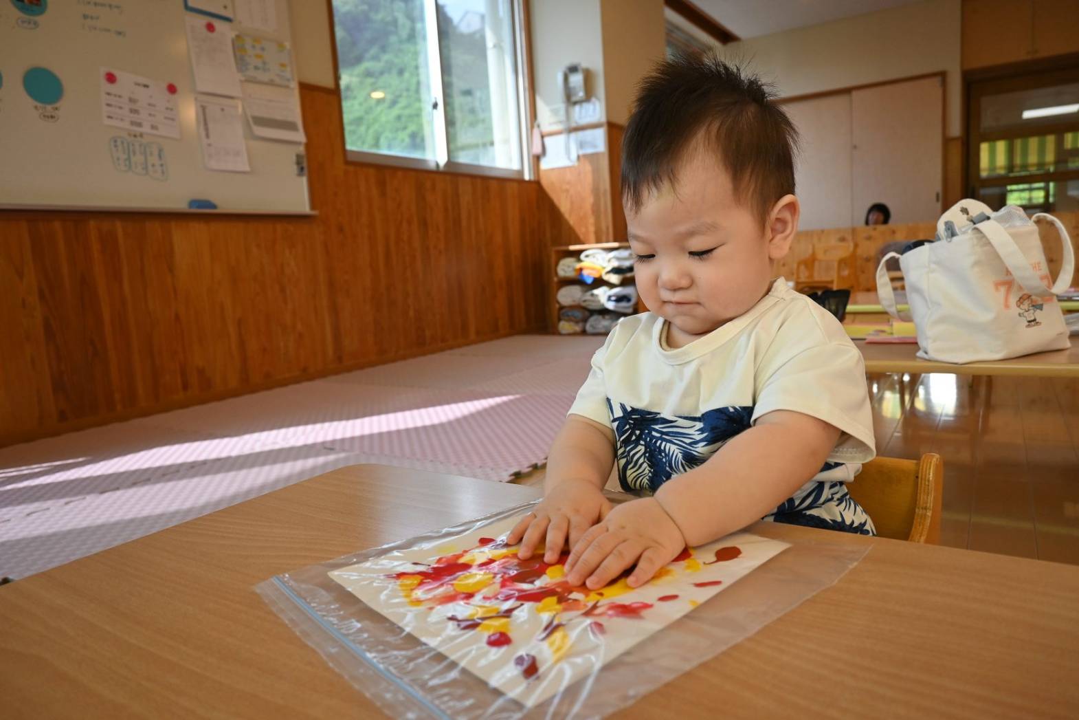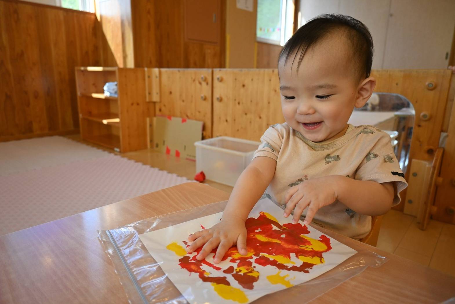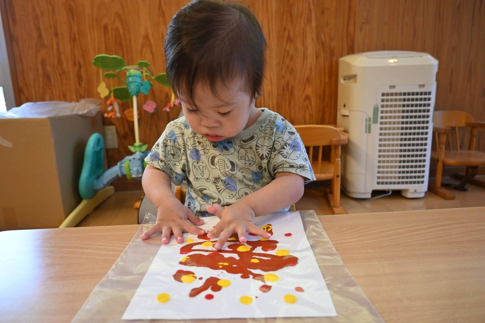 9月の製作は落ち葉作りをしました。 画用紙につけた絵の具を袋の上から触り、広げていきます。 始めは慎重に手を乗せる様子がありましたが、慣れてくると指でつんつんしたり、手のひらで叩いたりと思い思いに感触を楽しむひよこ組さん。 上手に絵具を広げ、綺麗な落ち葉を完成させることができました。