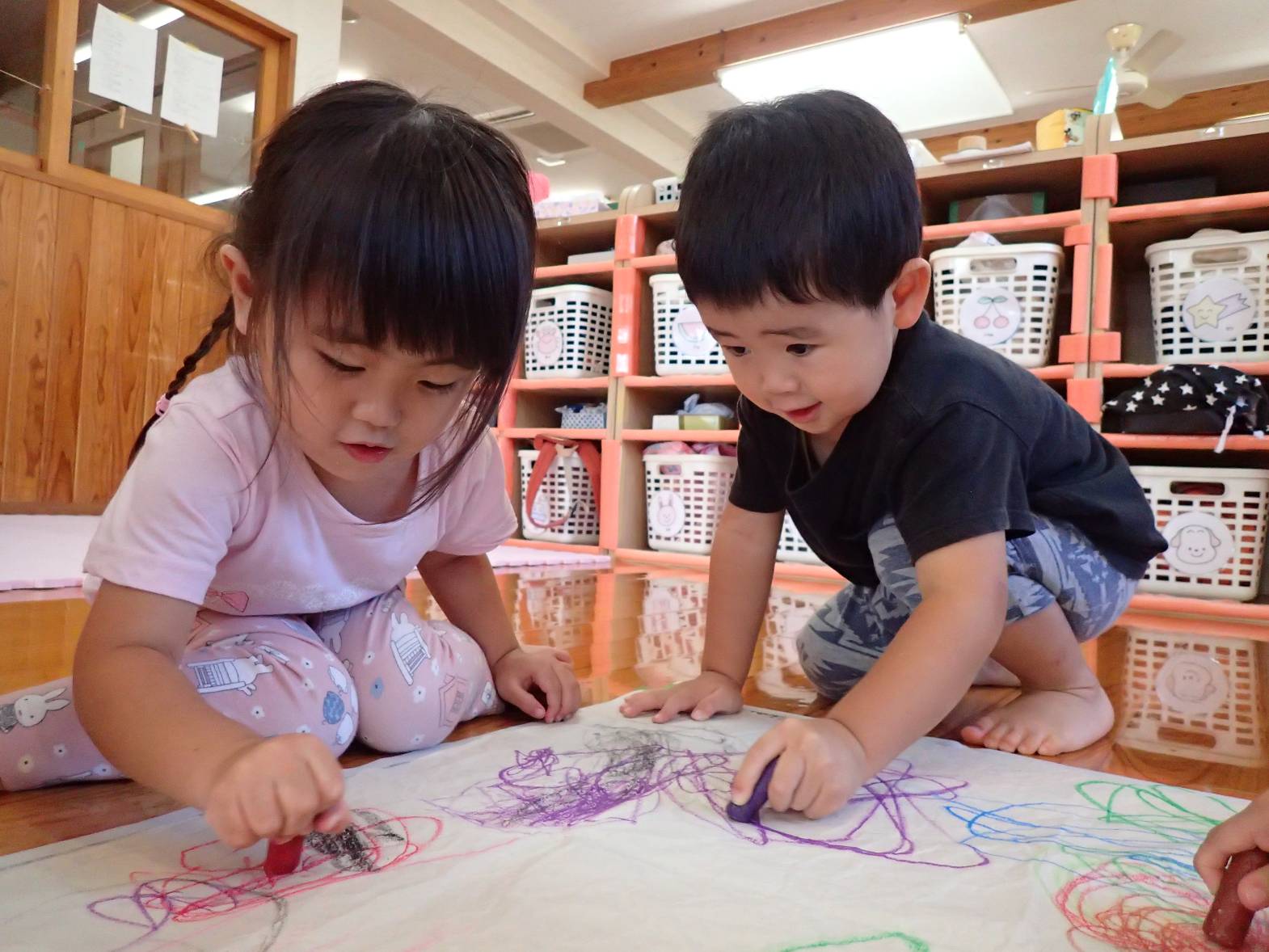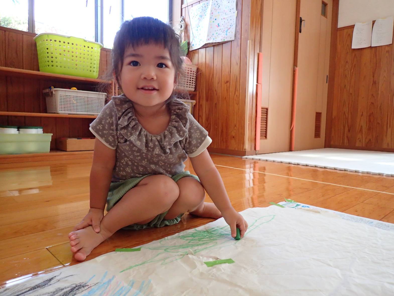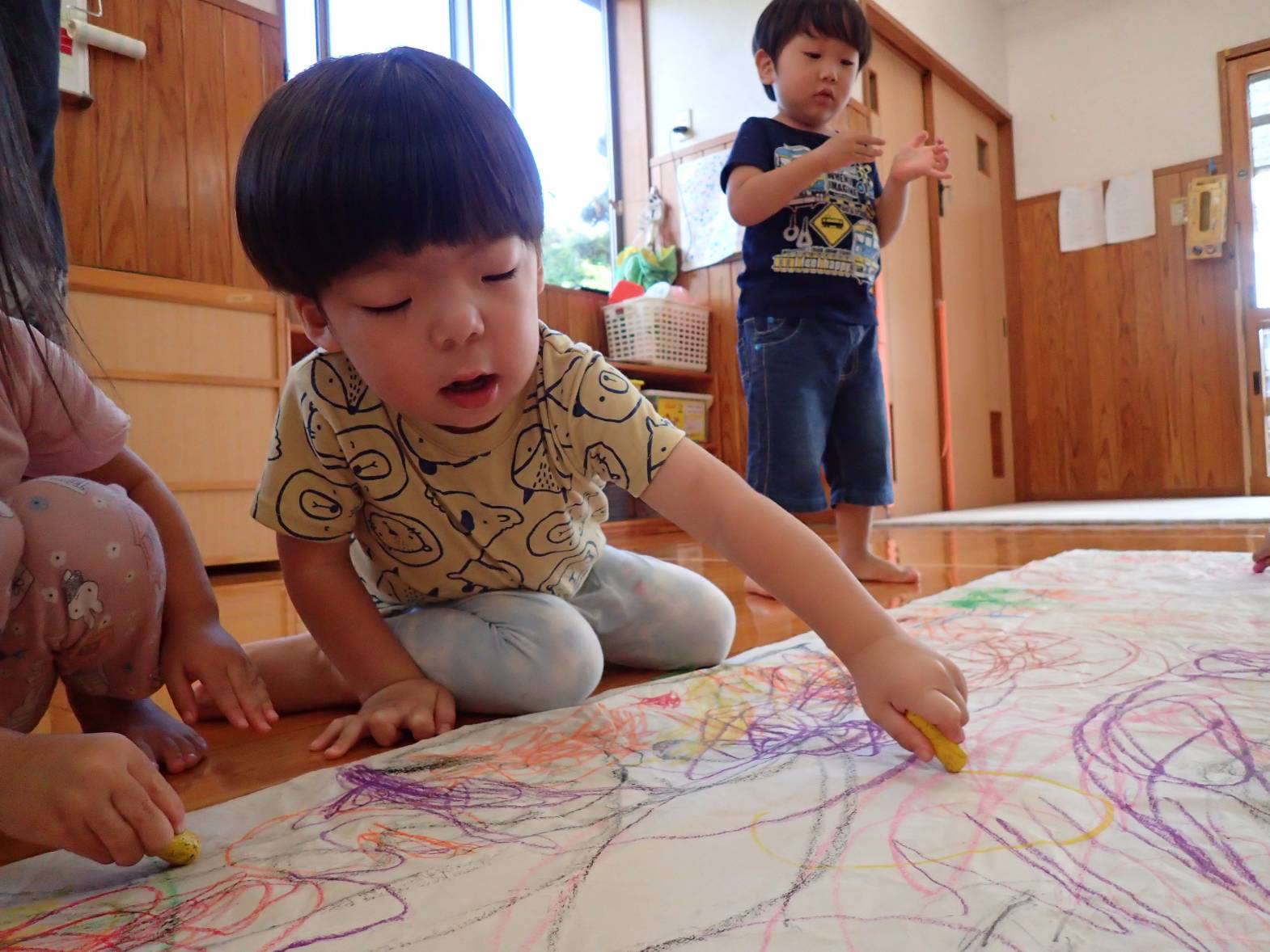 室内にて大きな紙を広げ、絵描きをしました。 クレヨンを握ると、「ぐるぐる~!」と紙いっぱいに描いていく子どもたち。 色を重ねていくことを楽しんだり、「見て!アンパンマン描いた!」とキャラクターを描いてみたりと思い思いにクレヨンを走らせる姿が見られます。 「これは何色?」、「これは赤だよ!」と色にも興味を持つぱんだ組さんでした。